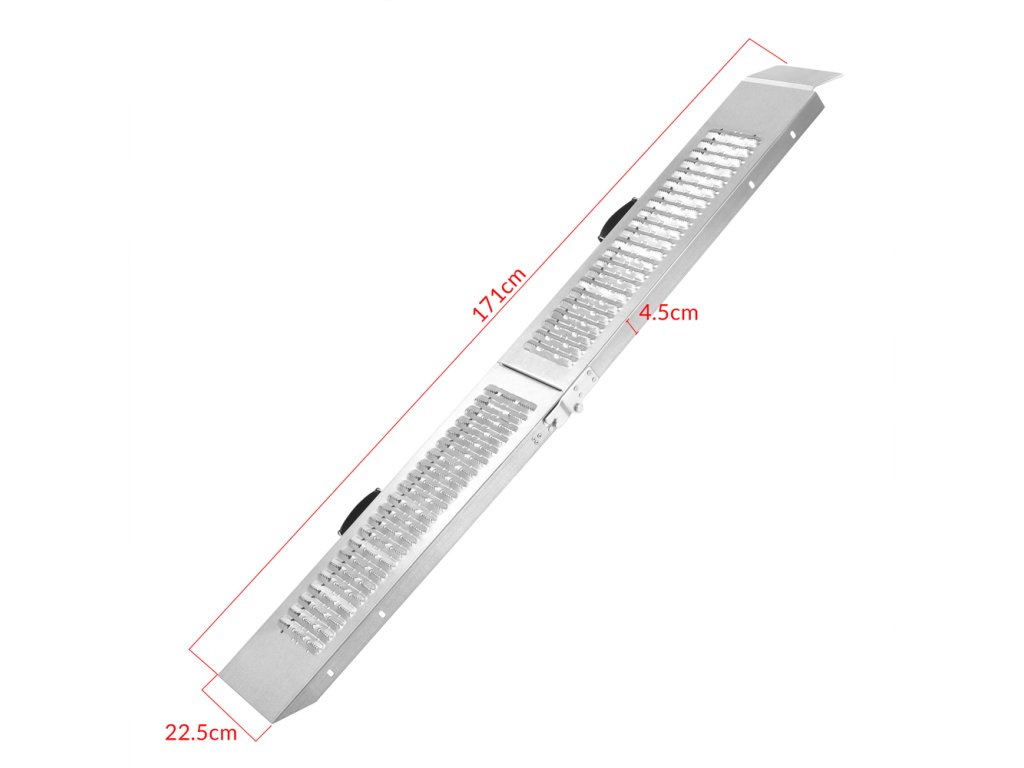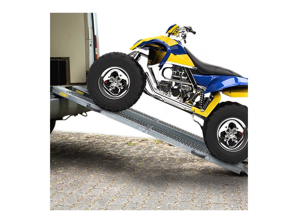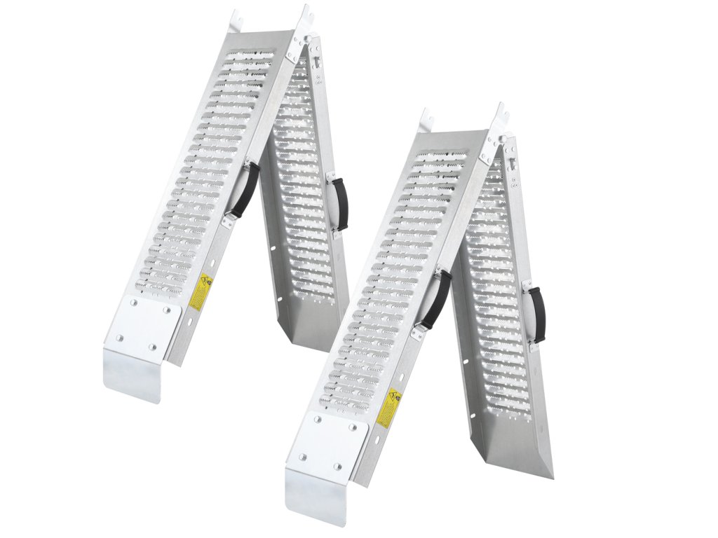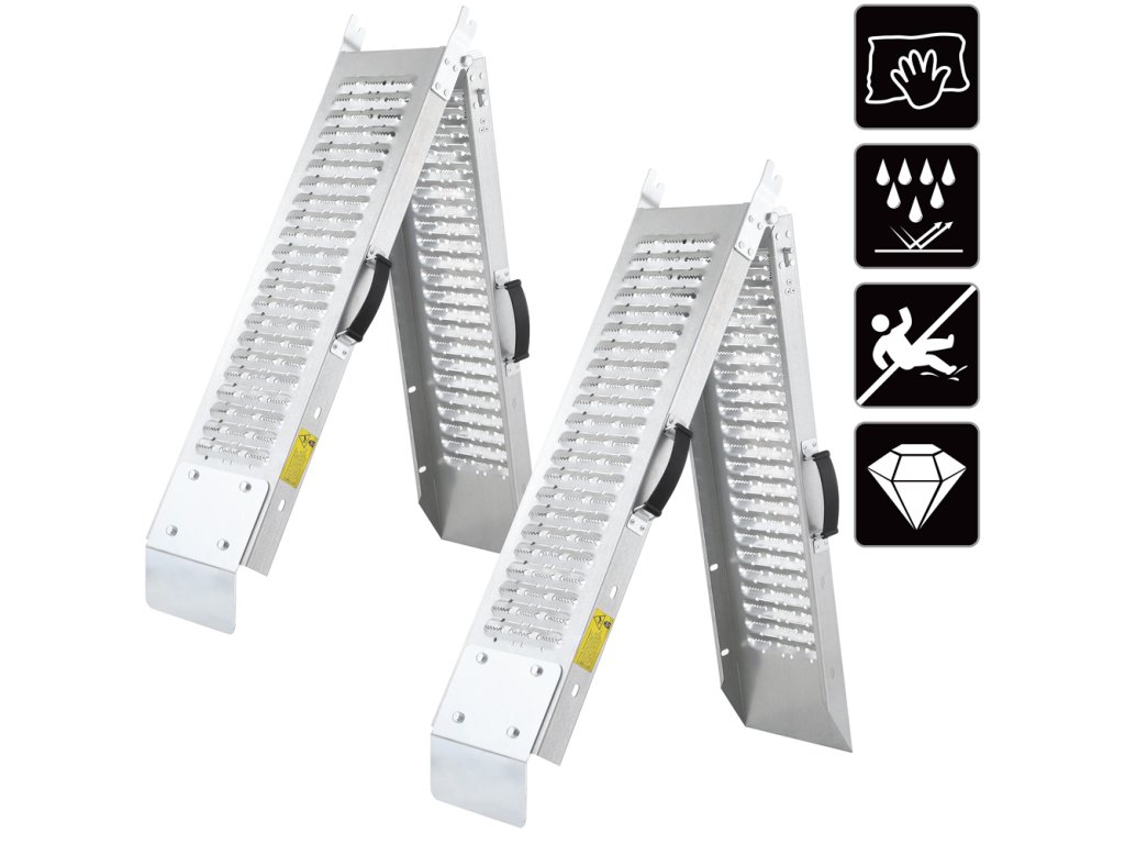 Kvalitné nájazdové rampy sú dodávané v praktickej sade 2 ks a pomáhajú s jednoduchým nakladaním motocyklov, mopedov, štvorkoliek, malých vozidiel, záhradných traktorov, stavebných strojov atď. Skladacia rampa s pohodlnou rukoväťou sa ľahko prepravuje a vďaka malým skladacím rozmerom sa dá zložiť, aby sa ušetrilo miesto. S vlastnou hmotnosťou iba 7,5 kg je možné rampu ľahko prepravovať. Nosné konce nájazdovej rampy sú vybavené skosenou nosnou plochou, ktorá poskytuje dostatok stability a zabraňuje skĺznutiu. Protišmykový a perforovaný povrch udrží vaše vozidlo stabilné pri nakladaní a vykladaní. S maximálnou nosnosťou 200 kg je nájazdová rampa použiteľná aj pre ťažké vozidlá.