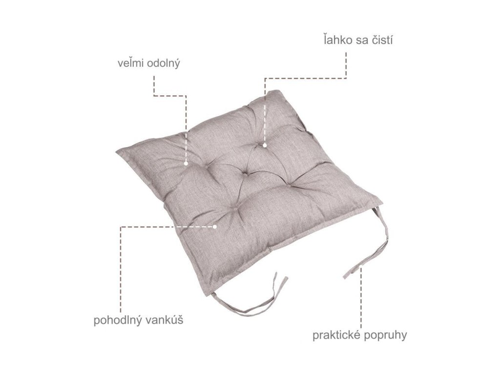 Pohodlné podušky na stoličky sú vyrobené z vysoko kvalitného odolného polyesteru a sú ideálne na dlhodobé používanie vonku alebo vnútri. Špeciálny visco efekt a hrúbka výplne 8 cm zaisťuje dokonalý komfort sedenia. Mäkká membrána z dutého vlákna povolí, keď si sadnete na podušku. Visco efekt spôsobí, že sa poduška vráti do pôvodného tvaru, keď vstanete. Vďaka optimálnym rozmerom sa podušky zmestia na všetky štandardné stoličky. Vďaka popruhom pripevneným na boku možno ľahko zabrániť nepríjemnému šmýkaniu podušky. Poťahy s jednoduchou údržbou sú vodoodpudivé, takže náhodne rozliate tekutiny možno utrieť bez zanechania zvyškov. Moderné farby s nadčasovým prešívaním sa postarajú o skvelý doplnok v záhrade, na terase alebo v obývačke.