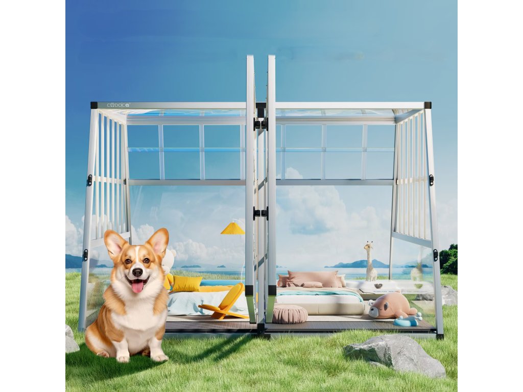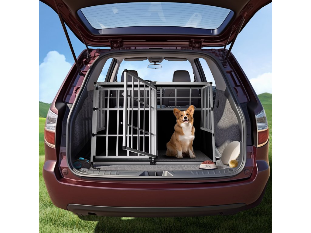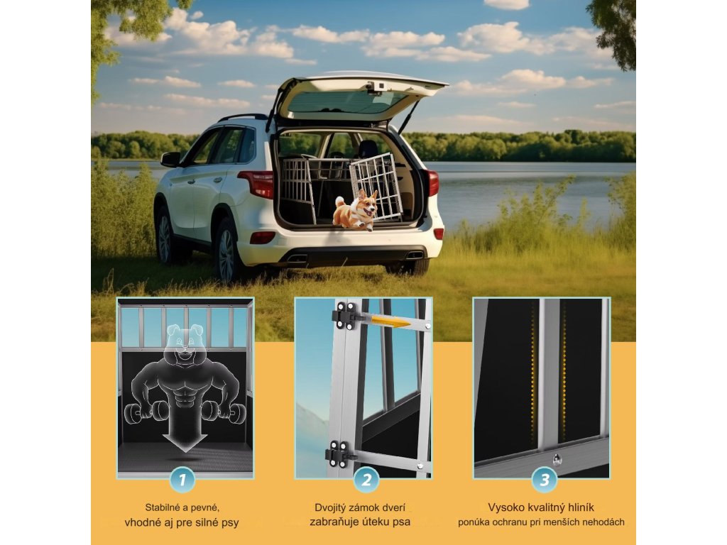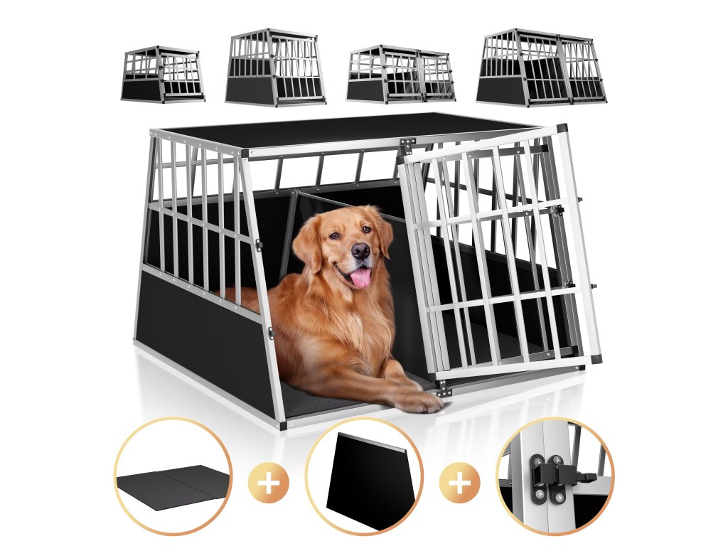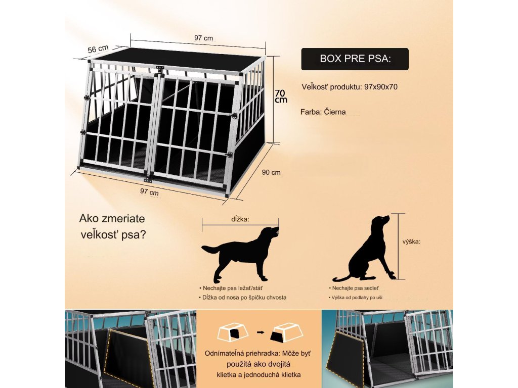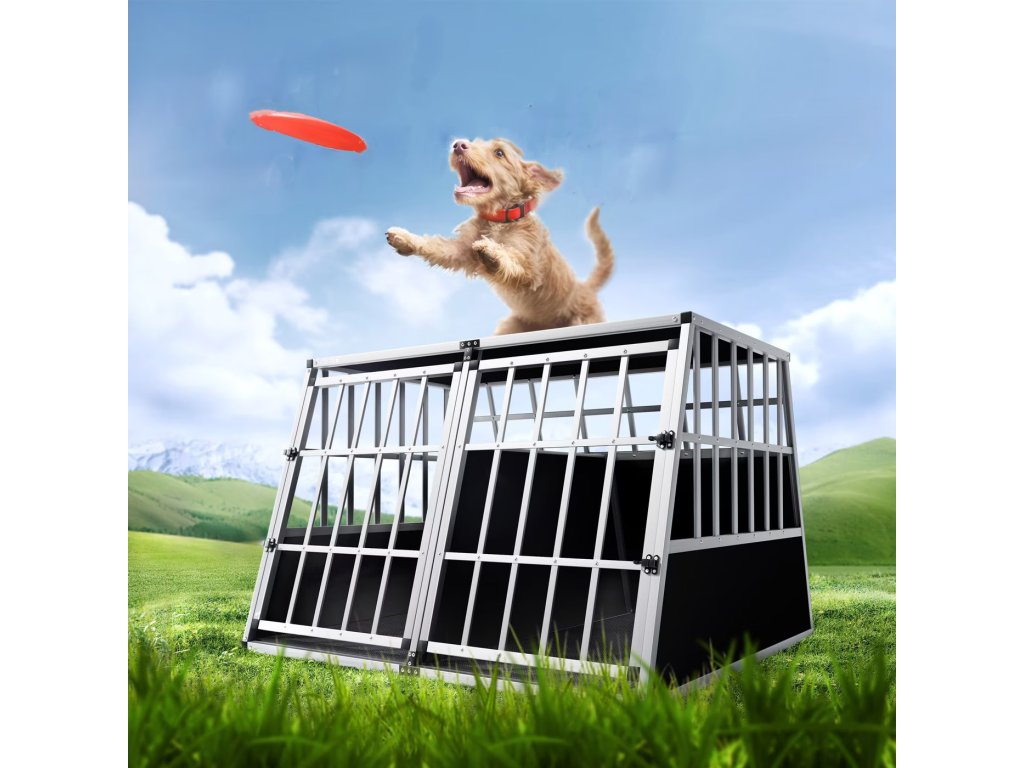Vďaka konštrukcii v tvare lichobežníka je prepravka jednoducho umiestniteľná. Robustné plastové rohy zároveň znižujú riziko zranenia psa alebo poškodenia pri manipulácii s prepravkou. Táto prepravka, vyrobená z odolného hliníka a MDF dosiek, sa vyznačuje pevnou stavbou a jednoduchou montážou. Na údržbu postačí vlhká handrička, čím sa jej čistenie stáva rýchlym a pohodlným. Prepravka pre psa je vybavená odnímateľnou priečkou a 2 uzamykateľnými dverami. To znamená, že je vhodná buď pre 2 menšie psy alebo pre jedného veľkého psa. Vďaka mriežkovým vzperám má váš pes neustály prísun čerstvého vzduchu, čo mu poskytne vyšší komfort a pocit bezpečia.