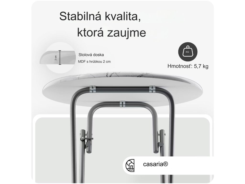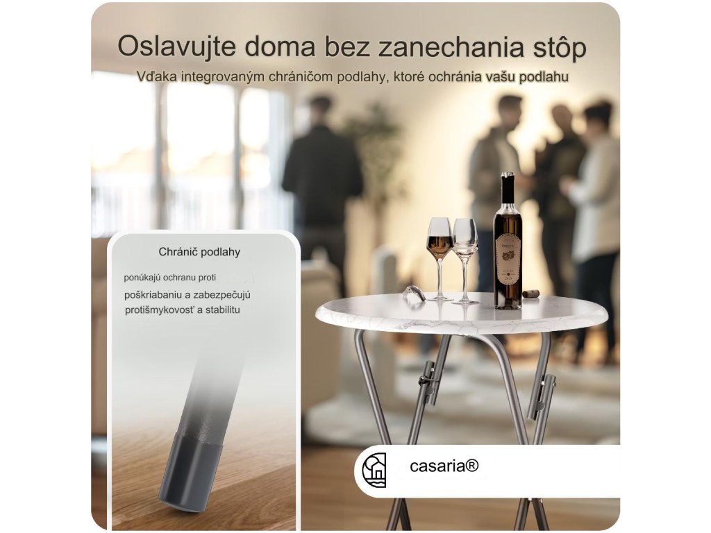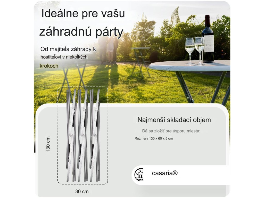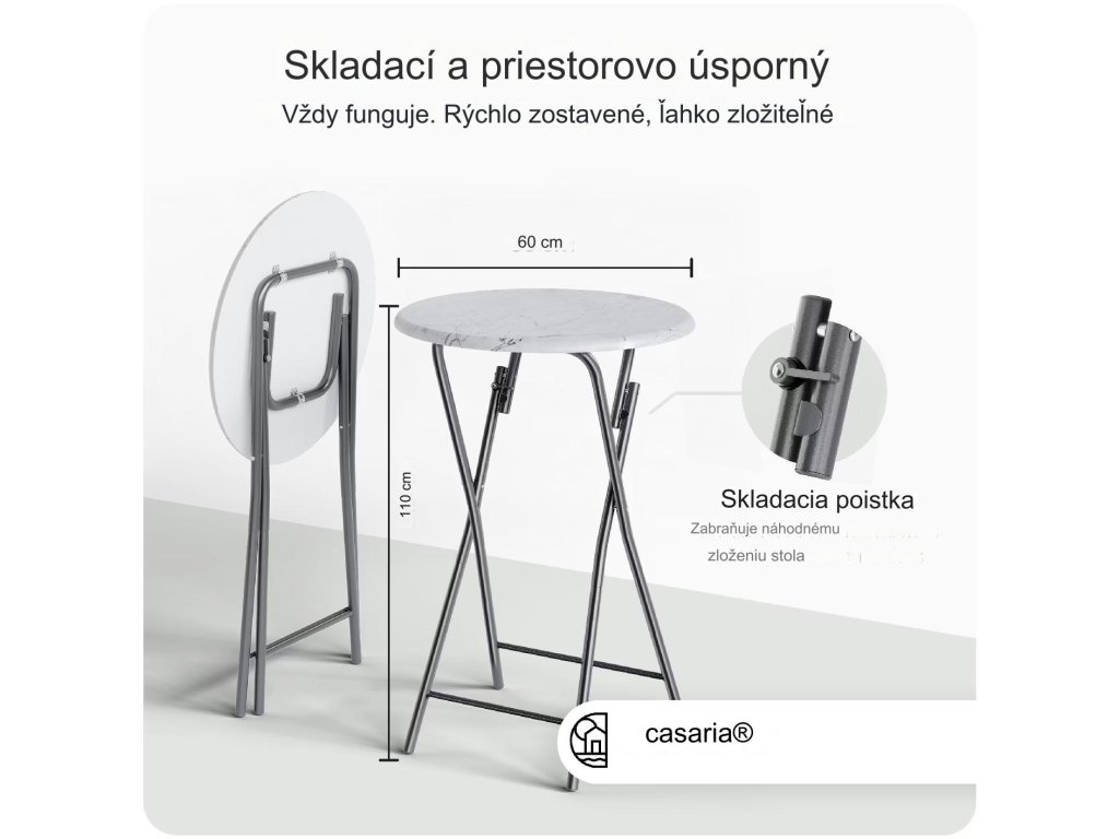 Skladací barový stôl je ideálny pre všetky druhy špeciálnych príležitostí. Doska stola je vyrobená z MDF v mramorovom vzhľade a ľahko sa udržiava. V niekoľkých jednoduchých krokoch možno stôl rýchlo zložiť alebo rozložiť a uložiť tak, aby sa ušetrilo miesto. Vďaka protišmykovým plastovým nožičkám môžete barový stôl používať v interiéri aj exteriéri. Sklopná poistka zaisťuje barový stôl proti samovoľnému zloženiu.