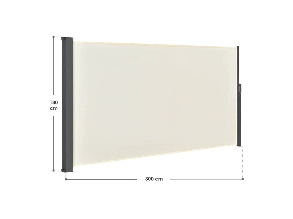 Pretože je bočná markíza zvinutá v kazete, môžete látku jednoducho vytiahnuť na vami zvolenú dĺžku. Máte možnosť prispôsobiť svoju markízu svojim individuálnym potrebám, aby bola vaša terasa alebo záhrada chránená pred slnkom a vetrom. Celkovo má moderná priečka výšku 1,80 m a maximálnu dĺžku 3 m.