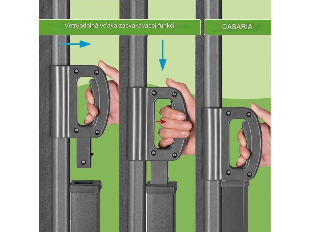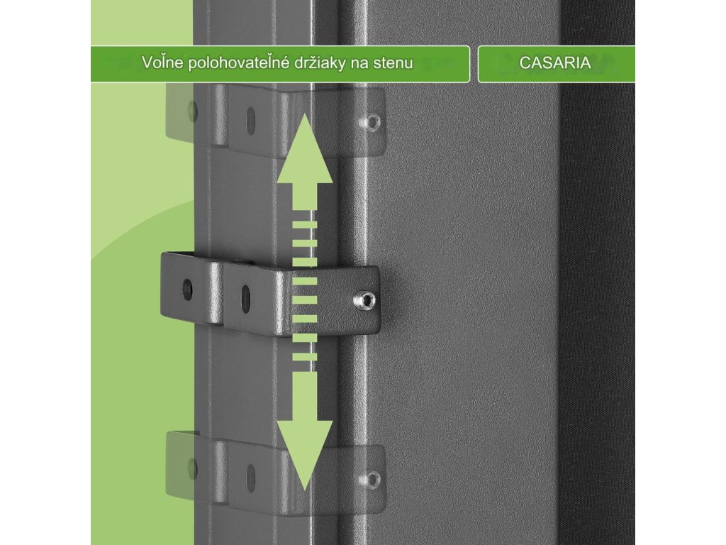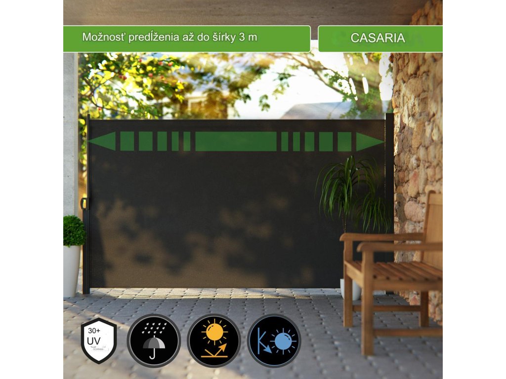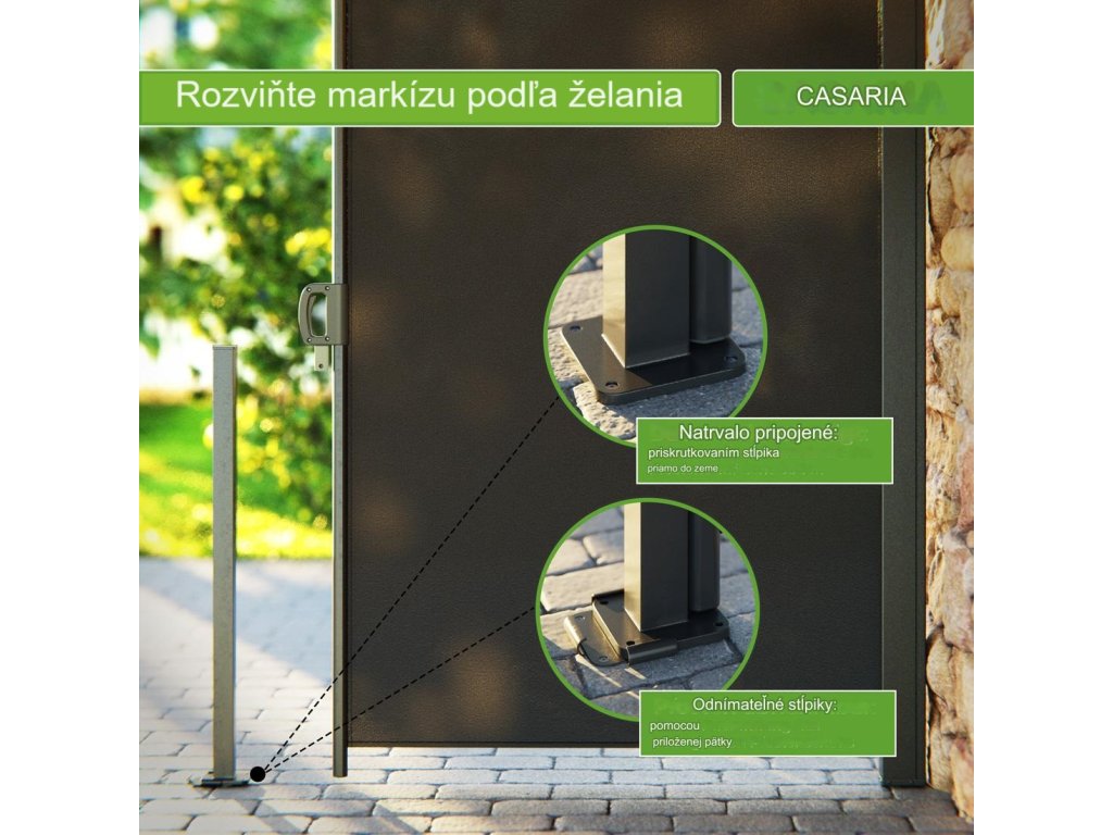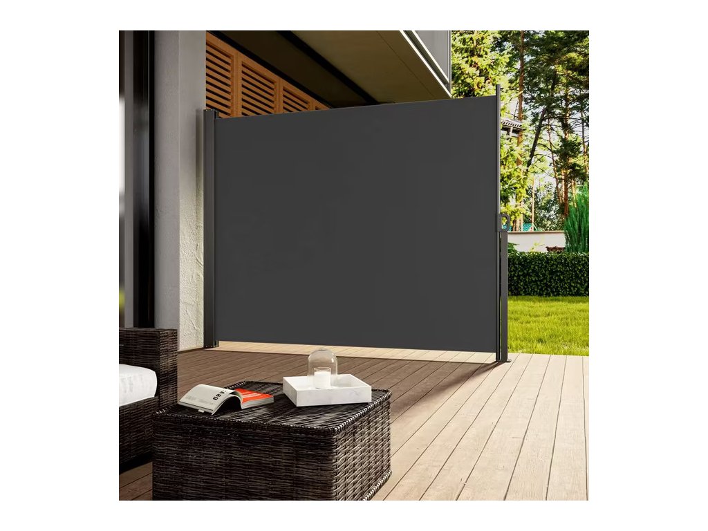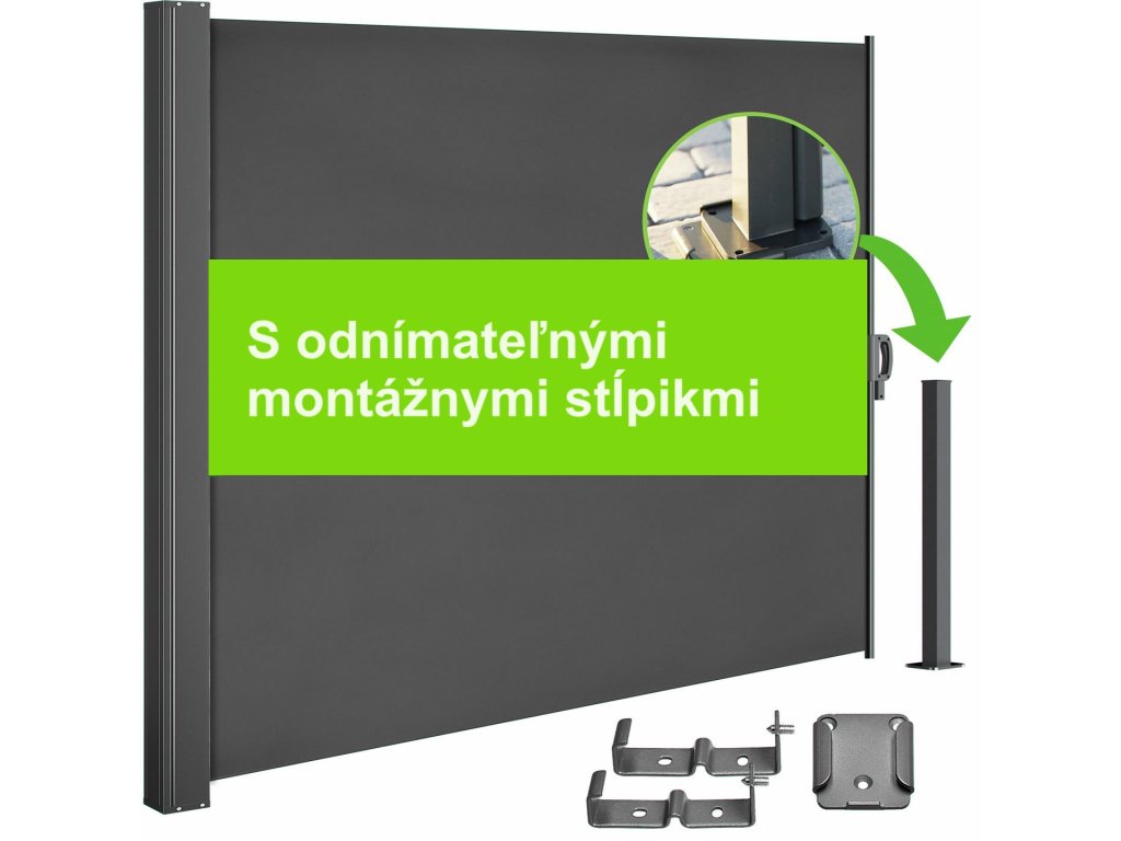 Kvalitná bočná výsuvná markíza vás zaručene ochráni pred slnkom, ale aj zvedavými pohľadmi. Robustná kazeta markízy je vyrobená z ocele s práškovým nástrekom a obsahuje nepriehľadnú látku vyrobenú z odolného polyesteru (180 g/m²). Vďaka polyuretánovému povlaku je látka vodoodpudivá, odolná voči poveternostným vplyvom a ľahko sa čistí. Markíza zároveň chráni pred silným vetrom a slnečnými lúčmi. Pretože je bočná markíza zvinutá v kazete, môžete látku jednoducho vyrolovať až do dĺžky 3 m. Vďaka 1-metrovému stĺpiku sa látka rozvíja hladko a bez pokrčenia. Pripevnite markízu k stene a k zemi pomocou zemnej kotvy, čo oceníte najmä pri sezónnej demontáži, napríklad na zazimovanie. Takisto má tento model zaklapávaciu funkciu na rukoväti, takže je markíza bezpečne ukotvená aj vo veternom počasí.