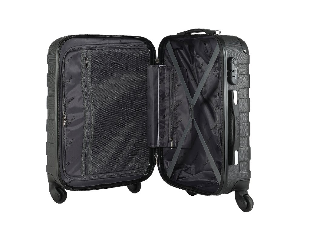 Interiér kufra je vybavený elastickými fixačnými pásmi, ktoré pomáhajú udržať oblečenie a predmety na svojom mieste. Vnútorné vrecko poskytuje dodatočný úložný priestor pre drobnosti, doklady alebo kozmetiku. Bezpečnosť obsahu podporuje integrovaný číselný zámok, ktorý znižuje riziko nechceného otvorenia kufra počas transportu.