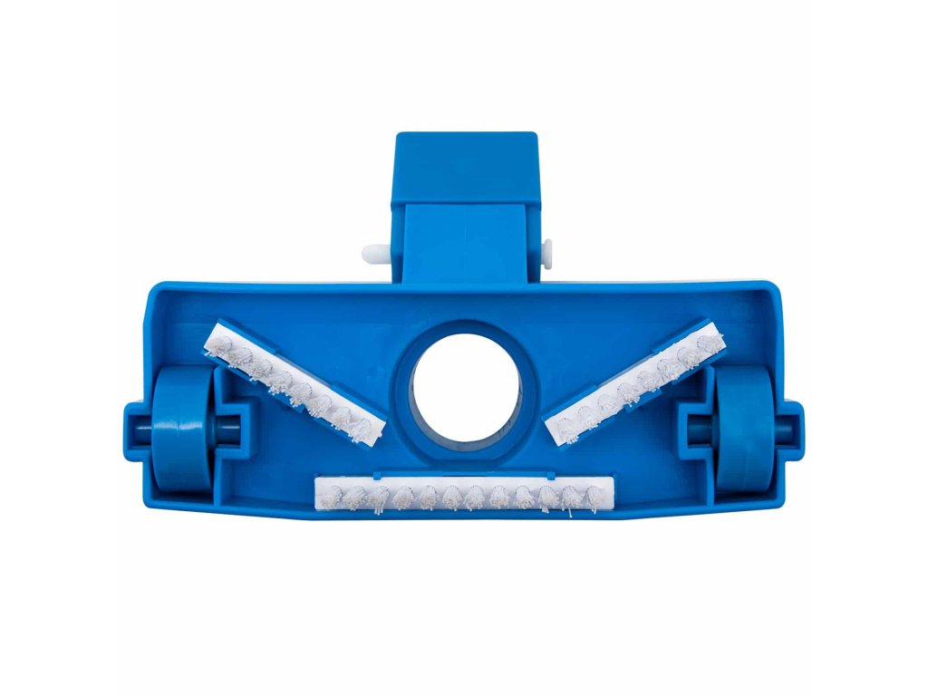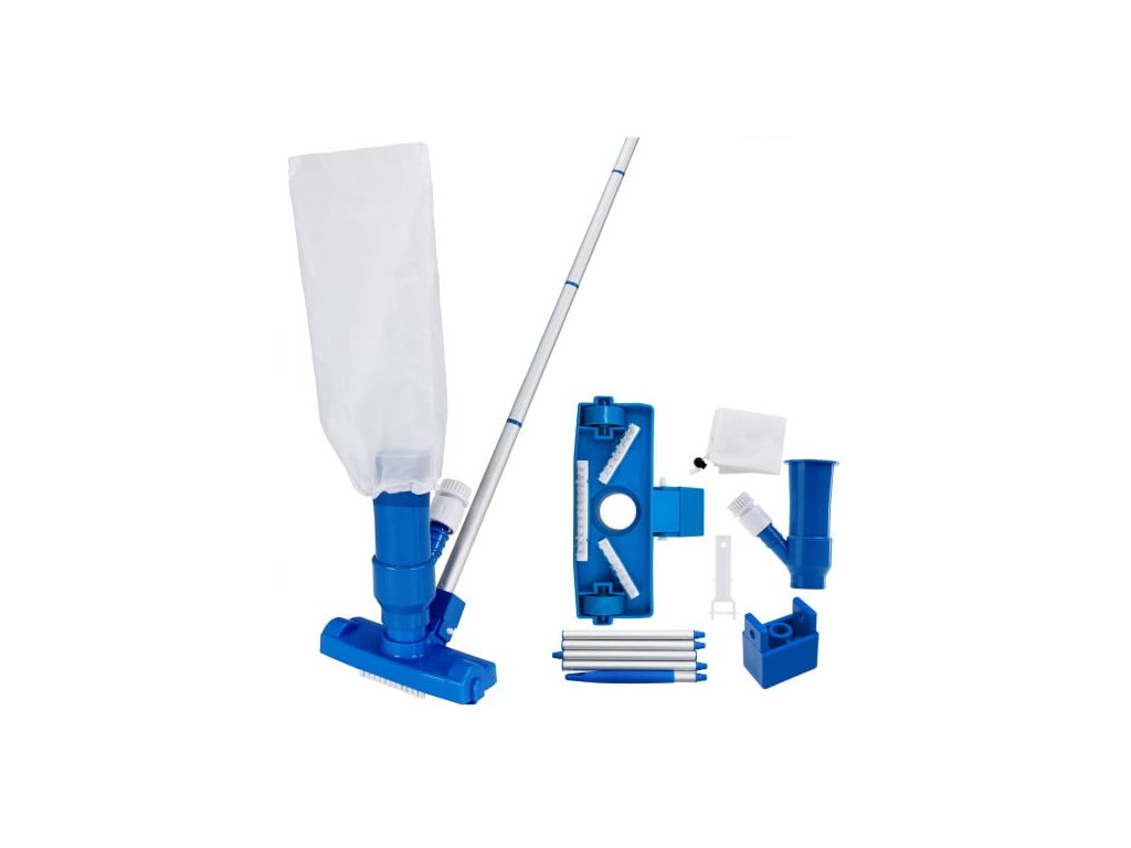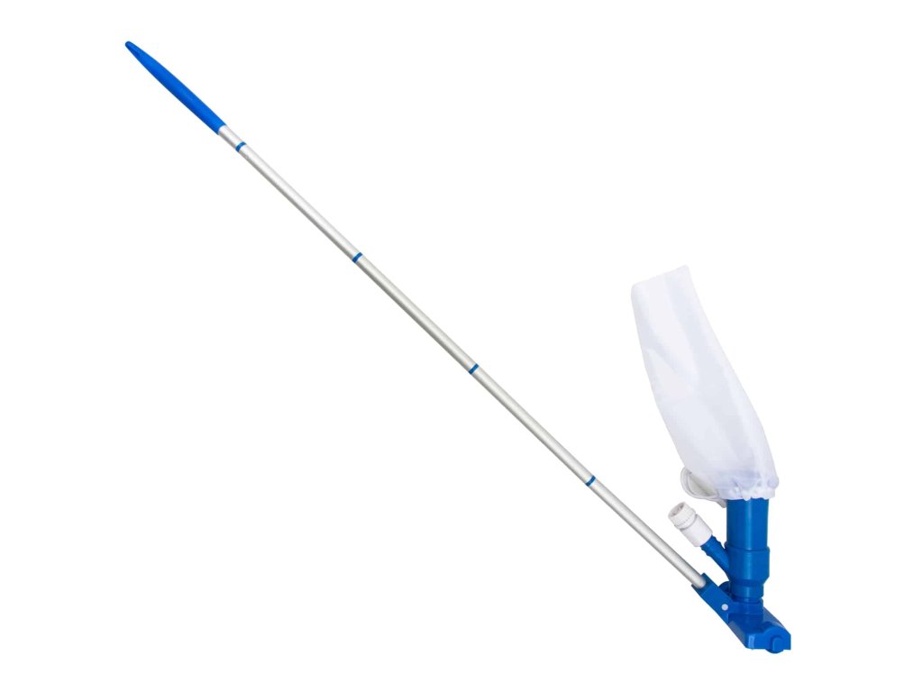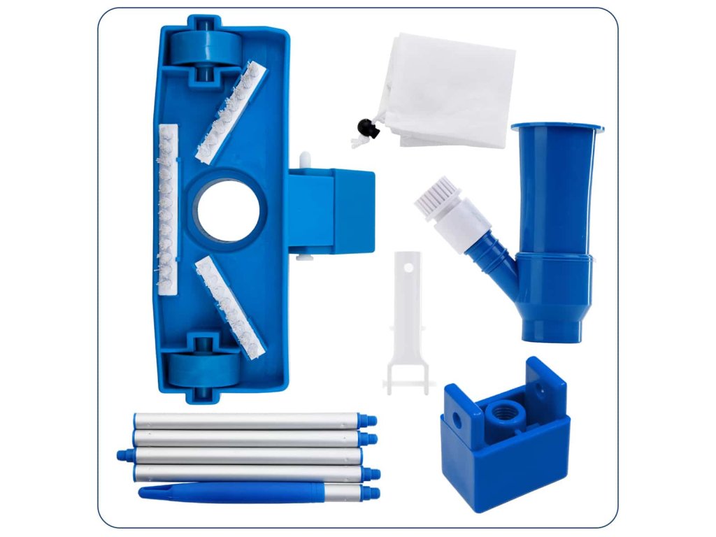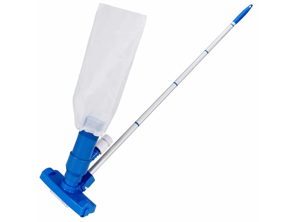 Vysávač s čistiacou hlavicou a umývateľnou zbernou nádobou je napojený na záhradnú hadicu a má variabilne vysúvaciu tyč. Tyč je možné predĺžiť z 22,5 cm až na celkovú dĺžku cca 1,2 m. Rolovateľná čistiaca hlavica s rozmermi 17 x 6 cm (ŠxD) má 3 kefky, ktoré spoľahlivo odstraňujú nečistoty. Vďaka tejto sade už nie je pre váš bazén problémom lístie, hmyz, tráva atď.