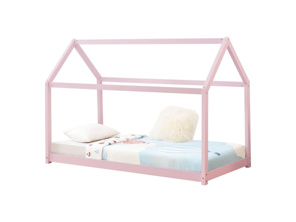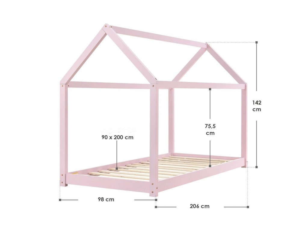 Detská posteľ s lamelovým roštom a strieškou poteší dievčatká od 3 do 10 rokov. Moderná posteľ ozdobí každú detskú izbu a ponúka útulné miesto na spanie a hranie. Vďaka dizajnu ako domček so strechou si môžete navrhnúť svoju individuálnu dievčenskú posteľ. Vaše dieťa sa môže dostať do postele samo vďaka otvorenému rámu postele od podlahy až po strop. Drevená posteľ z borovicového dreva je stabilná, pevná, nenáročná na údržbu a vhodná na dlhodobé používanie. Detská posteľ ponúka dostatok priestoru pre pokojný spánok a nápadité hranie. Škandinávsky dizajn ozdobí každú detskú izbičku. Plocha na ležanie 90 x 200 cm je na úrovni podlahy a je nízka. Keďže je blízko zeme, zabráni sa hlbokému pádu. To poskytuje väčšiu bezpečnosť a ochranu pre vaše dieťa. Drevená posteľ so stabilným roštom z masívneho dreva unesie váhu až 120 kg. Rošt z 13 drevených pružinových lamiel poskytuje dostatočnú stabilitu. Vďaka masívnemu borovicovému drevu a drevenému lamelovému roštu je rám postele stabilný a ideálny pre deti. Vďaka ľahko udržiavateľnému povrchu možno nečistoty ľahko odstrániť.