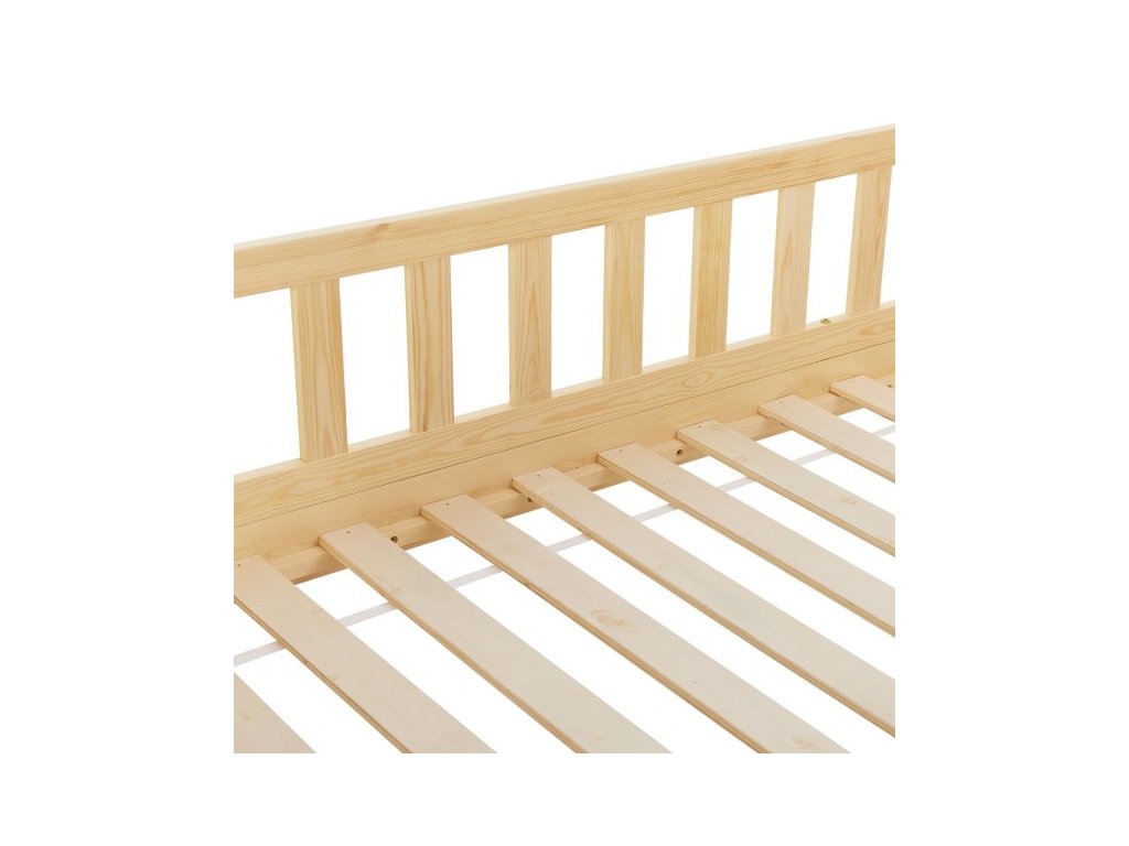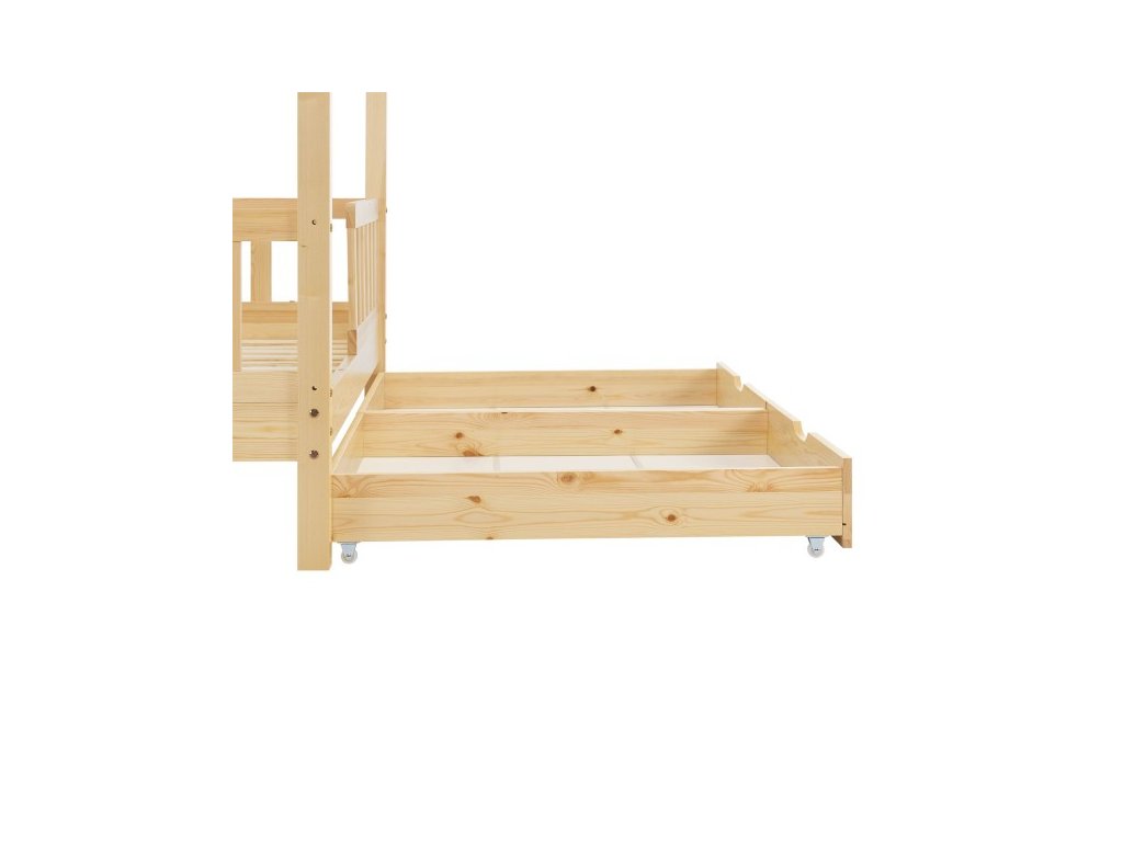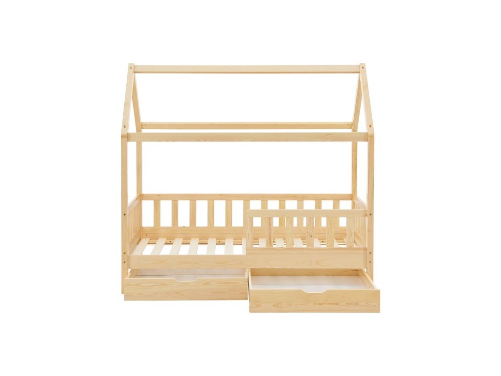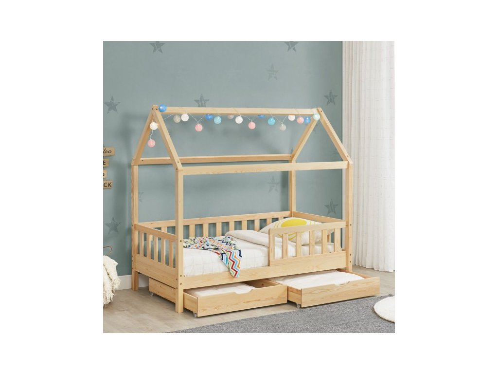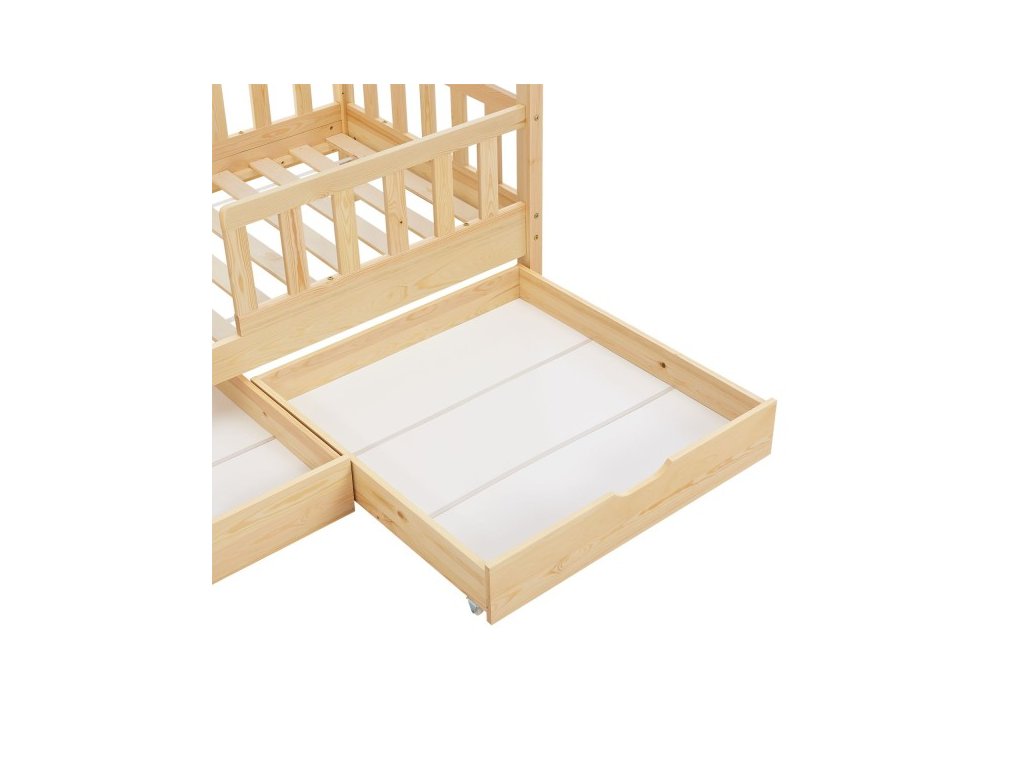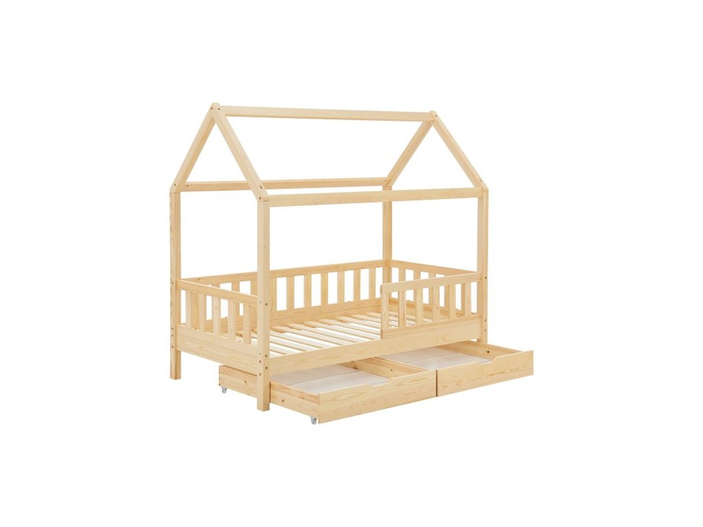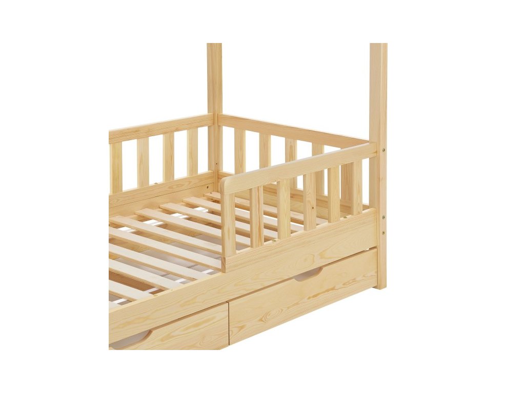 Moderná detská posteľ s úložným priestorom má ochranu proti pádu, lamelový rošt, striešku a je ideálna pre dievčatá a chlapcov od 3 do 10 rokov. Posteľ ako útulné miesto na spanie a hranie skrášli každú detskú izbu. Vzhľad postele ako domček s otvorenou strechou ponúka veľa možností. Ochranné zábradlie ponúka väčšiu ochranu a bezpečnosť, najmä pre malé deti. Dve priestranné zásuvky pod posteľou ponúkajú dostatok priestoru pre uloženie napríklad diek, vankúšov alebo hračiek. Pre dlhodobé používanie je drevená posteľ tou správnou voľbou vďaka masívnemu a ľahko udržiavateľnému borovicovému drevu. Drevený rám postele ponúka vysokú stabilitu a ľahko sa čistí. Ľahko udržiavateľný povrch umožňuje jednoduché odstránenie prachu a iných nečistôt.