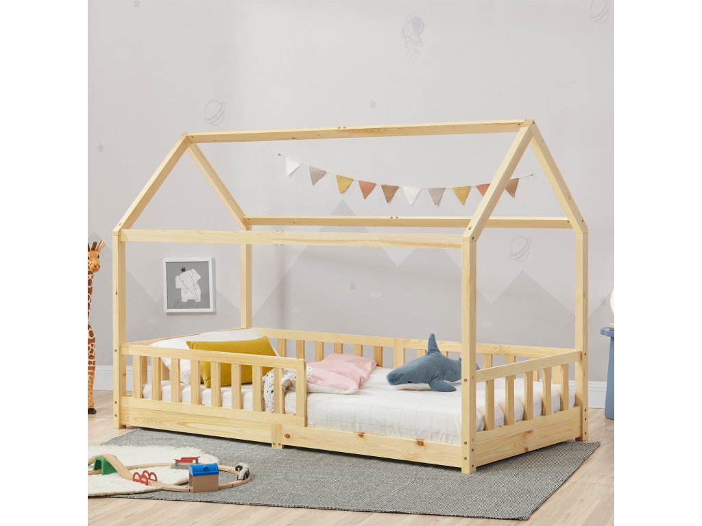 Moderná detská posteľ s ochranou proti pádu, lamelovým roštom a strieškou je ideálna pre dievčatá a chlapcov od 3 do 10 rokov s plochou na ležanie 90 x 200 cm. Posteľ ako útulné miesto na spanie a hranie skrášli každú detskú izbu. Vzhľad postele ako dom s otvorenou strechou, ponúka veľa možností. Dotvorte z tejto postele miesto na hranie pomocou dekorácii alebo strechy s baldachýnom. Brána ponúka bezpečnosť, ochranu a umožňuje vám vystúpiť na jednej strane. Pre dlhodobé používanie je drevená posteľ tou správnou voľbou vďaka masívnemu a ľahko udržiavateľnému borovicovému drevu.