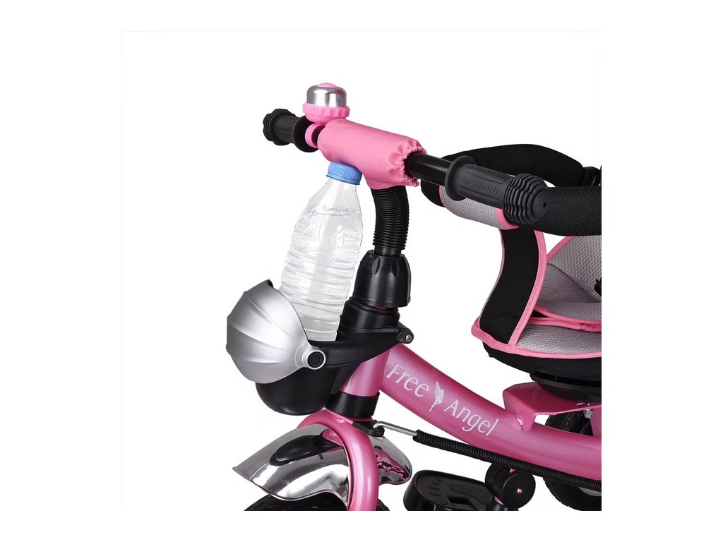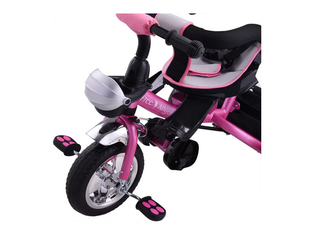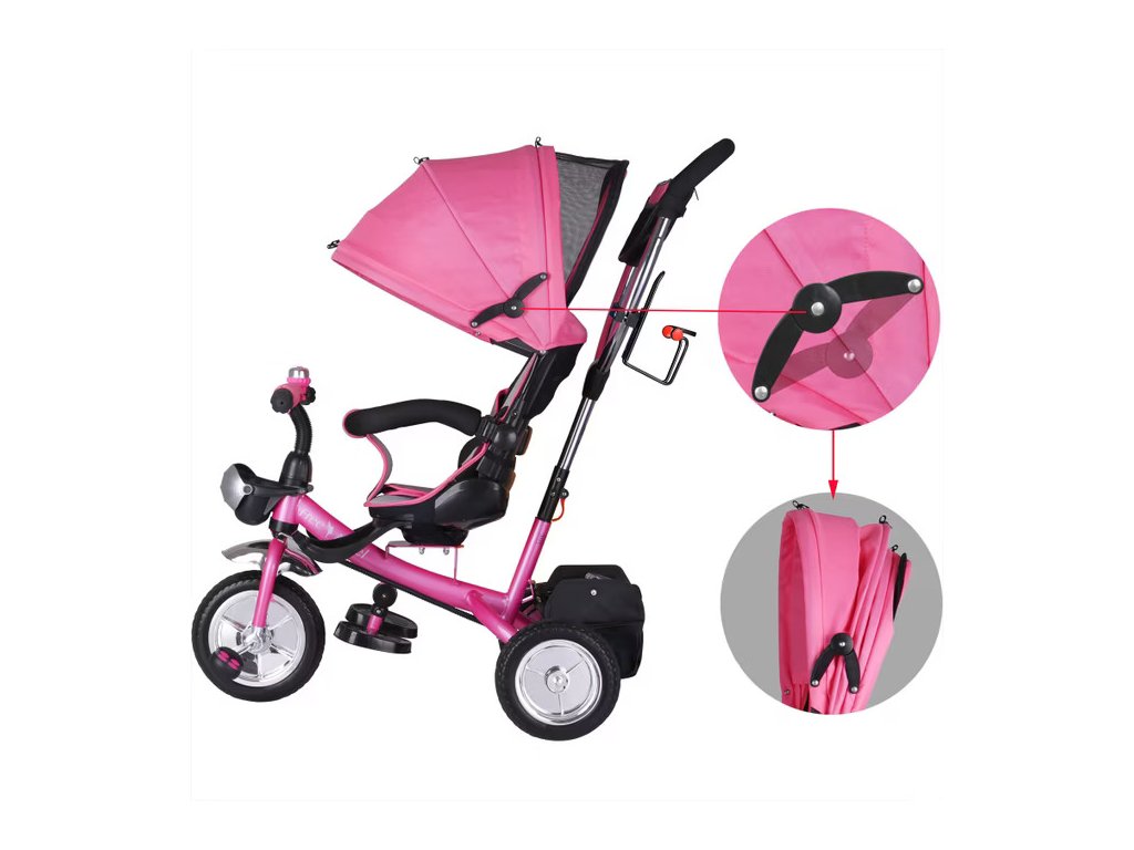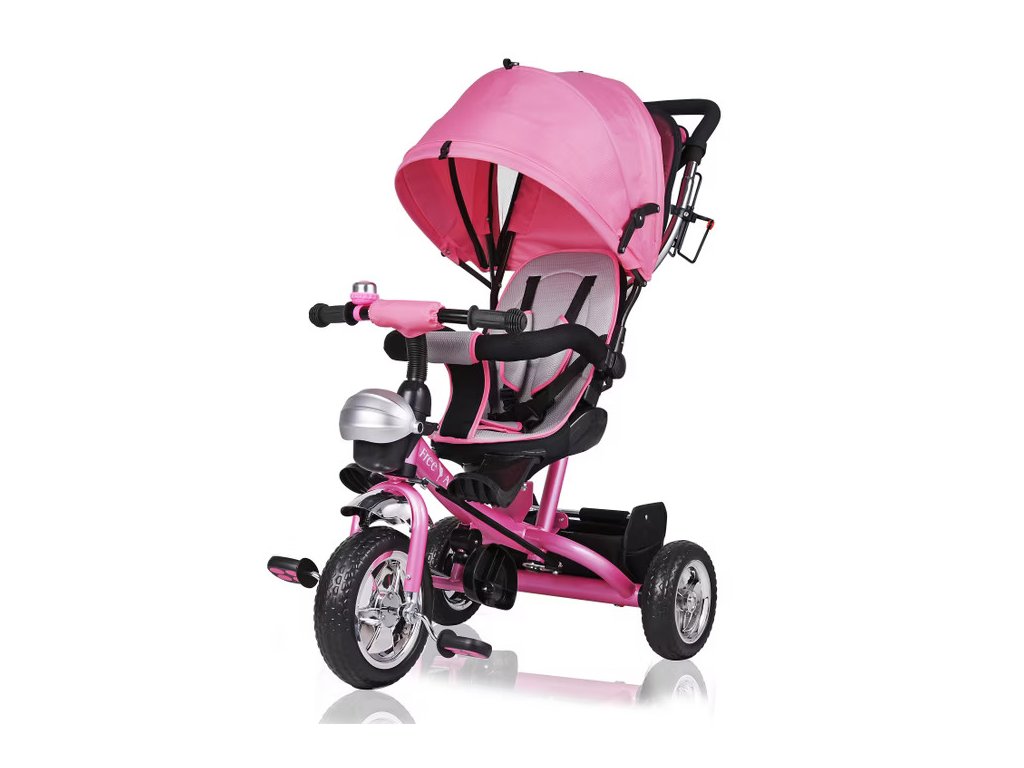 Detská trojkolka je multifunkčná, kombinuje kočík s trojkolku a rastie s vašim dieťaťom. Skladacia strieška má priehľadnú sieťku, ktorá zabraňuje hromadeniu tepla v lete a slúži ako priezor pre dieťa. Striešku je možno úplne odstrániť. Trojkolka má aj rodičovské riadenie s parkovacou brzdou to znamená, že keď rodič riadi trojkolku pomocou tlačnej tyče, predné koleso trojkolky sa automaticky riadi pomocou hriadeľa riadenia.Nánožníky určené pre deti vo veku 10-15 mesiacov možno odstrániť keď dieťa vyrastie a začne dosahovať na dve sklopné podnožky (deti vo veku 15-36 mesiacov). Ako dieťa rastie a dosahuje protišmykové pedále (deti od 3 rokov), opierky nôh sa dajú jednoducho zložiť, aby počas jazdy neprekážali. Bezpečnostnú tyč na sedadle a tyč na tlačenie pre rodičov možno tiež odstrániť, aby sa trojkolka prispôsobila potrebám rastúceho dieťaťa. Sedadlo je možné otáčať o 360°, takže v prípade potreby môžete dieťa otočiť úplne k sebe, napríklad na upokojenie.Na uskladnenie má trojkolka všestranný odnímateľný košík s rúčkou na prenášanie (na nákupy, hračky a pod.), veľkú vyberateľnú tašku so zipsom medzi madlom a držiak na fľašu. Vpredu je tiež uzamykateľný kôš na drobnosti alebo fľaše s vodou. Detská sedačka s 5-bodovým bezpečnostným pásom je mäkko polstrovaná. Riadidlá majú protišmykové rukoväte a zvonček. Používajte len pod dohľadom dospelej osoby.Pravidlá používania: