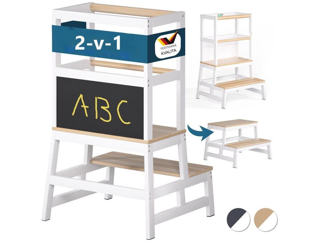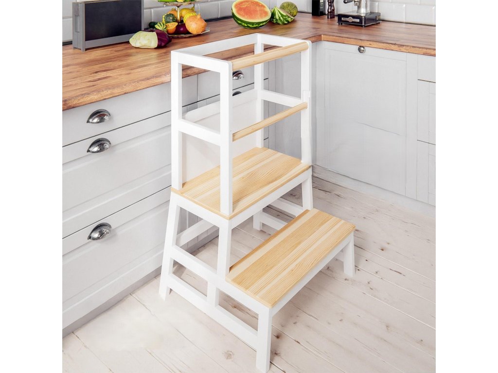 Detská učiaca veža bola navrhnutá so špeciálnym zameraním na potreby detí. Vytvára bezpečné prostredie, kde deti môžu sledovať svojich rodičov pri príprave jedla. Takto efektívne trénujete samostatnosť, sebadôveru a rovnováhu dieťaťa. Špeciálny lichobežníkový dizajn je nenakloniteľný a poskytuje dodatočnú stabilitu. Veža je tiež užitočným pomocníkom pre najmenších v kúpeľni pri umývaní zúbkov.