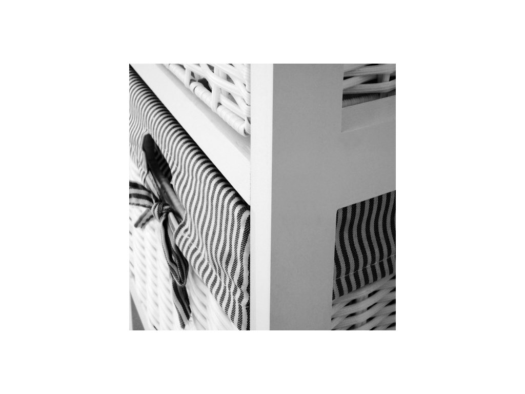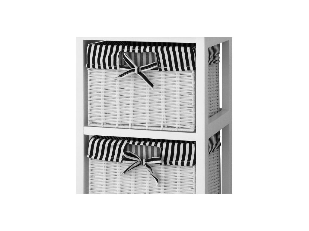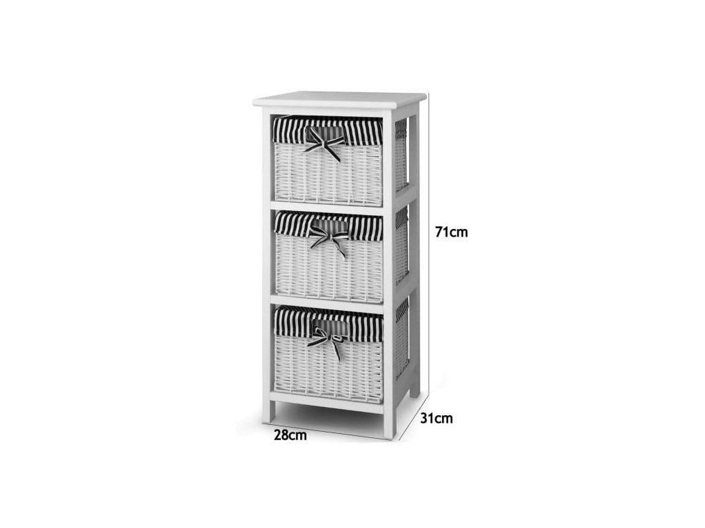 Regál s košíkmi v elegantnom vidieckom štýle vám poslúži ako praktický úložný priestor v kúpeľni, kuchyni alebo spálni. 3 vyberateľné koše vyrobené z polyratanu vám ponúkajú veľa úložného priestoru a sú tiež podšité vyberateľnými, prateľnými látkovými vložkami. Regál vo vidieckom štýle je vyrobený z dreva.