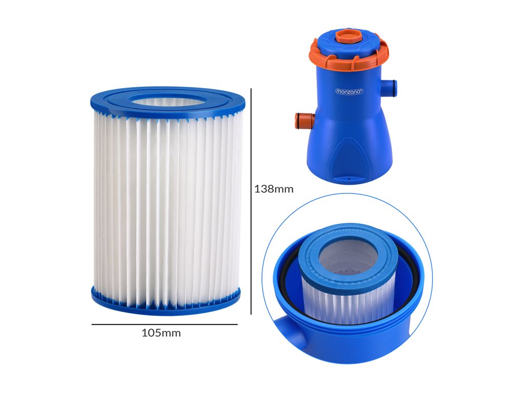 - Kompatibilné s: filtračným čerpadlom monzana®: MZP40/30 (13,8 x 10,5 cm) a bežnými čerpadlami Bestway Flowclear veľkosti II / filtračnými systémami Intex typ H