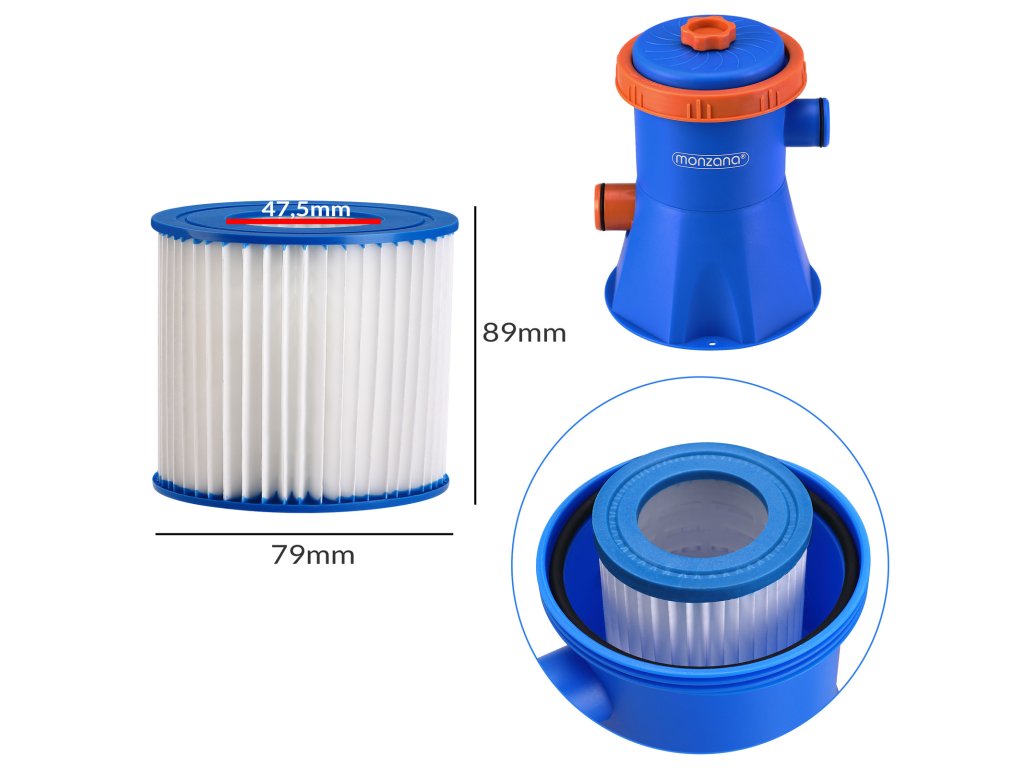 - Kompatibilné s: filtračným čerpadlom monzana®: MZP15 (8,9 x 7,9 cm) a bežnými čerpadlami Bestway Flowclear veľkosti I / filtračnými systémami Intex typ S1