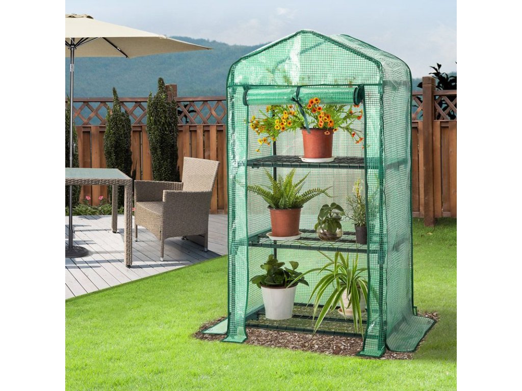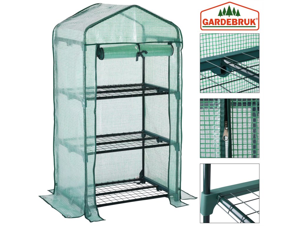 Šikovný fóliovník poskytuje dostatok priestoru pre vaše rastliny a umožňuje pestovanie rôznych druhov zeleniny a byliniek. Kvety, rastliny alebo zeleninu je potrebné chrániť pred nepriaznivými poveternostnými podmienkami, ako sú vietor, dážď, prízemný mráz a hmyz. Vďaka praktickému zásuvnému systému je montáž rýchla a jednoduchá. Fólia zabezpečuje dostatočný prísun slnečného svetla a zároveň uchováva vlhkosť a teplo. V prípade príliš vysokých teplôt môžete jednoducho otvoriť dvere a zrolovať ich, čo zabezpečí ideálnu cirkuláciu vzduchu. Vo vnútri fóliovníka poskytujú stabilné police priestor pre malé rastliny. Každá polica má nosnosť až 10 kg. Spodný okraj fóliovníka je o niečo dlhší ako rám a odporúča sa okraj zafixovať zeminou alebo kameňmi pre zvýšenie celkovej stability konštrukcie. Súčasťou balenia sú šnúry a zemné kotvy, ktoré slúžia na optimálne upevnenie skleníka.