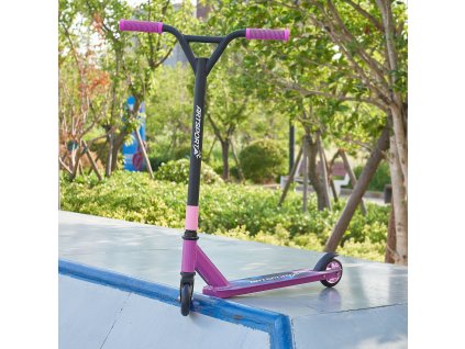 Štýlová freestyle kolobežka Futuristic prináša zábavu z jazdy pre aktívnych tínedžerov a deti od 6 rokov, ktorí sú radi vonku alebo v skateparku. Rýchlu a hladkú jazdu zaisťujú 100 mm PU kolieska s hliníkovým jadrom a ložiskom ABEC 9. So stabilnou a ľahkou kolobežkou sú možné skvelé triky. Manévrovateľné 360° riadidlá, TPR rukoväte a protišmyková plošina robia z kolobežky dokonalú dobrodružnú zábavu. Kolobežka s vystuženou oceľovou vidlicou má stabilnú a ľahkú hliníkovú konštrukciu. To je dôležité najmä pre bezpečnosť pri jazde a rýchlych kúskoch. Kolobežka unesie hmotnosť užívateľa do 100 kg a vydrží skoky až do 60 kg.