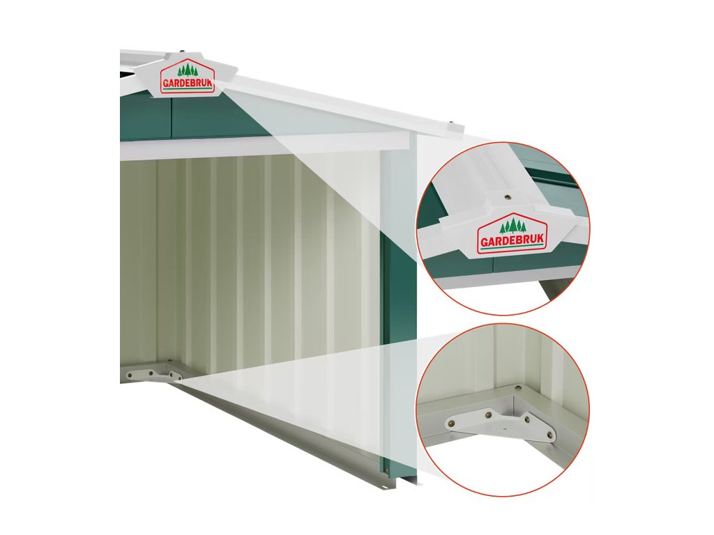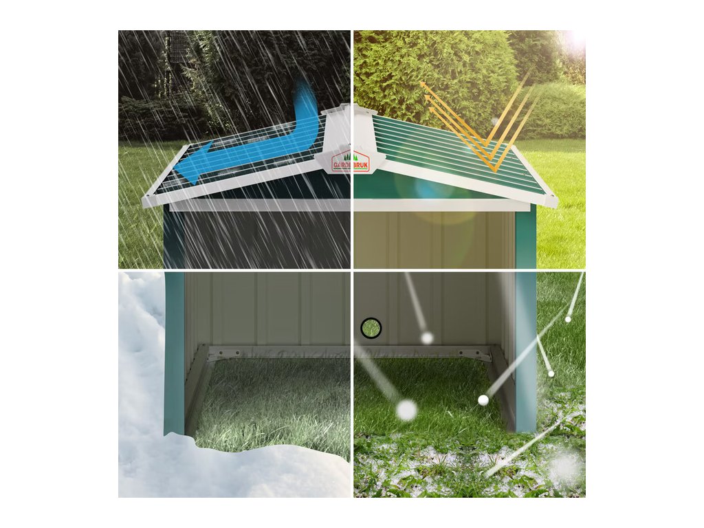 - Odolná vďaka žiarovo pozinkovanému oceľovému plechu, pozinkovanému oceľovému rámu a náteru s UV ochranou
