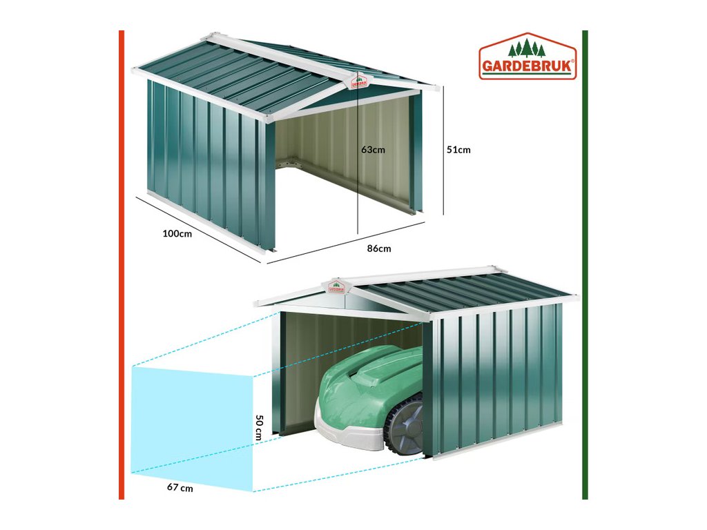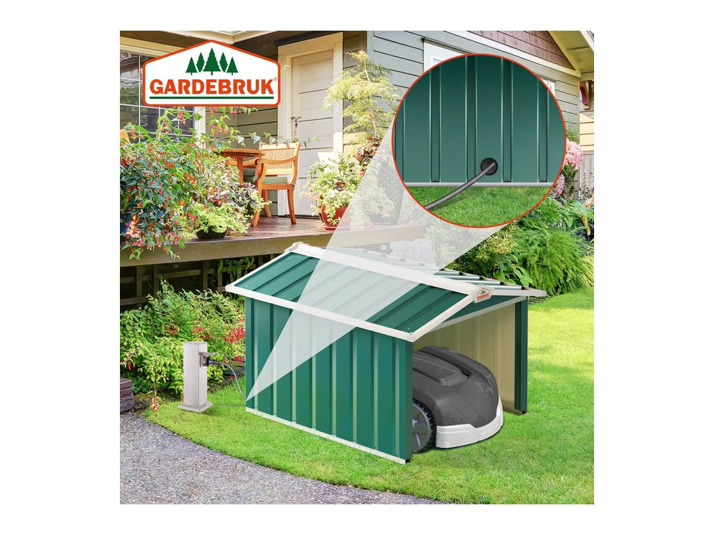Táto elegantná garáž pre robotickú kosačku poskytuje spoľahlivú ochranu pre váš stroj pred dažďom, UV žiarením a ďalšími poveternostnými vplyvmi. Vďaka kvalitnému pozinkovanému oceľovému plechu a stabilnému rámu s UV ochranou je garáž výnimočne odolná a vhodná na dlhodobé používanie. Lichobežníkové panely z ocele zabezpečujú optimálnu stabilitu stien. Dodatočné soklové lišty, pevné kovové konzoly a štyri zemné kolíky zaisťujú ešte vyššiu pevnosť konštrukcie a chránia garáž pred vetrom. Celá konštrukcia je ošetrená kvalitným pozinkovaním, vďaka čomu je odolná voči hrdzi a mrazu. Praktické vedenie káblov s gumenou ochranou umožňuje pohodlné a bezpečné vyvedenie napájacieho kábla smerom von, bez rizika jeho poškodenia alebo zamotania. Ideálnym miestom na inštaláciu sú rovné povrchy, ako trávnik, betónová plocha, dlažba alebo pevné dosky. Garáž je možné pevne priskrutkovať ku tvrdým povrchom pomocou bežných skrutiek. Vnútorný úložný priestor má rozmery 76,5 × 85 cm, čo z nej robí vhodné riešenie pre väčšinu štandardných modelov robotických kosačiek. Vďaka priestrannému vstupu sa vaša kosačka vždy bezpečne a presne pripojí k nabíjacej stanici.Výhody produktu: