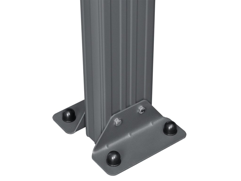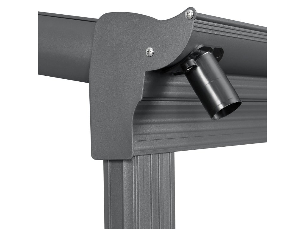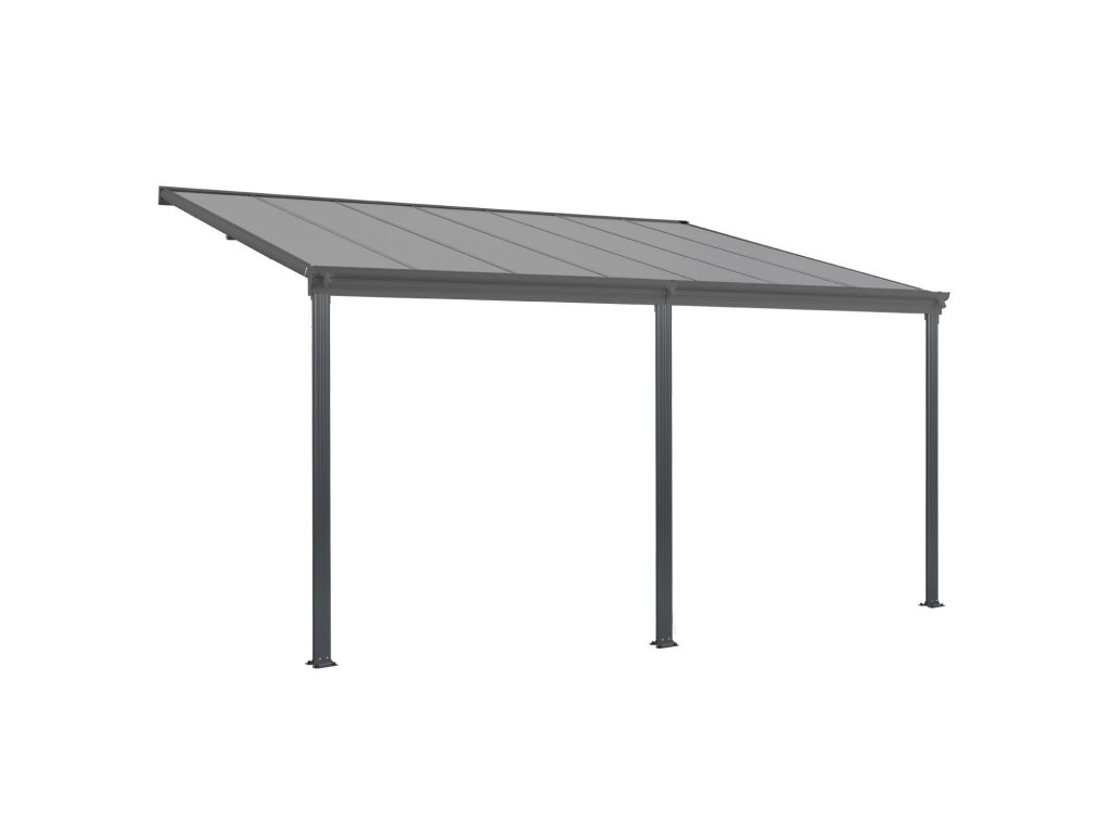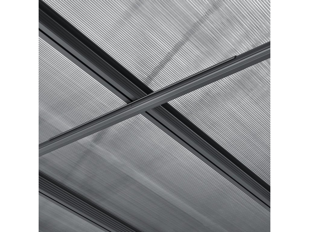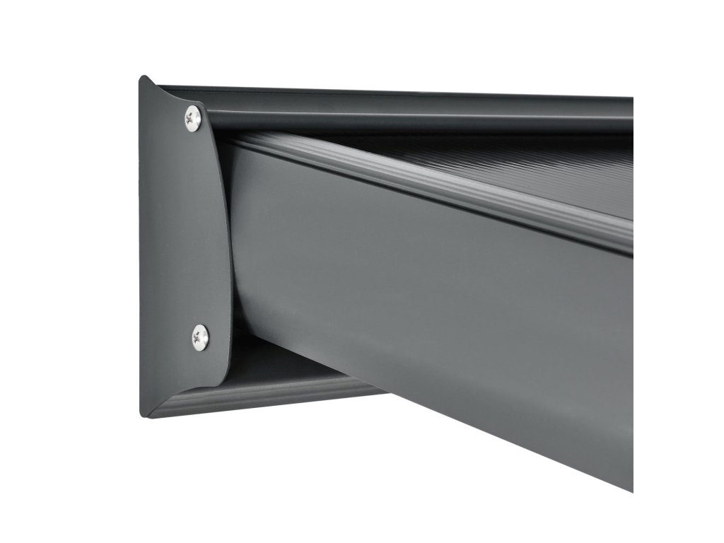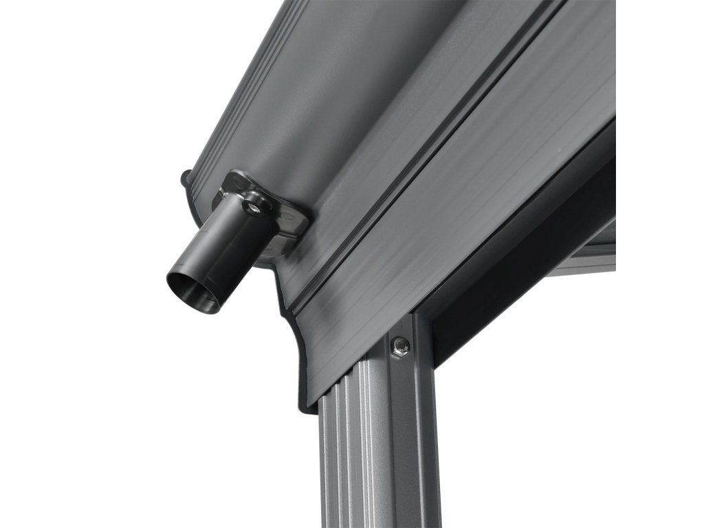 Veľká hliníková pergola 4 x 3 m je ideálna pre terasu priamo pri dome. Šedý základný rám pozostáva z práškovo lakovaného hliníka. Pozinkované oceľové spoje držia hliníkové prvky bezpečne pohromade. Vďaka kovu odolnému voči poveternostným vplyvom a korózii je pergola ideálna na dlhé roky vonkajšieho používania. Pergola je vyrobená zo sivých viacstenných polykarbonátových dosiek, ktoré sú odolné voči poveternostným vplyvom, nárazuvzdorné a trvácne. Pergola je určená na montáž na stenu. Súčasťou pergoly sú dva integrované odkvapové žľaby s tromi odkvapovými výpustmi, ktoré zaisťujú, že dažďová voda bude vždy čisto a kontrolovane odtekať zo strechy. Pergola sa ľahko čistí a vyžaduje len malú údržbu. Nečistoty môžete odstrániť mäkkou handričkou a teplou vodou. Nehrdzavejúci kov je navyše bezúdržbový a nevyžaduje náter.