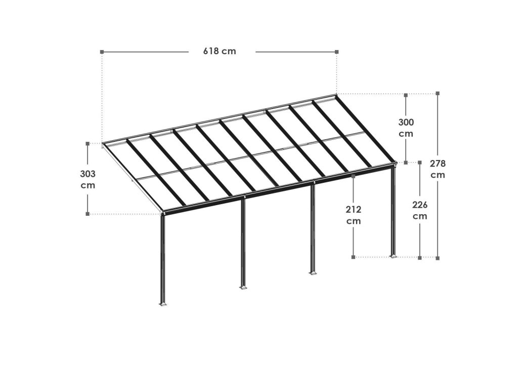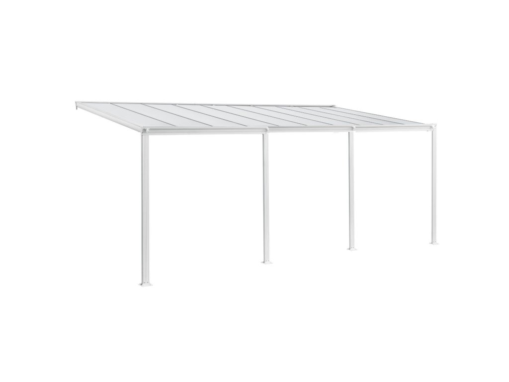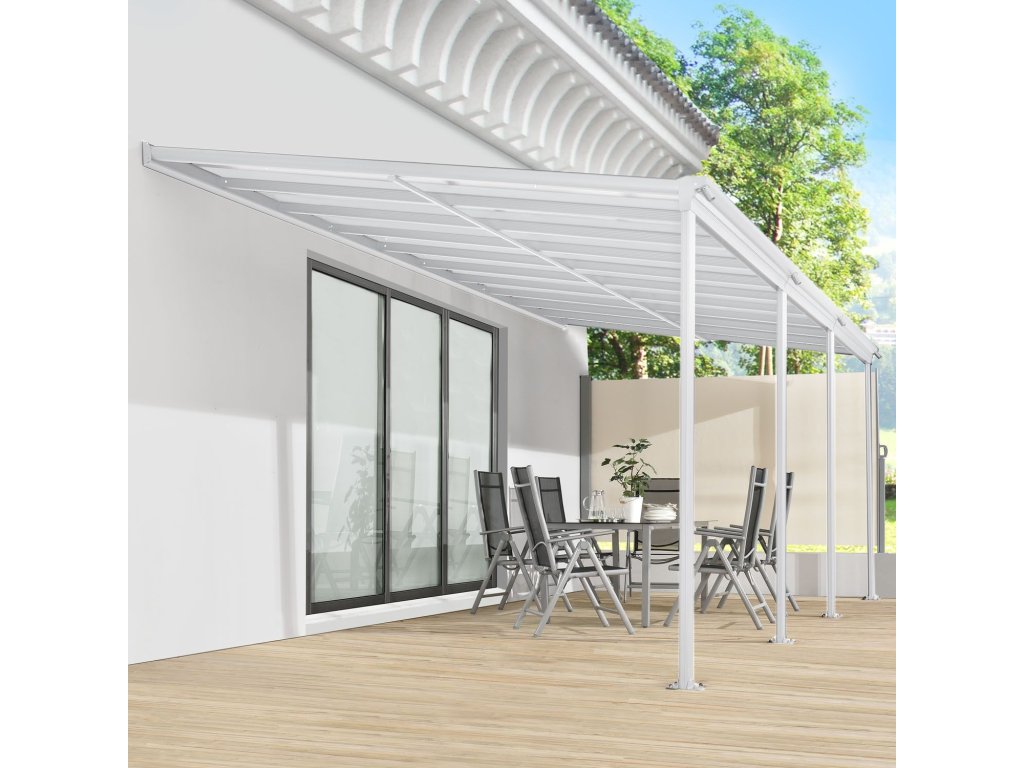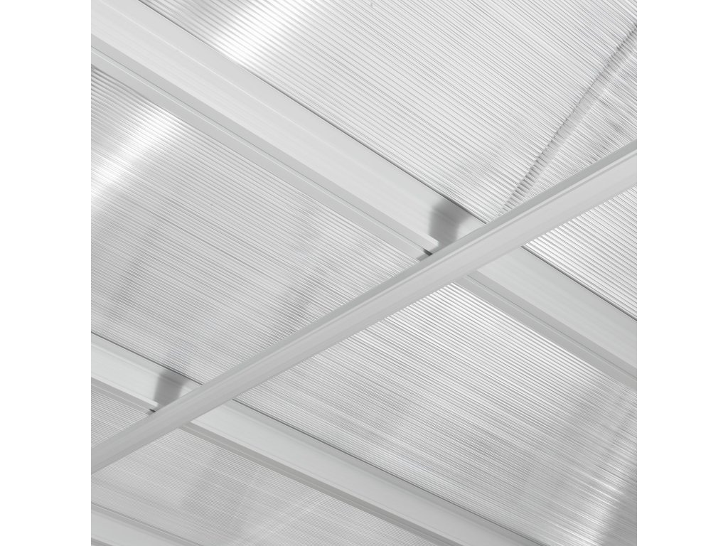Veľká hliníková pergola 6 x 3 m je ideálna pre terasu priamo pri dome. Biely základný rám pozostáva z práškovo lakovaného hliníka. Pozinkované oceľové spoje držia hliníkové prvky bezpečne pohromade. Vďaka kovu odolnému voči poveternostným vplyvom a korózii je pergola ideálna na dlhé roky vonkajšieho používania. Pergola je vyrobená z priehľadných viacstenných polykarbonátových dosiek, ktoré sú odolné voči poveternostným vplyvom, nárazuvzdorné a trvácne. Pergola je určená na montáž na stenu. Súčasťou pergoly sú tri integrované odkvapové žľaby so štyrmi odkvapovými výpustmi, ktoré zaisťujú, že dažďová voda bude vždy čisto a kontrolovane odtekať zo strechy. Pergola sa ľahko čistí a vyžaduje len malú údržbu. Nečistoty môžete odstrániť mäkkou handričkou a teplou vodou. Nehrdzavejúci kov je navyše bezúdržbový a nevyžaduje náter.