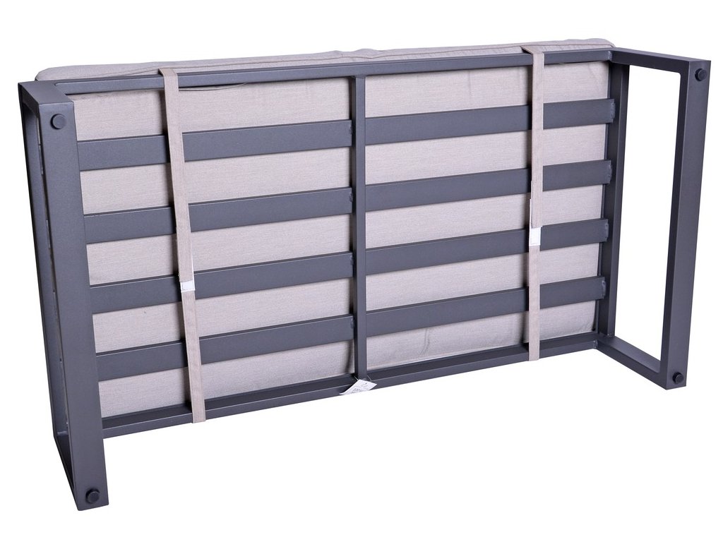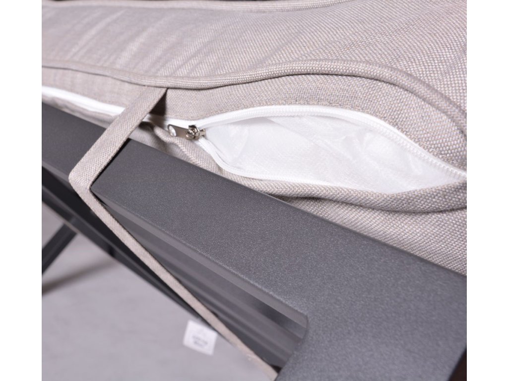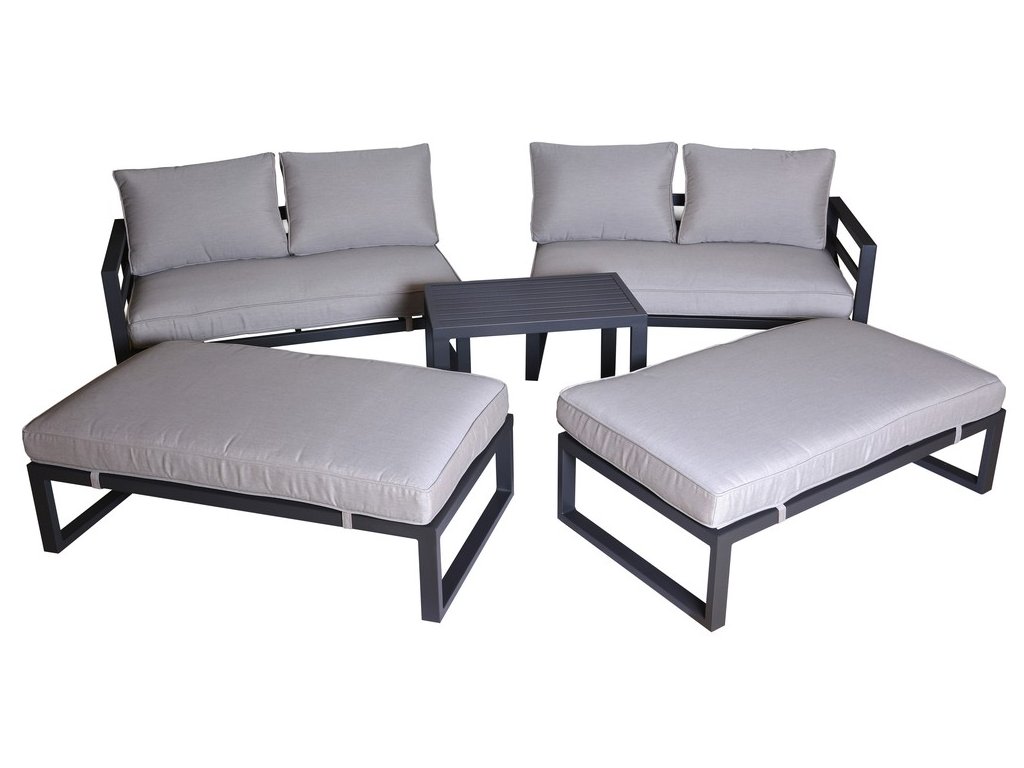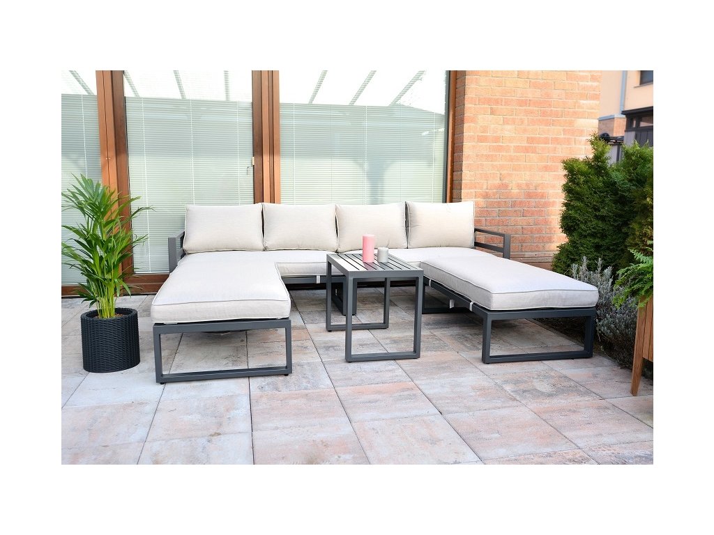 Luxusná dizajnová súprava z hliníka, pokrytá sivým práškovým lakom. Táto moderná súprava sa s prepracovaným dizajnom nádherne hodí do akéhokoľvek prostredia, či už ide o interiér alebo exteriér - záhrady, terasy, zimné záhrady či balkóny. Vďaka zipsom na všetkých poduškách a vankúšoch je možné rýchlo a jednoducho odstrániť poťah. Zostava má jednoduché zostavenie aj zloženie. Po zložení zaberá minimálny priestor.