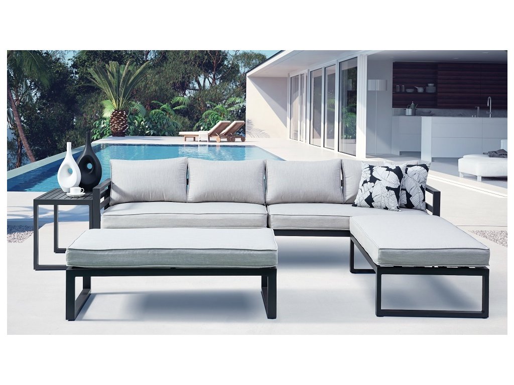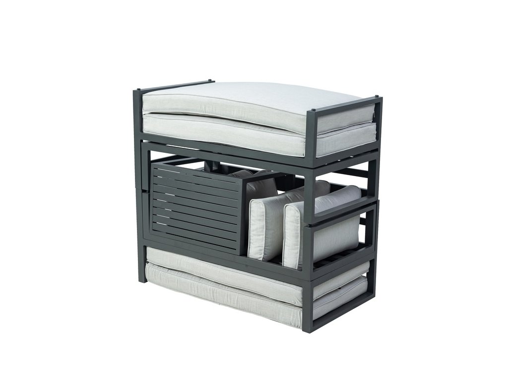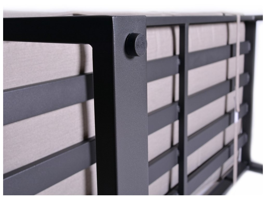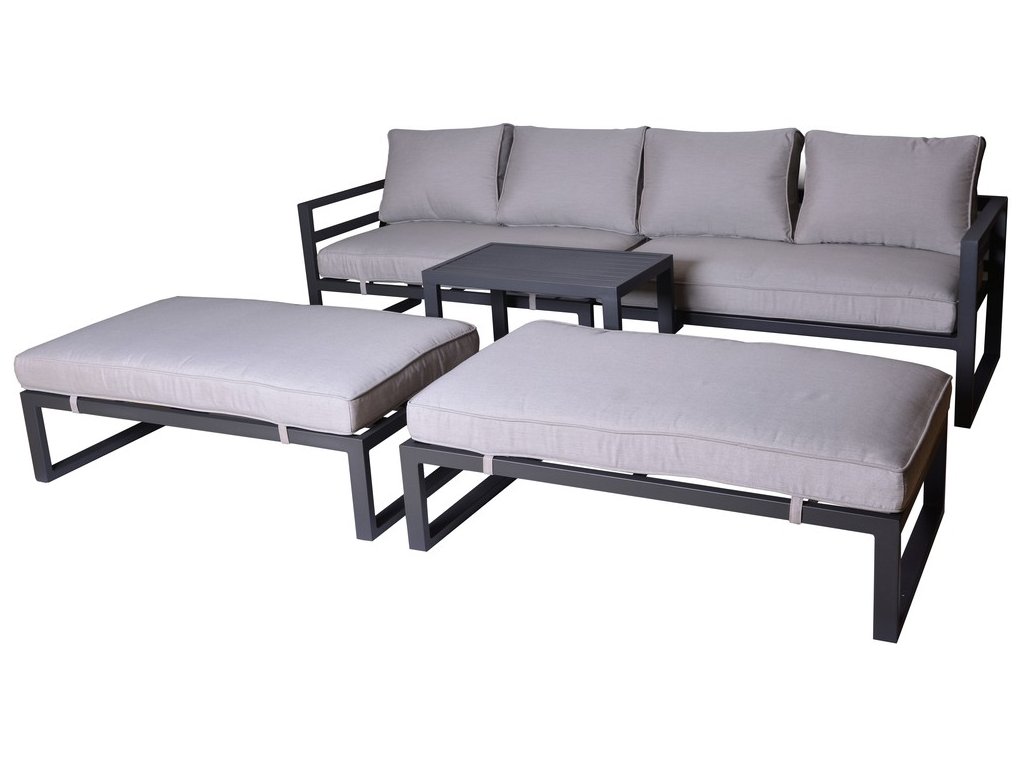 Luxusná dizajnová súprava z hliníka, pokrytá sivým práškovým lakom. Táto moderná súprava sa s prepracovaným dizajnom nádherne hodí do akéhokoľvek prostredia, či už ide o interiér alebo exteriér - záhrady, terasy, zimné záhrady či balkóny. Vďaka zipsom na všetkých poduškách a vankúšoch je možné rýchlo a jednoducho odstrániť poťah. Zostava má jednoduché zostavenie aj zloženie. Po zložení zaberá minimálny priestor.