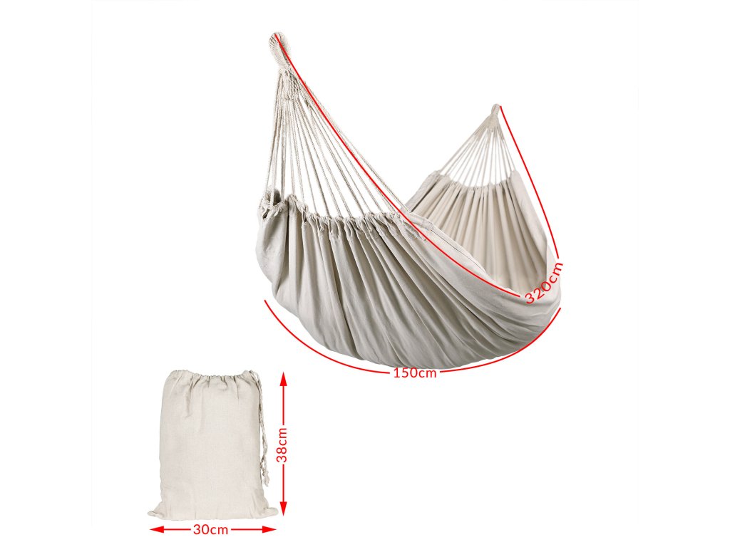 Táto hojdacia sieť je navrhnutá tak, aby bezpečne zvládla zaťaženie až do 300 kg. So šírkou 150 cm poskytuje dostatok priestoru pre dve osoby, čím je ideálna na spoločný oddych. Praktický systém zavesenia umožňuje montáž aj demontáž, čo oceníte najmä pri cestovaní. Vyrobená z kvalitných zmesí bavlny a polyesteru s gramážou 320 g/m², sieť ponúka mäkký a priedušný povrch, ktorý je príjemný na dotyk, odolný voči poveternostným vplyvom a vode. K hojdacej sieti sú priložené pevné laná na oboch koncoch pre bezpečné zavesenie.