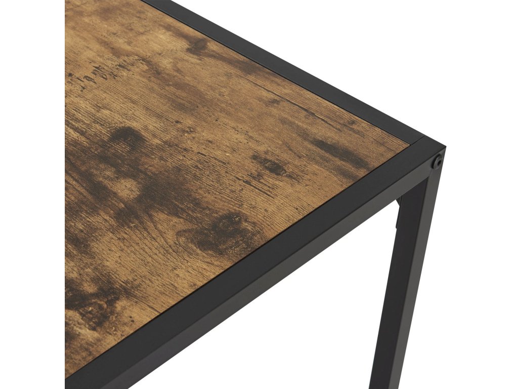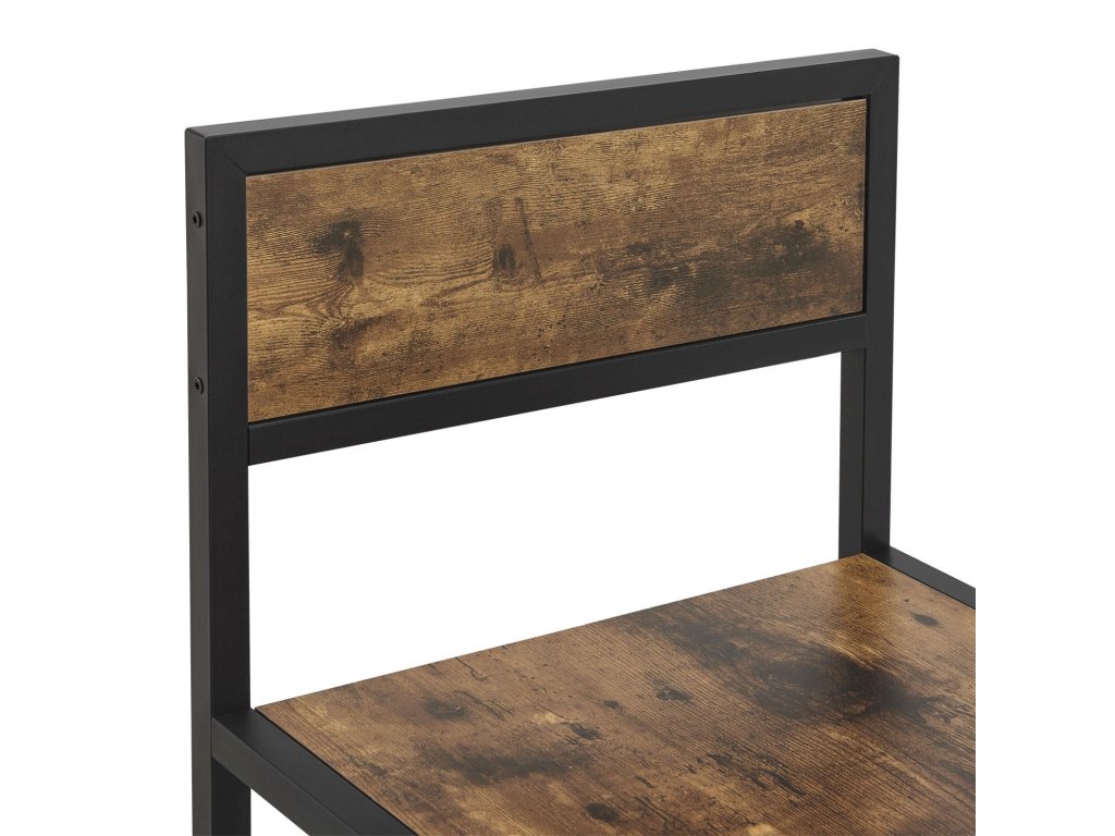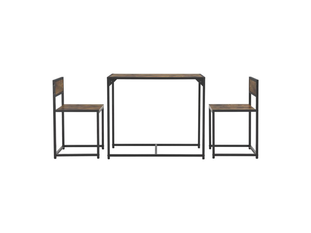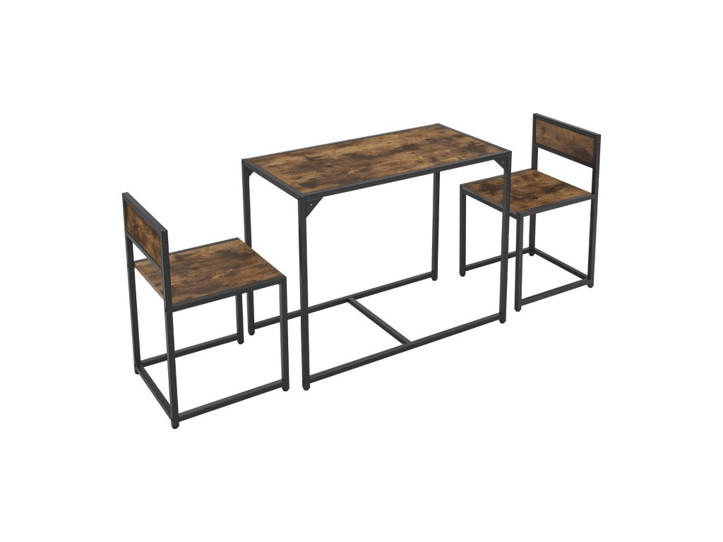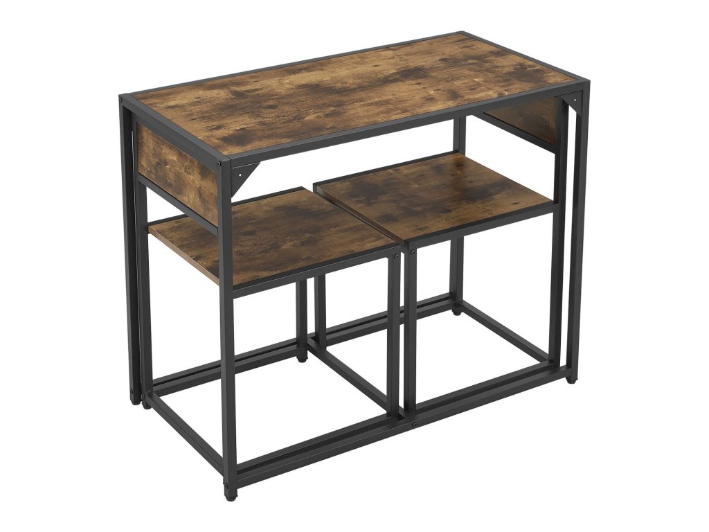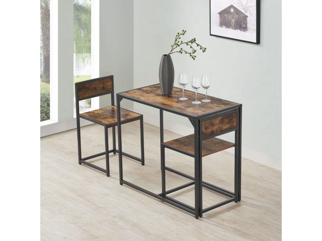 Moderná jedálenská súpravu so stolom a dvoma stoličkami v minimalistickom industriálnom vzhľade. Priestorovo úsporné riešenie, súprava sa dá kompaktne zložiť, a preto je ideálna pre malý byt. Či už v obývačke, jedálni alebo kuchyni, zaobstarajte si štýlový kus nábytku pre útulné stolovanie pre dvoch. Čierny oceľový rám tvorí štýlový kontrast k doske stola v starožitnom drevenom vzhľade a vytvára tak elegantný industriálny vzhľad. Robustný rám vyrobený z práškovo lakovanej ocele dodáva nábytku vysokú úroveň stability. Stôl unesie až 100 kg. Povrch možno ľahko čistiť vlhkou handričkou.