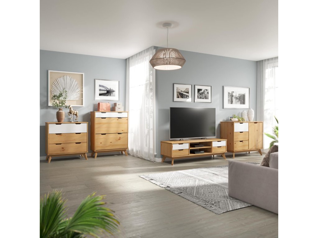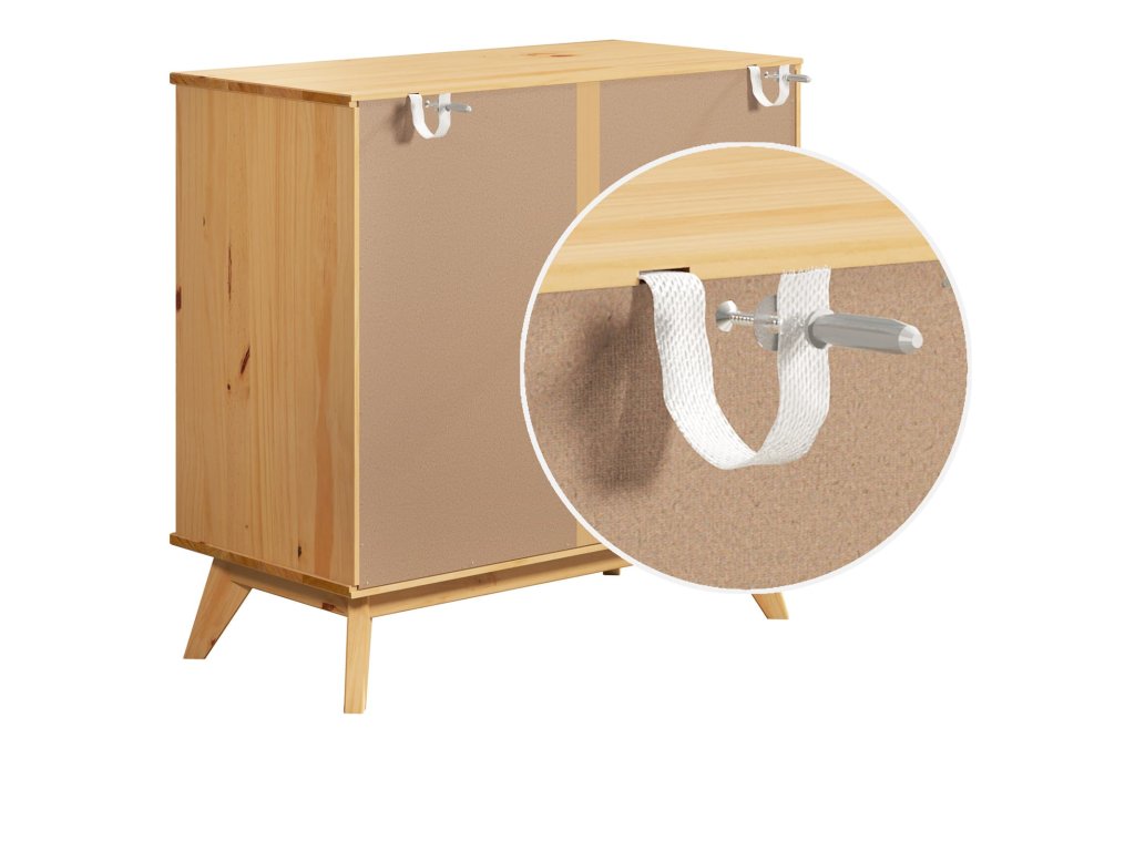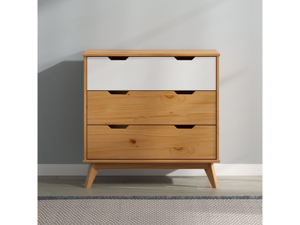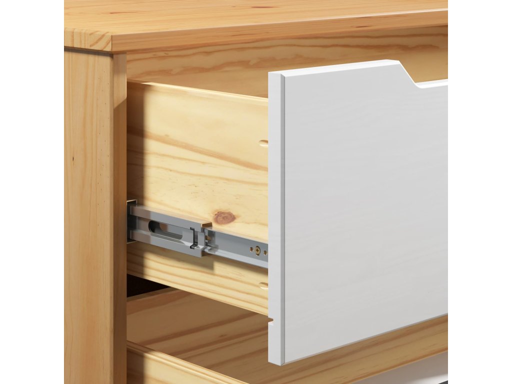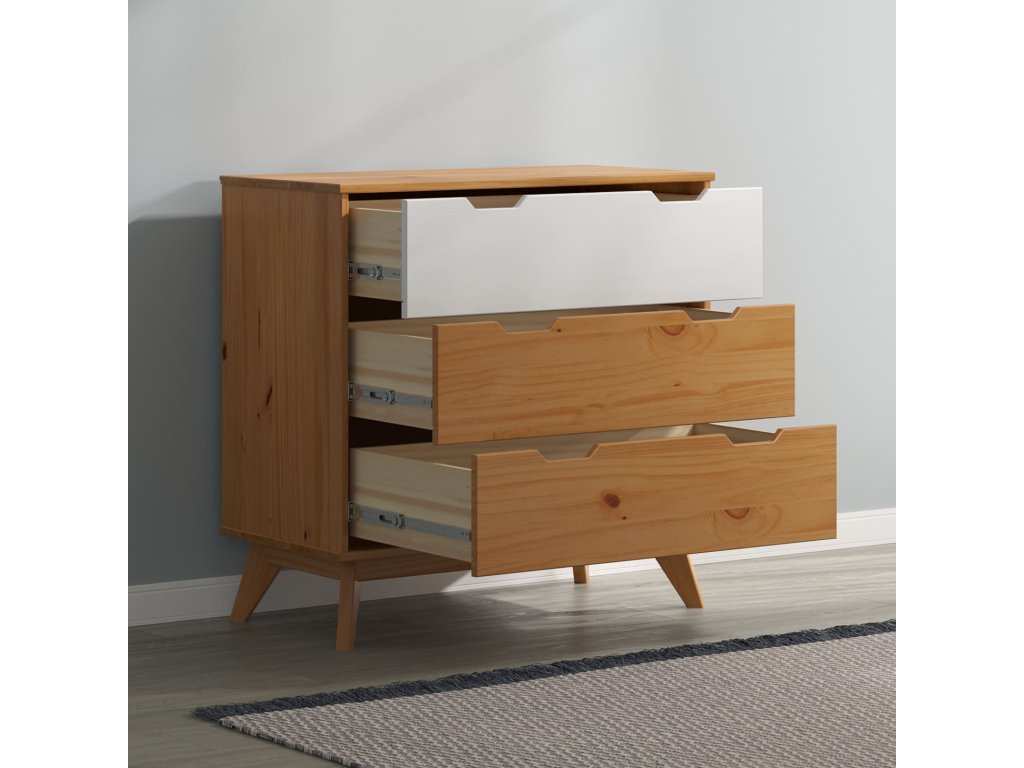 Elegantná komoda v škandinávskom dizajne je vyrobená z kvalitného borovicového dreva z udržateľného lesníctva s certifikátom FSC®, ktoré sa vyznačuje svojou dlhou životnosťou a udržateľnosťou. Vďaka prírodne upravenému povrchu a kresbe dreva je robí každú komoda jedinečná. Frézované zapustené úchyty podčiarkujú moderný charakter nábytku. Tri veľké, priestranné zásuvky ponúkajú skvelé úložné riešenie. Komodu je možné zaťažiť celkom 45 kg. Nerezové koľajničky s hladkým chodom zaisťujú veľmi ľahké otváranie a zatváranie zásuviek. Kónicky tvarované nožičky z masívneho dreva zaisťujú stabilitu a bezpečnú oporu. Pre ešte väčšiu bezpečnosť má komoda možnosť upevnenia v zadnej časti, aby sa dala pripojiť k stene. Vďaka vysokokvalitnému drevu je komoda obzvlášť odolná a ľahko sa udržiava.