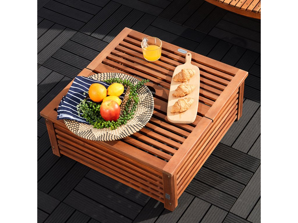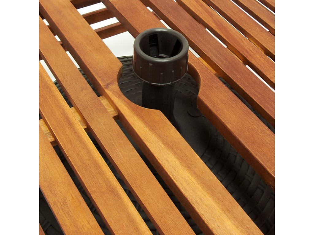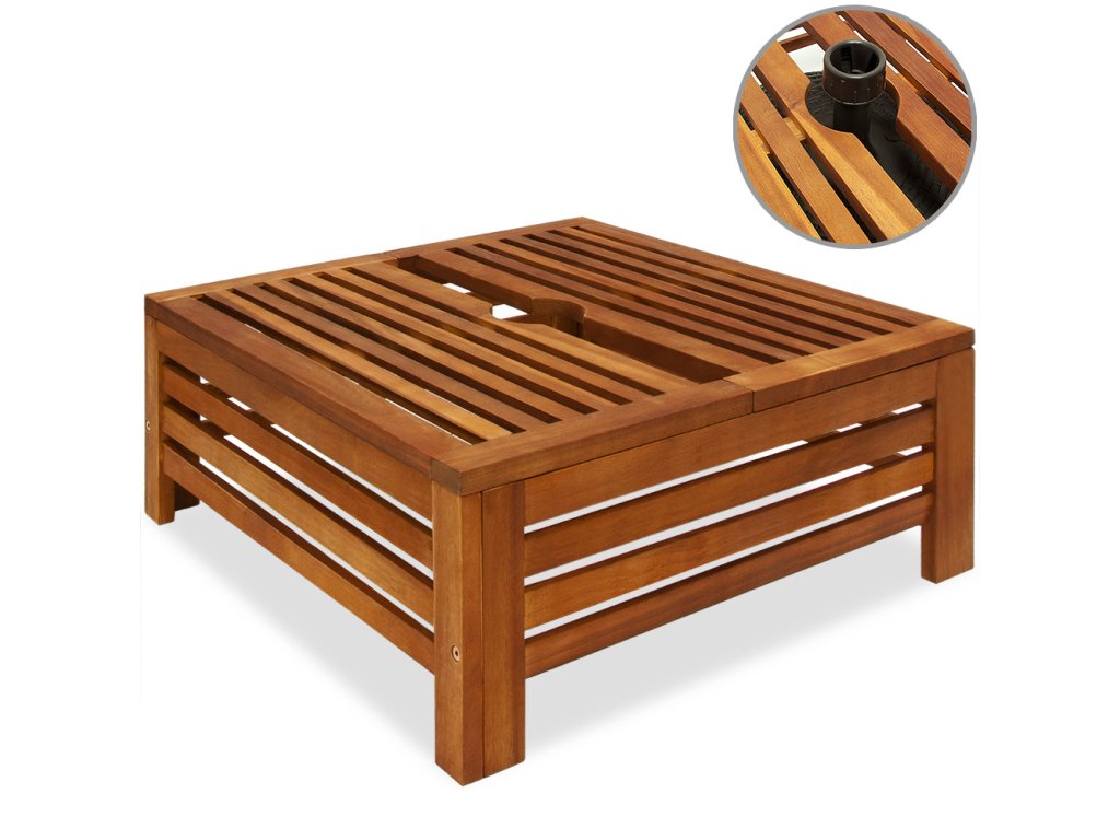 Kryt stojanu na slnečníka nielen elegantne zakryje stojany, ale zároveň pridá vašej záhrade štýl a praktickosť. Poskytuje extra úložný priestor na kvety, dekorácie či nápoje a môže slúžiť aj ako praktický odkladací stolík. Je vyrobený z odolného agátového dreva a je odolný nielen voči poveternostným vplyvom, ale tiež pôsobí ako atraktívny doplnok na záhrade, balkóne alebo na terase. Pre zachovanie intenzívnej farby a dlhej životnosti odporúčame pravidelne ošetrovať drevo špeciálnym olejom na záhradný nábytok.