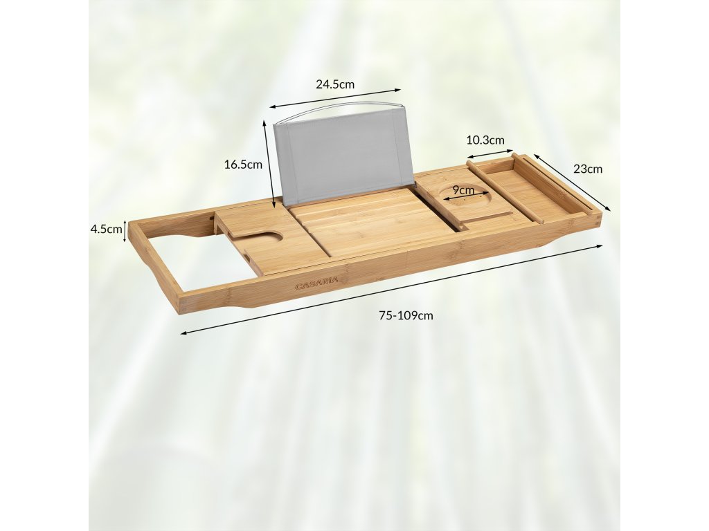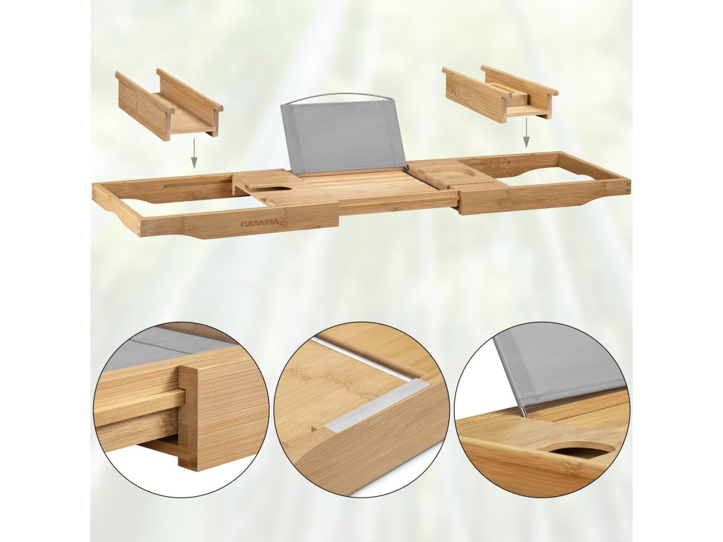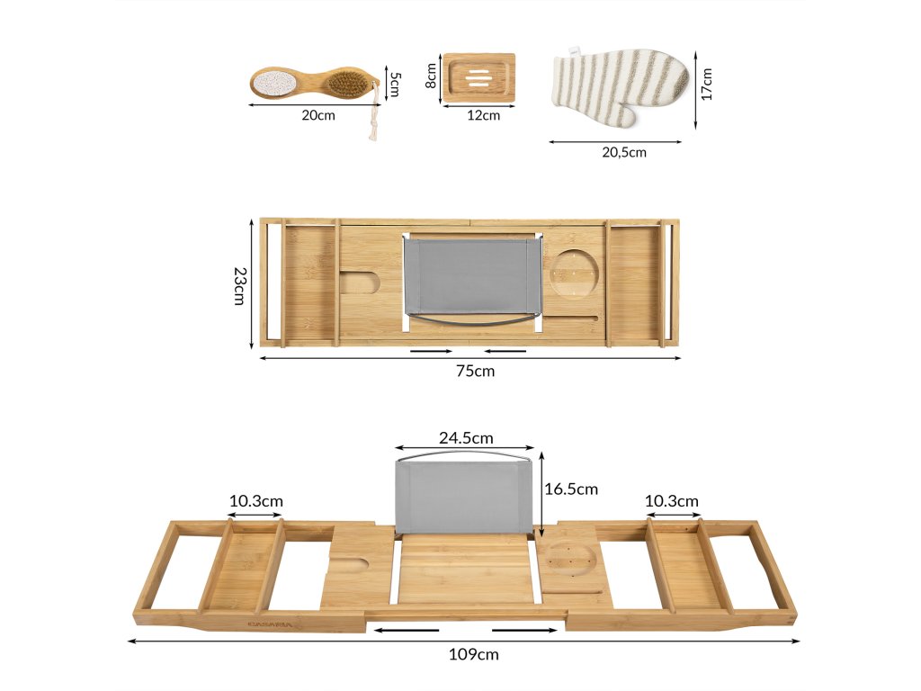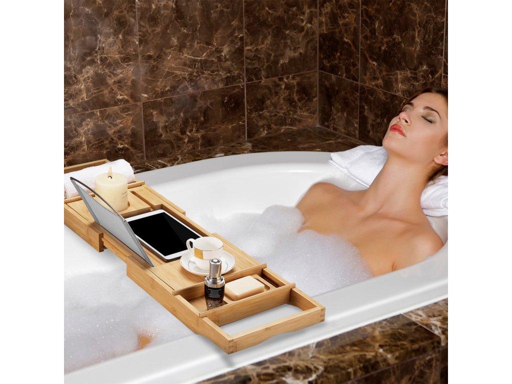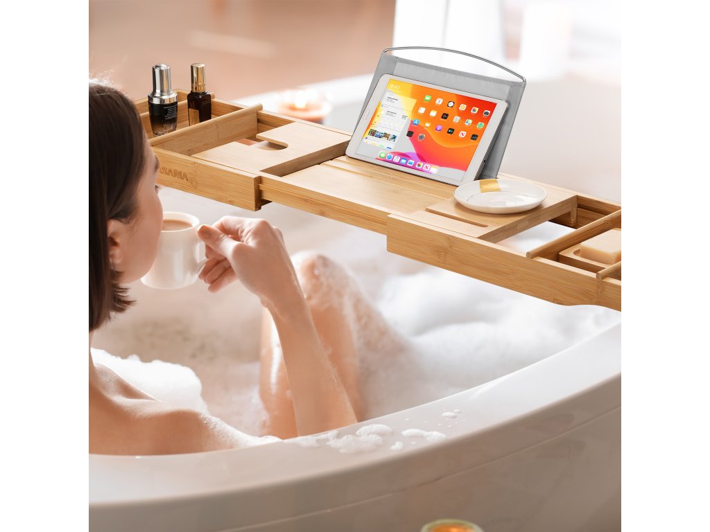 Praktická a multifunkčná vaňová polička z prírodného bambusového dreva je ideálna pre každého, kto si chce oddýchnuť v kúpeli. Štýlová polica sa prispôsobí každej veľkosti vane a dá sa predĺžiť od 75 - 109 cm. Počas kúpania môžete na tácku umiestniť občerstvenie, nápoje, sviečky a potreby na kúpanie. Vďaka sklopnej podpere a 2 stojacim drážkam bude váš tablet, kniha alebo smartfón bezpečne držaný na svojom mieste. Polička má obzvlášť praktický držiak na poháre. Nechýbajú ani odnímateľné držiaky na mydlo a uteráky. Súčasťou dodávky je aj nástroj na starostlivosť o nohy 4v1 a umývacia rukavica. Vaničku je možné zaťažiť až 3 kg .