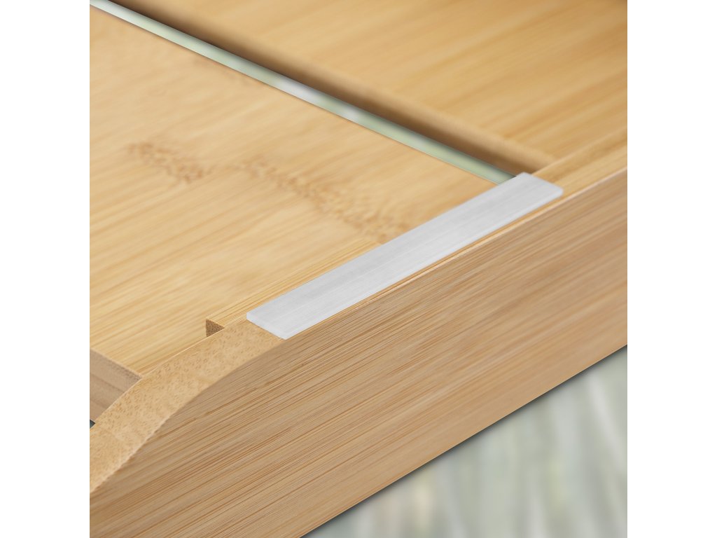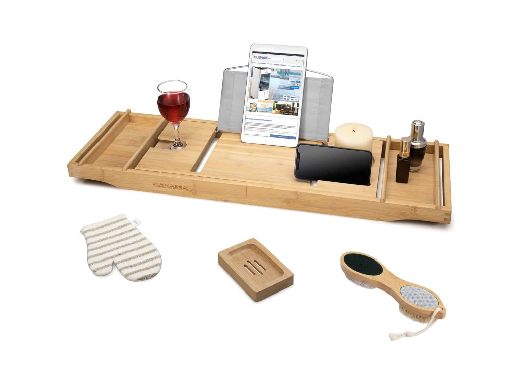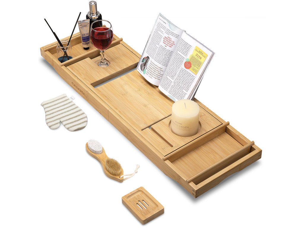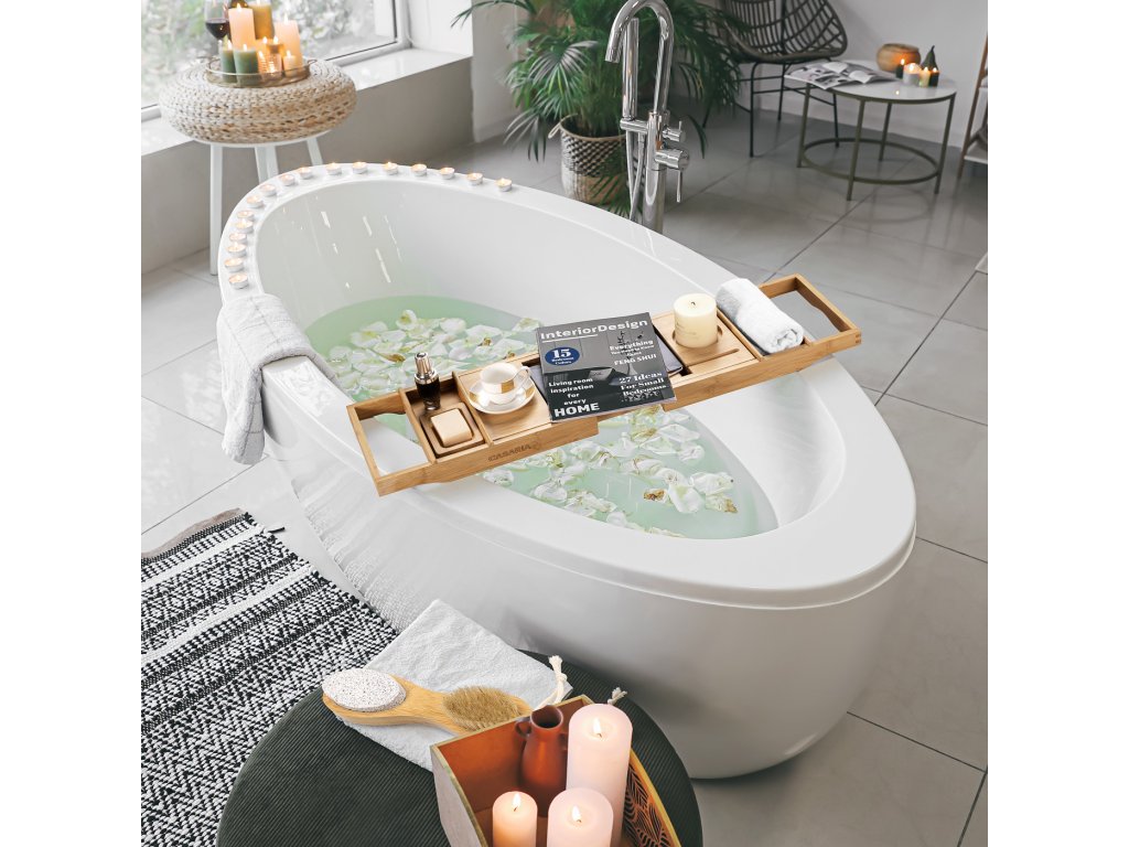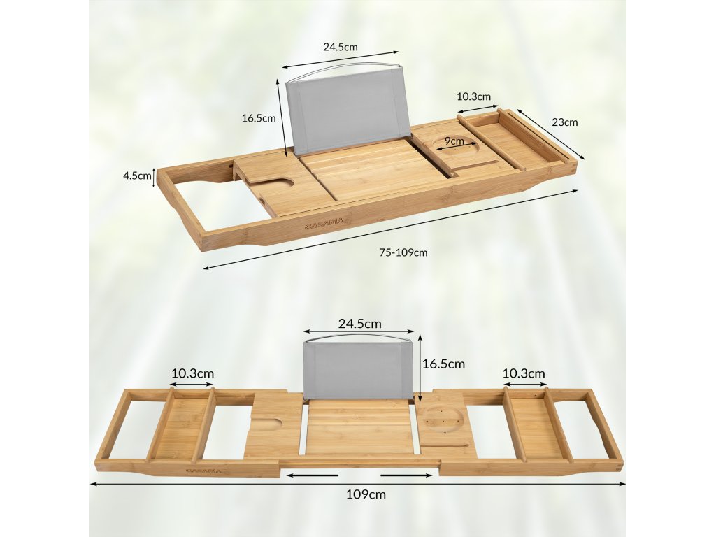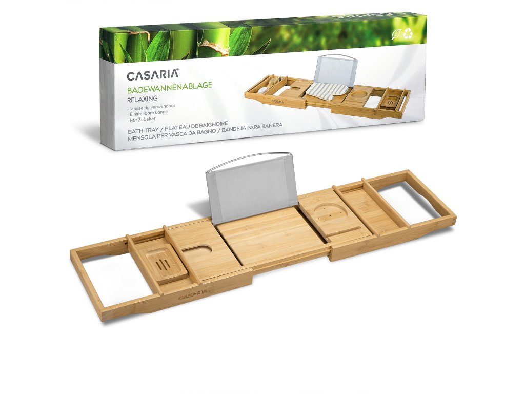 Praktická a multifunkčná vaňová polička z prírodného bambusového dreva je ideálna pre každého, kto si chce oddýchnuť v kúpeli. Štýlová polica sa prispôsobí každej veľkosti vane a dá sa predĺžiť od 75 - 109 cm. Počas kúpania môžete na tácku umiestniť občerstvenie, nápoje, sviečky a potreby na kúpanie. Vďaka sklopnej podpere a 2 stojacim drážkam bude váš tablet, kniha alebo smartfón bezpečne držaný na svojom mieste. Polička má obzvlášť praktický držiak na poháre. Nechýbajú ani odnímateľné držiaky na mydlo a uteráky. Súčasťou dodávky je aj nástroj na starostlivosť o nohy 4v1 a umývacia rukavica. Vaničku je možné zaťažiť až 3 kg .