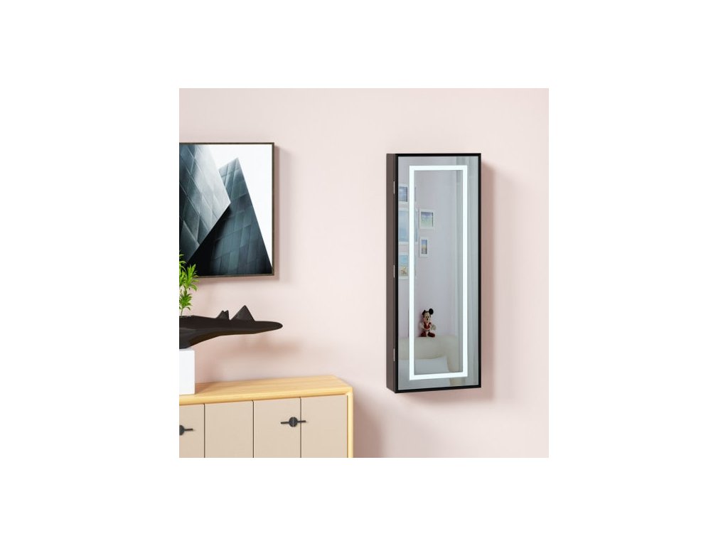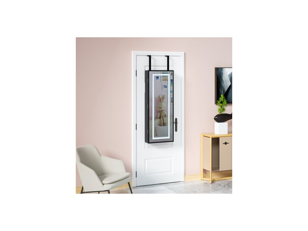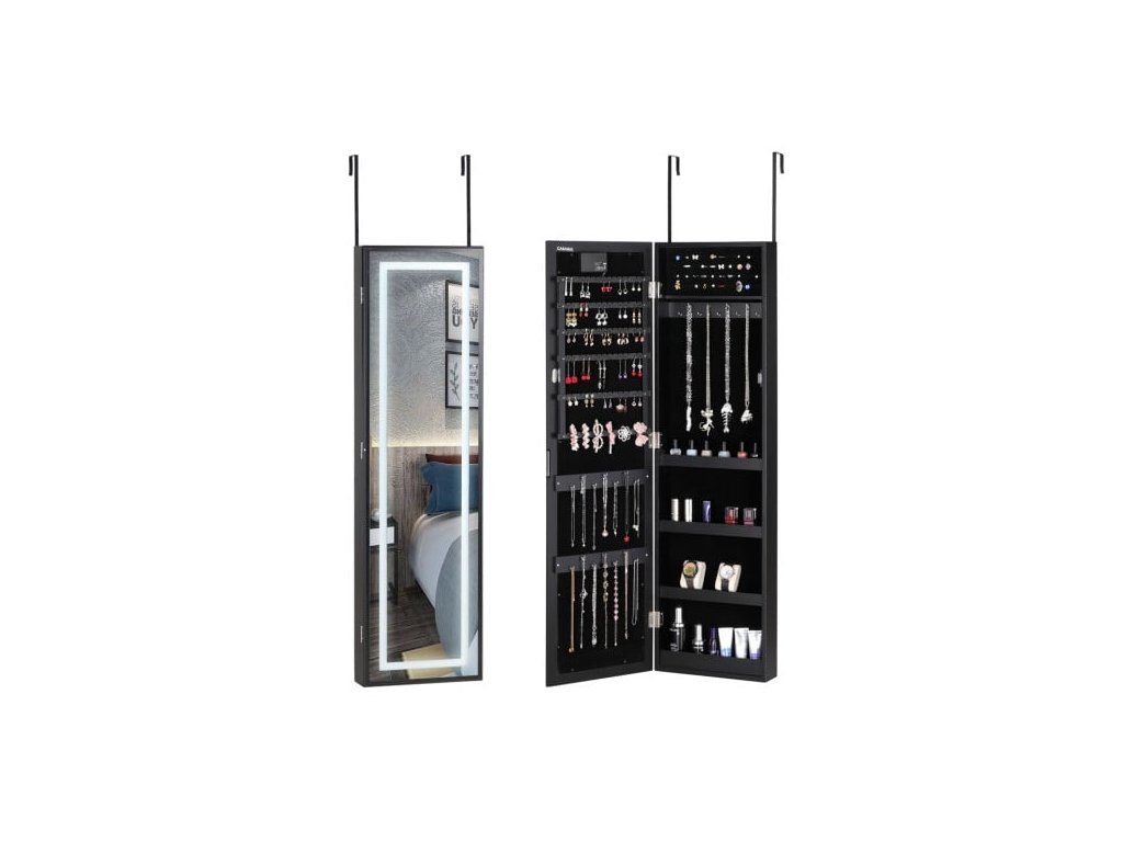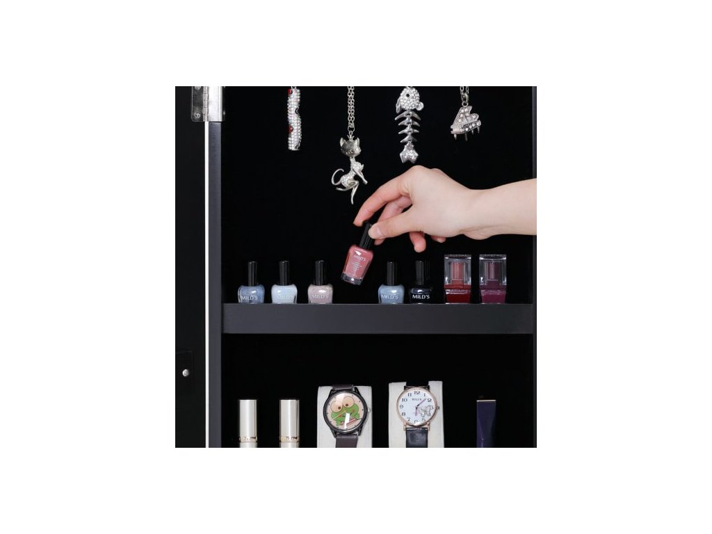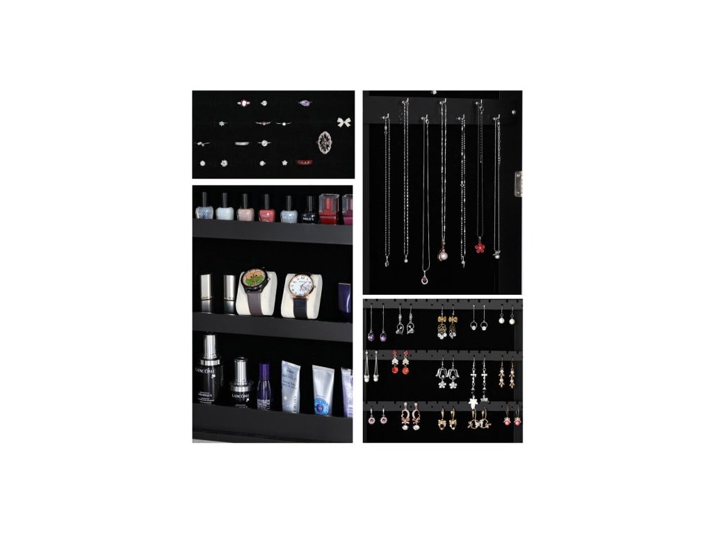 Skrinka na šperky vybavená zrkadlom ponúka dostatok miesta pre všetky vaše milované šperky. Vďaka rôznym háčikom a priehradkám budete môcť svoje šperky, ako sú prstene, náhrdelníky, hodinky, náramky alebo iné doplnky uložiť úhľadne, bezpečne a tým ich ochránite pred prachom. Magnetický uzáver na dvierka drží skrinku pevne uzavretú. Mäkký zamatový obal vo vnútri skrinky tiež chráni vaše vzácne šperky pred poškriabaním. Vďaka priloženému držiaku na dvere možno skrinku na šperky jednoducho zavesiť cez rám dverí. Vďaka tomu je skrinka flexibilná. Integrované LED osvetlenie na prednej strane zrkadla obzvlášť rozžiari vaše šperky. LED osvetlenie možno jednoducho zapínať a vypínať pomocou batériového vypínača vo vnútri.