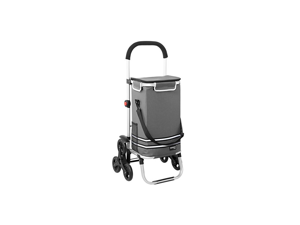 Nákupný vozík ponúka veľa úložného priestoru, Použite vozík ako nákupnú pomôcku, praktickú tašku cez rameno ako malý ručný vozík. Pomocou integrovaných háčikov sa dá jednoducho pripevniť k nákupnému košíku. Odnímateľná taška je vyrobená z hustej a robustnej tkaniny Oxford 600D. Veľká vnútorná chladiaca taška ponúka optimálnu ochranu pred slnečným žiarením pre chladené produkty. Vozík má dve bočné vrecká a malé zadné vrecko na zips.