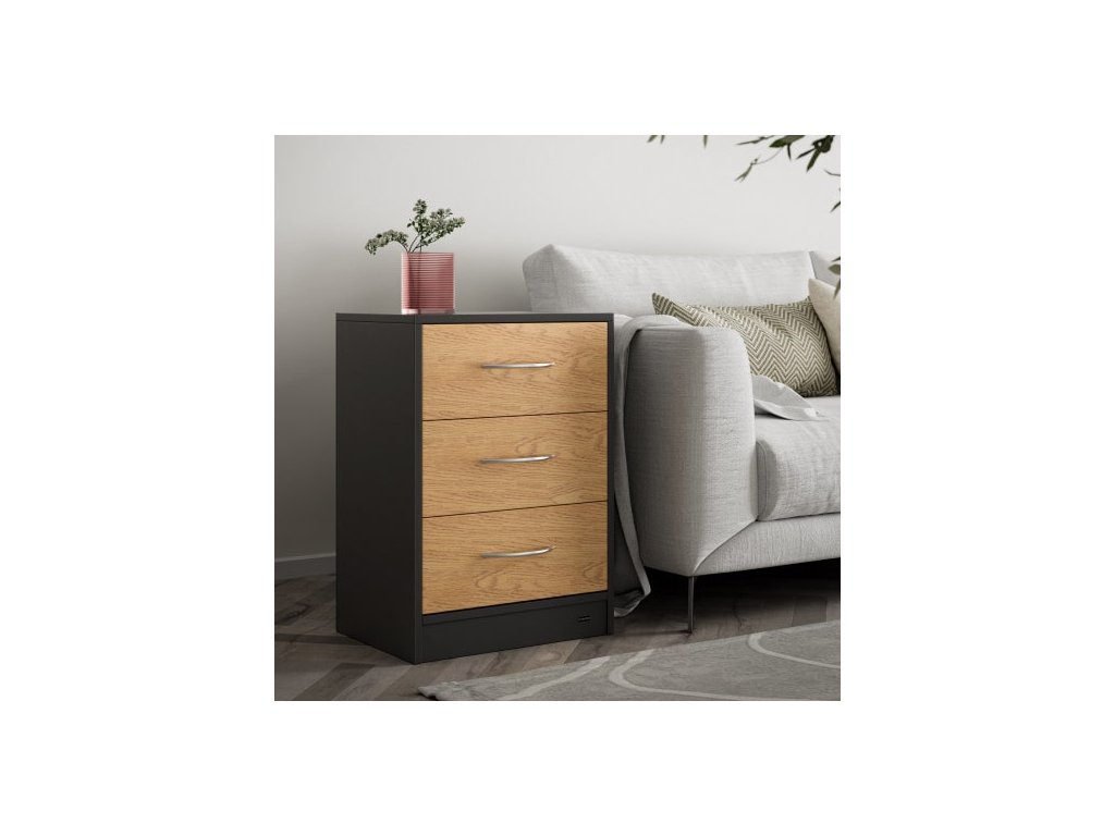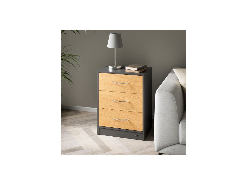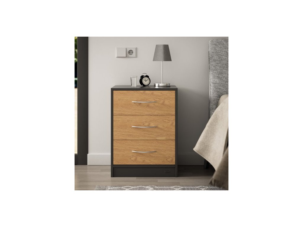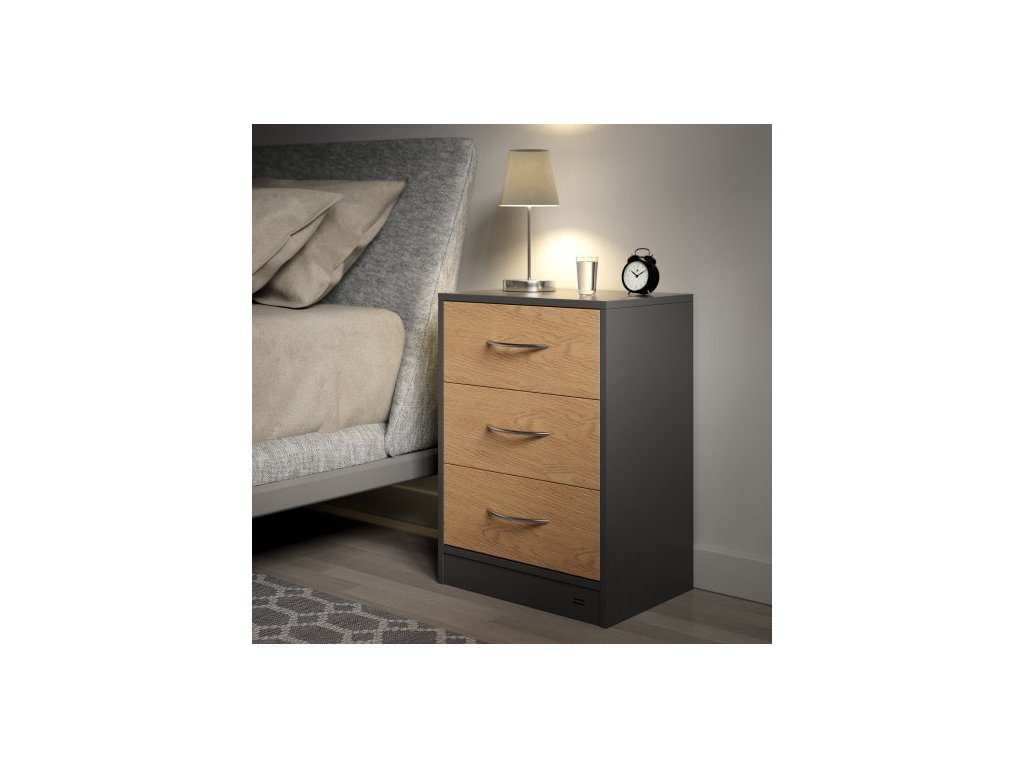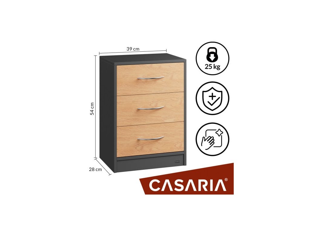 Elegantný nočný stolík Eloise perfektne zapadne do vášho interiéru. Tri zásuvky s hladkým chodom s chrómovými úchytkami, každá s objemom 5 litrov, poskytujú dostatok úložného priestoru. Na hornej poličke je dostatok miesta pre budík, knihu, nočnú lampu a mnoho ďalšieho. Pre väčšiu bezpečnosť môžete nočný stolík jednoducho pripevniť na stenu pomocou zámku na zadnej časti. Stolík s praktickými chráničmi podlahy je vyrobená z odolného MDF. Povrchy sa ľahko čistia vlhkou handričkou.