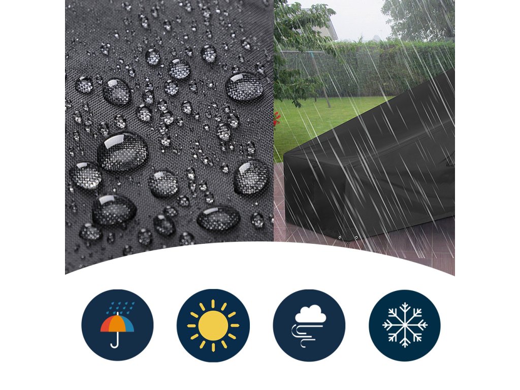 Celoročná ochrana pred poveternostnými vplyvmi. Vysokokvalitný kryt je obzvlášť odolný proti roztrhnutiu a UV žiareniu. To zaisťuje dlhodobú ochranu vášho obľúbeného nábytku. Vnútorný PU náter zabezpečuje vodoodpudivosť. Tvorbe plesní zabraňujú dve vetracie okná, takže sa nemôže vytvárať zatuchnutý zápach. Šnúra je upevnená pomocou upevňovacej spony a je možné ju utiahnuť. Prídavné suché zipsy s dvojitými švami sú vhodné na pripevnenie na kus nábytku. Kryt je veľmi tesný aj pri silnom vetre. Povrchové nečistoty je možné z krytu odstrániť vlhkou handričkou.