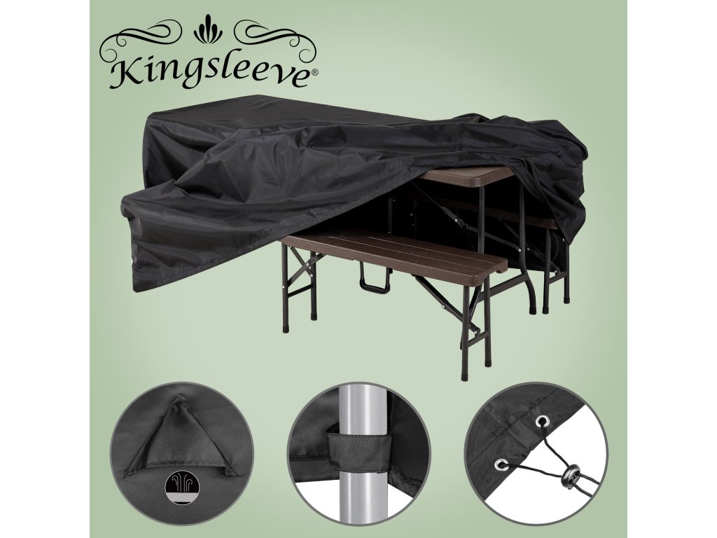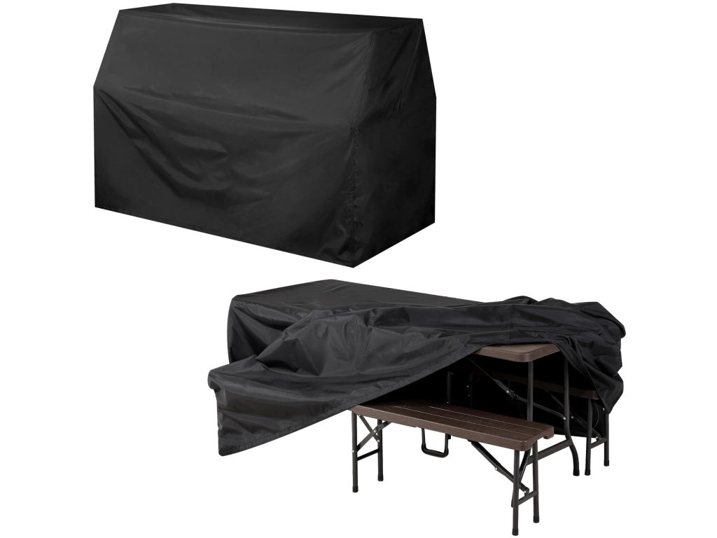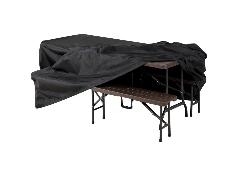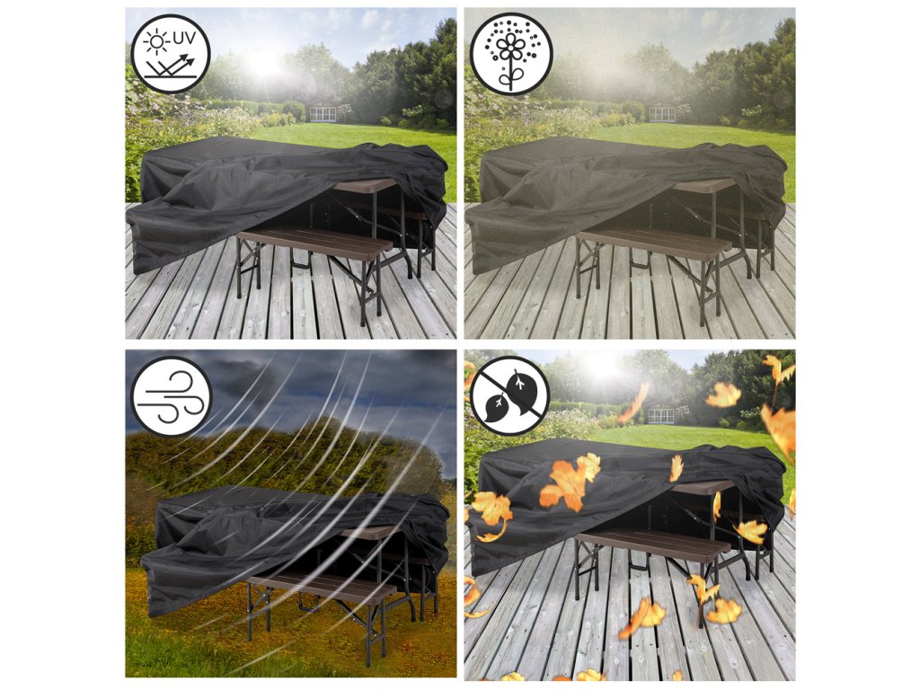 Kryt ochráni váš nábytok alebo pivný set pred prachom, lístím, špinou, peľom, zvieracími nečistotami, vetrom a UV žiarením. Poťah odolný voči UV žiareniu je vyrobený z hustého polyesteru (200 g/m²). Dve vetracie okienka zabraňujú vzniku nepríjemnému zápachu alebo plesni. Ochranný kryt má upevňovaciu šnúru a suché zipsy, ktoré slúžia na upevnenie na kus nábytku. Vďaka tomu zostane kryt pevne na svojom mieste aj pri silnom vetre. Povrchové nečistoty je možné z krytu okamžite odstrániť vlhkou handričkou.