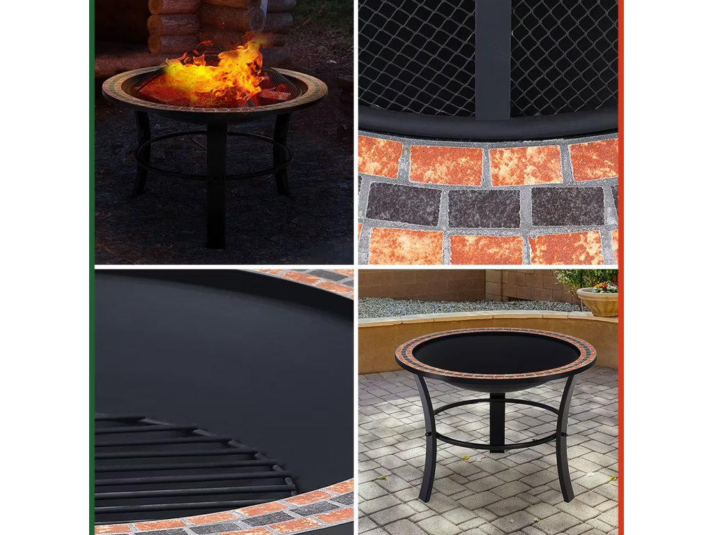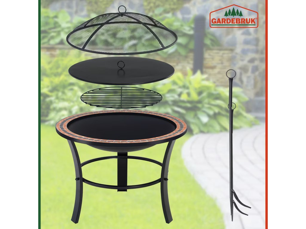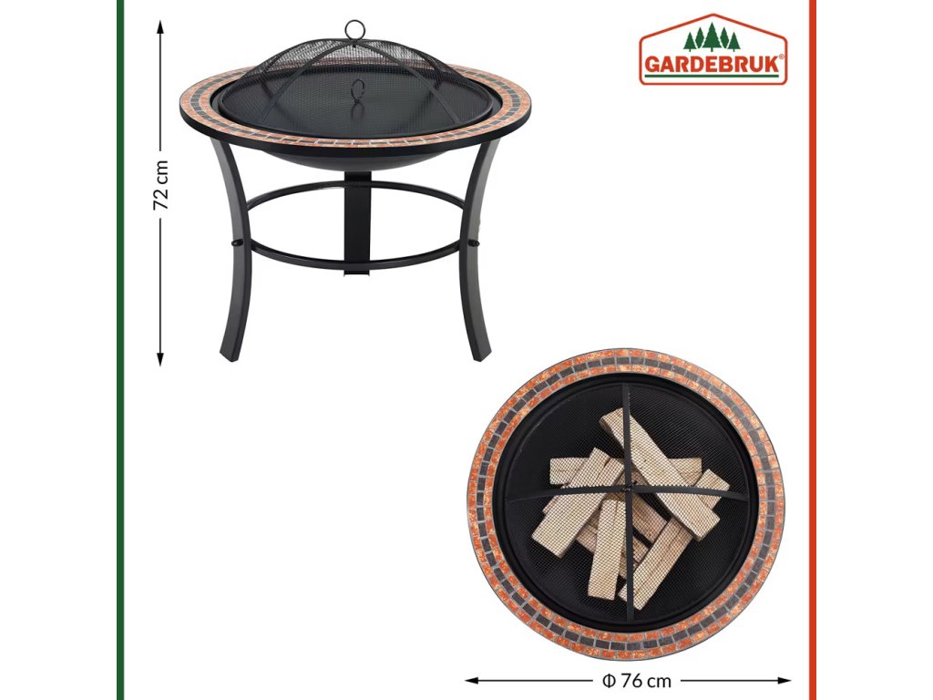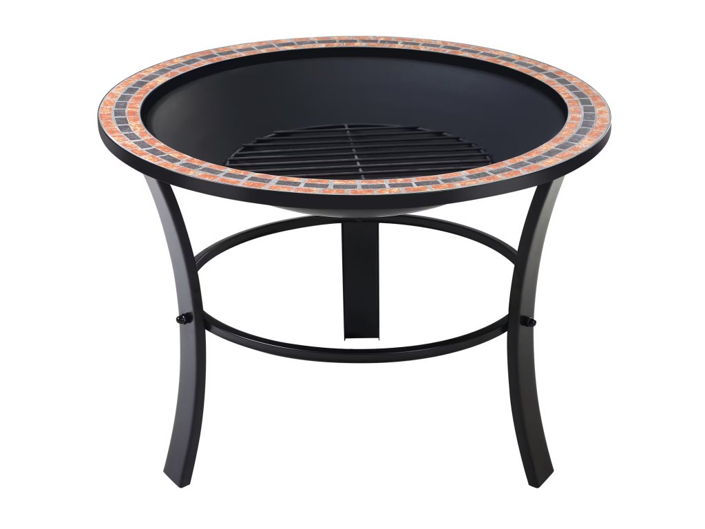 Ohnisko zdobia skutočné mozaikové kamienky, ktoré vytvárajú extravagantný vzhľad. Rám ohniska je vyrobený z práškovo lakovanej ocele a má Ø 76 cm. Vďaka praktickému krytu možno ohnisko použiť aj ako odkladací stolík a taktiež ochráni proti dažďu, lístiu a nežiadúcemu lietaniu popola.