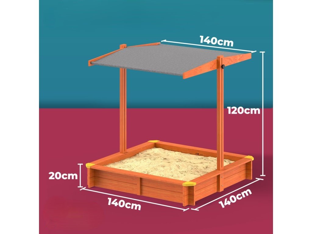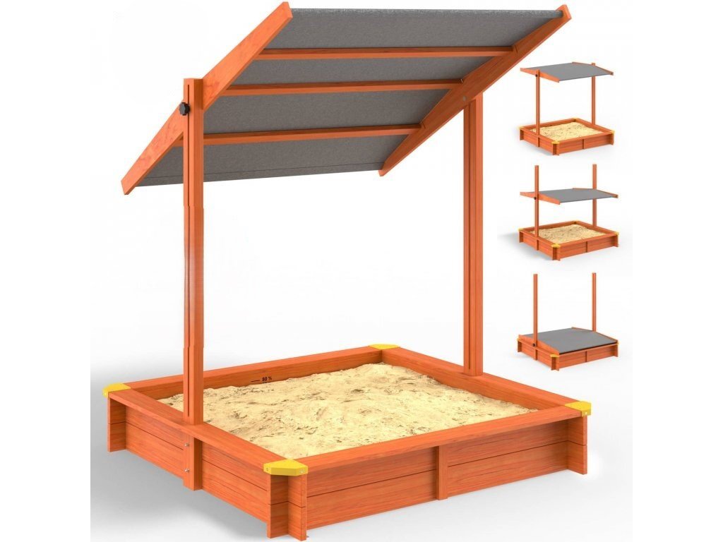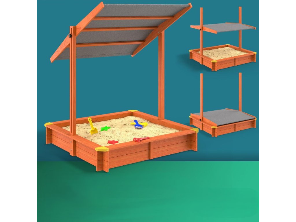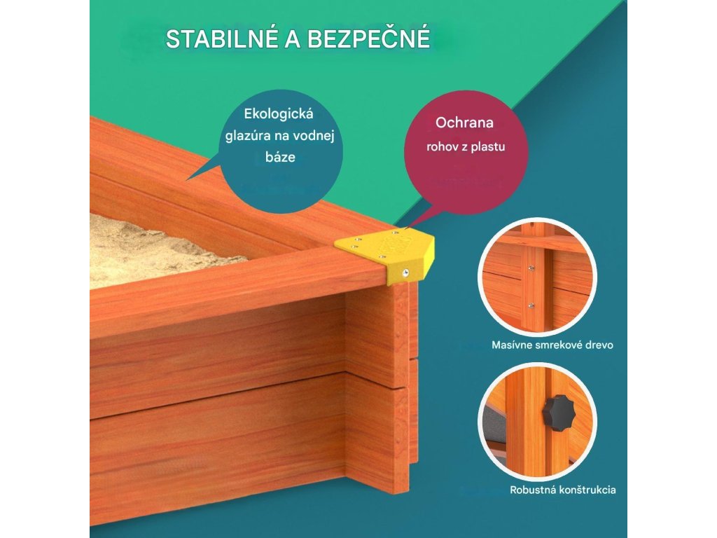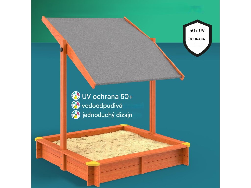Pieskovisko je vyrobené z masívneho smrekového dreva ošetreného ekologickou lazúrou. Strieška je výškovo nastaviteľná, otočná, ponúka ochranu UV 50+ a tiež chráni pred miernym mrholením. Podlahová rohož izoluje podlahu a chráni piesok pred nečistotami. Na ochranu pred vlhkosťou alebo v noci sa strieška dá spustiť pomocou vodiacej lišty pri uvoľnení skrutky. Zaoblené hrany s kvalitnými plastovými rohmi robia pieskovisko ešte bezpečnejšie pre deti. Vypálená stupnica ukazuje optimálnu úroveň naplnenia pieskom v %.