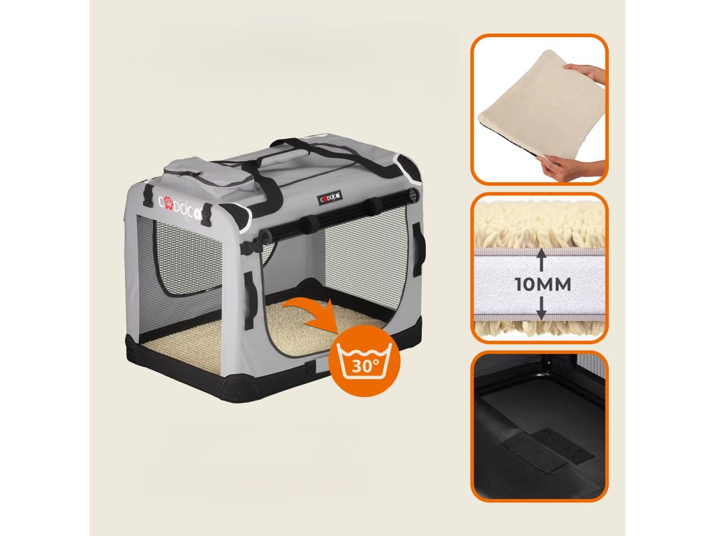 Vnútorná časť tašky je vybavená mäkkou dekou, ktorá poskytuje vášmu miláčikovi pohodlné a útulné miesto na oddych. Veľké sieťované panely na všetkých štyroch stranách zabezpečujú dostatočné vetranie a prívod vzduchu. Horné, predné a bočné otvory so zipsami umožňujú jednoduchý prístup dovnútra i von. Dve priestranné vrecká sú ideálne na uskladnenie maškŕt a hračiek počas výletov k veterinárovi alebo na dovolenku. Vďaka skladacej oceľovej konštrukcii je tašku možné rýchlo zložiť a rozložiť, čo uľahčuje jej uskladnenie a šetrí miesto. Taška je vyrobená z odolného materiálu 600D Oxford, ktorý je ľahko udržiavateľný. Deku so suchým zipsom možno jednoducho odstrániť a prať pri 30°C. Vďaka kvalitnému spracovaniu Vám a Vášmu štvornohému priateľovi táto taška poskytne dlhodobé potešenie.