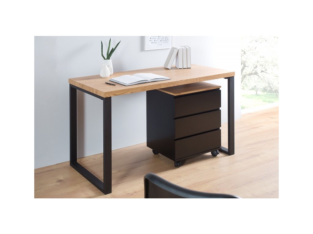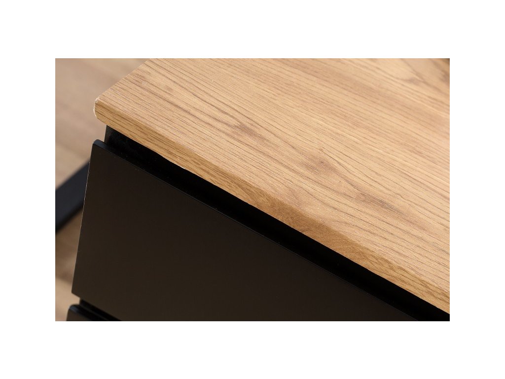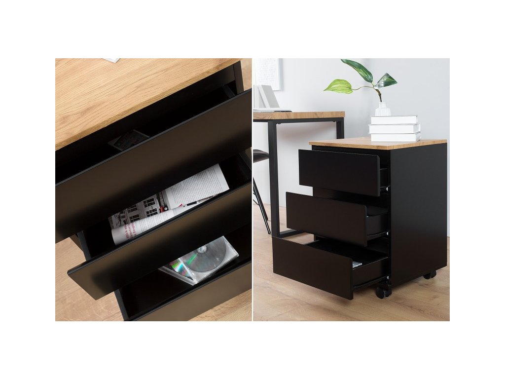 Praktický príručný stolík so zásuvkami, ktorý sa perfektne hodí k pracovné stolu. Tri zásuvky poskytujú dostatok úložného priestoru na všetky dokumenty a ostatné veci, ktoré chcete mať po ruke. Pre jednoduchšiu manipuláciu sú na spodnej časti stolíka upevnené kolieska. Stolík v čiernej matnej farbe s dubovým vzhľadom zapadne do každej pracovne či kancelárie.