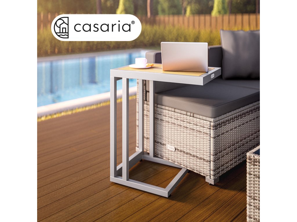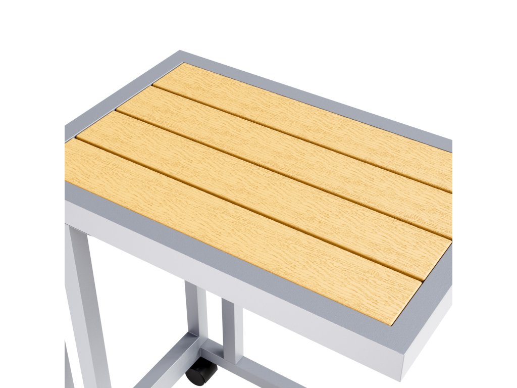 Tento štýlový stolík má jednoduchý tvar, ktorý sa prispôsobí akémukoľvek štýlu bývania. Príručný stolík je vďaka materiálom odolným voči poveternostným vplyvom ideálnym spoločníkom do záhrady ale napríklad aj vedľa pohovky v obývacej izbe. Priestorovo úsporný a mobilný stolík s oceľovým rámom v tvare C možno ľahko zasunúť pod pohovku alebo posteľ. Disponuje 4 kolieskami z ktorých dve sa dajú zablokovať brzdou a uľahčujú tak tlačenie. V prípade potreby je možné kolieska nahradiť 4 výškovo nastaviteľnými nožičkami. Vďaka doske stola vyrobenej z WPC - drevo-plastovej zmesi odolnej voči poveternostným vplyvom je stolík vhodný aj na vonkajšie použitie. Je nenáročný na údržbu, dá sa ľahko čistiť vlhkou handričkou a rýchlo a jednoducho sa nastavuje.