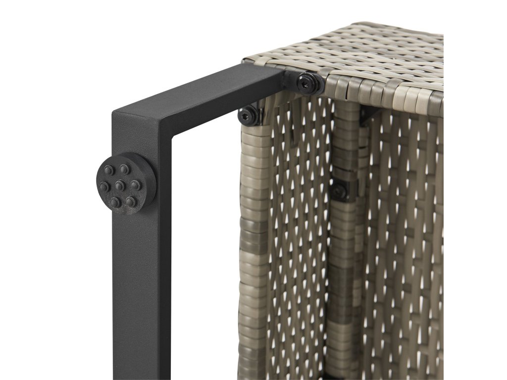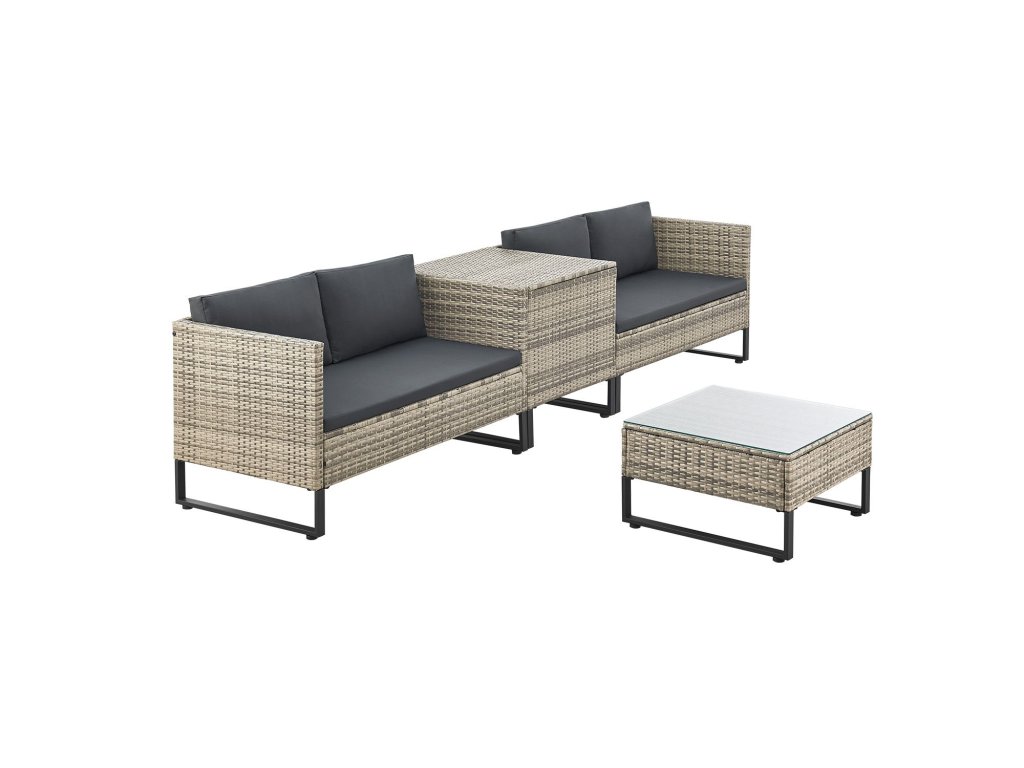 Záhradná zostava pre 4 osoby je ideálna pre každú záhradu a terasu. Modulárne prvky pozostávajúce zo stolíka, úložného boxu a 2 lavíc je možné ľubovoľne kombinovať. Takto si môžete svoj vonkajší priestor navrhnúť úplne individuálne. Vďaka oceľovému rámu s práškovým nástrekom a robustnému polyratanovému výpletu je zostava odolná voči poveternostným vplyvom a má dlhú životnosť.
