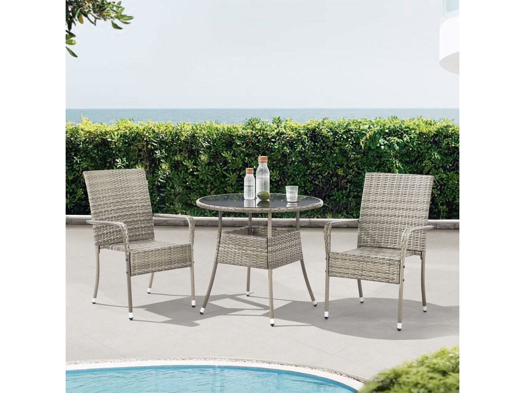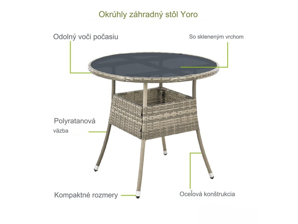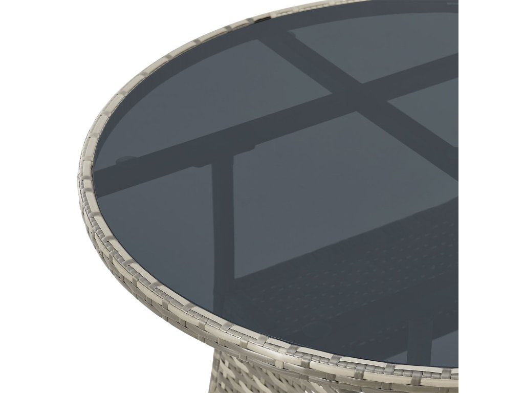 Okrúhly záhradný stôl Yoro v šedej farbe je dokonalým kusom nábytku na dotvorenie vášho balkóna či záhrady. Je vyrobený z kvalitného polyratanu odolného voči poveternostným vplyvom. Stôl má oceľový rám s práškovým nástrekom a dosku stola z bezpečnostného skla, vďaka čomu je robustný a odolný. Ponúka dostatok miesta na nápoje, občerstvenie alebo dekoratívne prvky a ľahko sa čistí. Vďaka nízkej hmotnosti a kompaktným rozmerom je stôl všestranný a mobilný a napriek tomu ponúka dostatok priestoru.