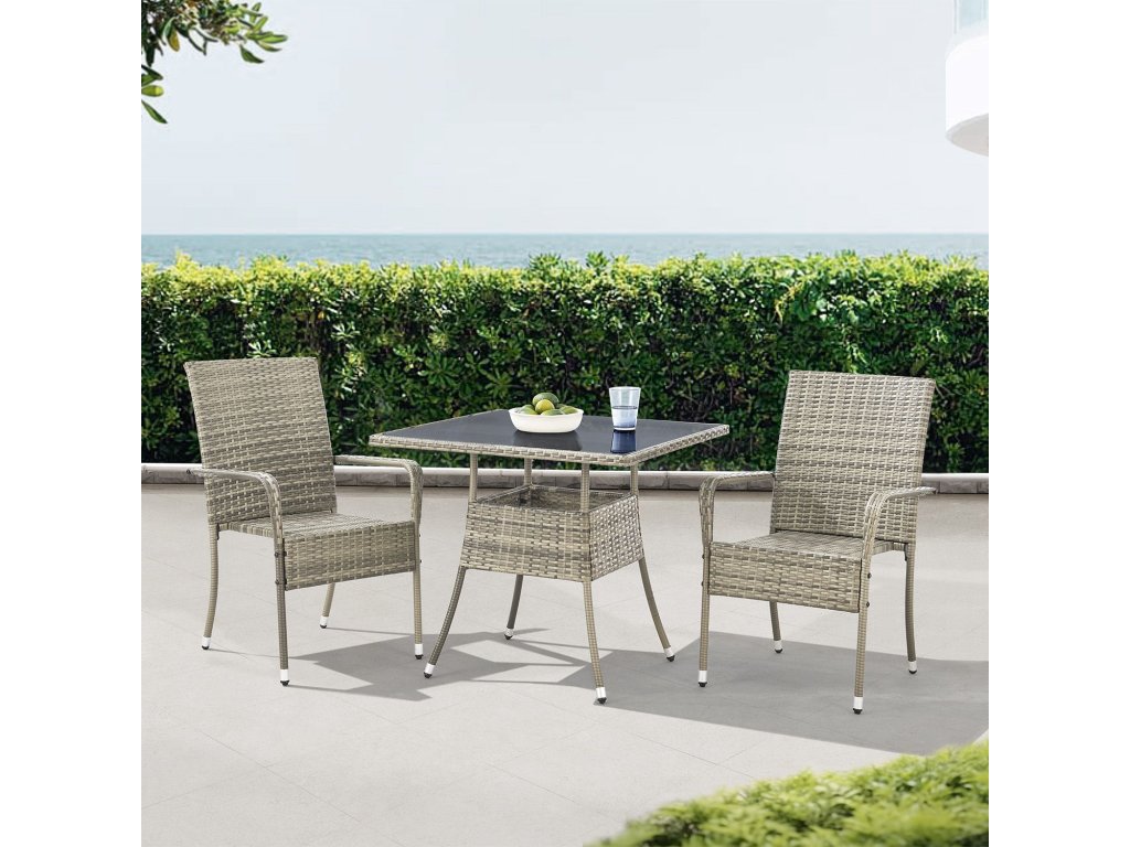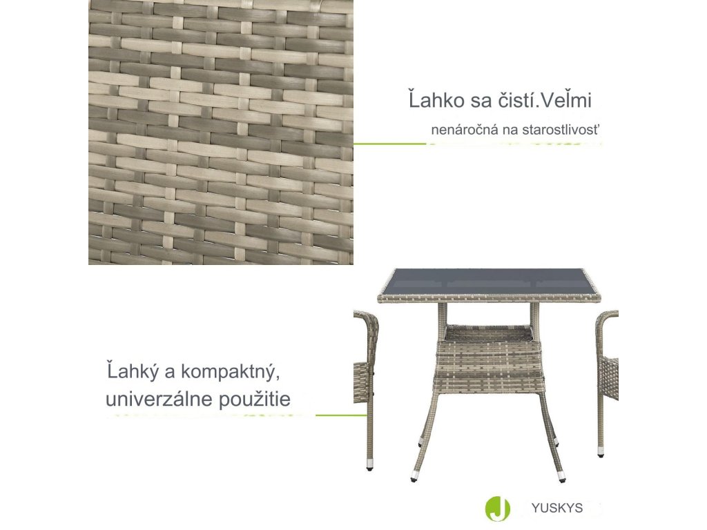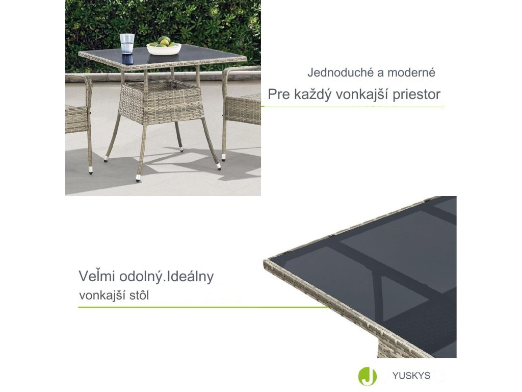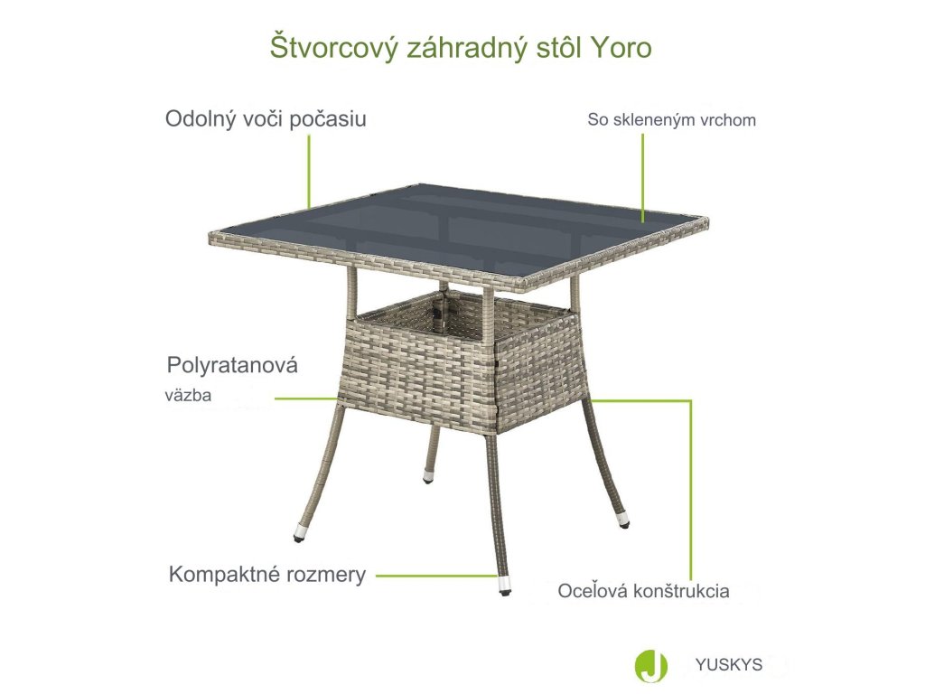 Štvorcový záhradný stôl Yoro v šedej farbe je dokonalým kusom nábytku na dotvorenie vášho balkóna či záhrady. Je vyrobený z kvalitného polyratanu odolného voči poveternostným vplyvom. Stôl má oceľový rám s práškovým nástrekom a dosku stola z bezpečnostného skla, vďaka čomu je robustný a odolný. Ponúka dostatok miesta na nápoje, občerstvenie alebo dekoratívne prvky a ľahko sa čistí. Vďaka nízkej hmotnosti a kompaktným rozmerom je stôl všestranný a mobilný a napriek tomu ponúka dostatok priestoru.