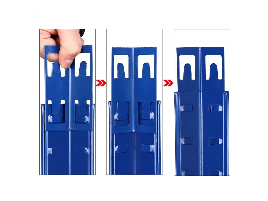 Vďaka inteligentnému zásuvnému systému bez skrutiek je montáž a demontáž regálu jednoduchšia ako pri skrutkovacích regáloch. Regál je možné flexibilne nastaviť, to znamená, že si môžete ľubovoľne zvoliť vzdialenosti medzi jednotlivými poschodiami. Zároveň je možné regál zabudovať do jedného vysokého odkladacieho regálu alebo dvoch polovysokých odkladacích regálov. Tento regál je teda možné využiť aj ako pracovný stôl a je možné ho použiť samostatne alebo v kombinácii s inými policami rovnakého typu na rozšírenie úložného priestoru. Chráňte svoju podlahu pred poškriabaním pomocou štyroch plastových nožičiek pre hornú a spodnú časť. Tento skladovací regál je možné rozložiť na kompaktnú veľkosť pre jednoduchú prepravu alebo skladovanie.