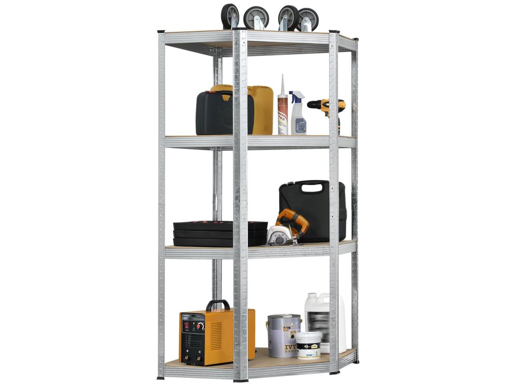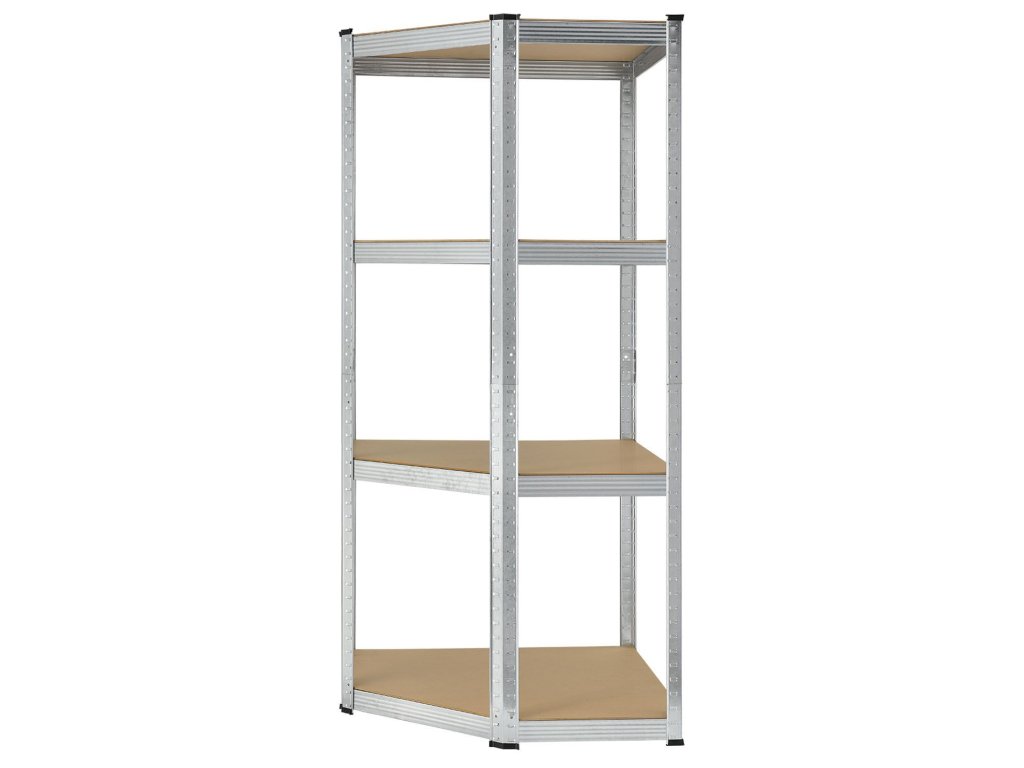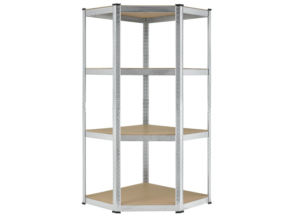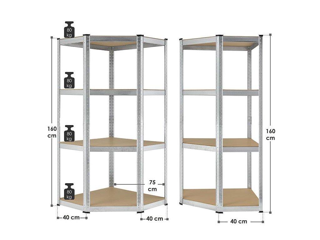 Rohový regál vyrobený z pozinkovaného kovu a MDF dreva poskytujú dostatok úložného priestoru na prehľadné uskladnenie náradia, záhradného príslušenstva, krabíc či šanónov. Regál je vybavený štyrmi úložnými úrovňami, pričom pri rovnomernom rozložení záťaže unesie každá polica 80 kg, čo znamená celkovú nosnosť 320 kg. Vzdialenosť medzi jednotlivými policami si môžete prispôsobiť podľa výšky uložených predmetov.