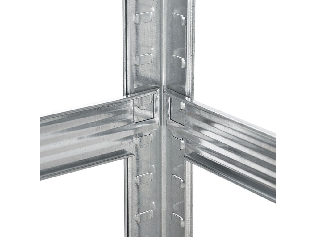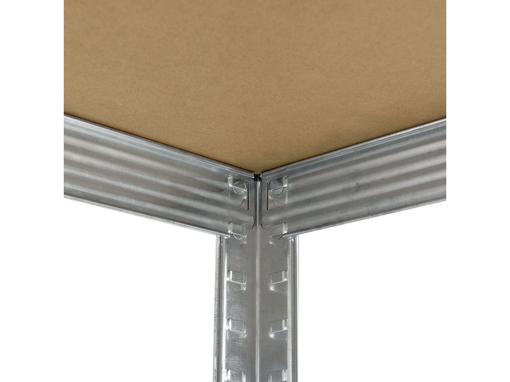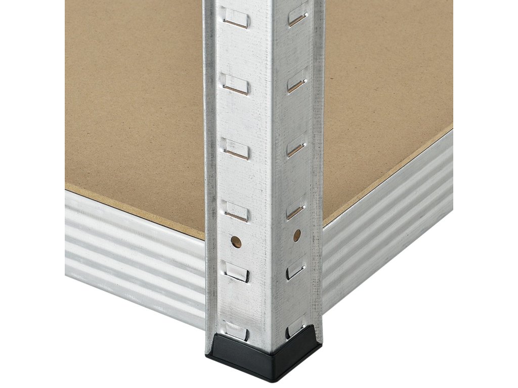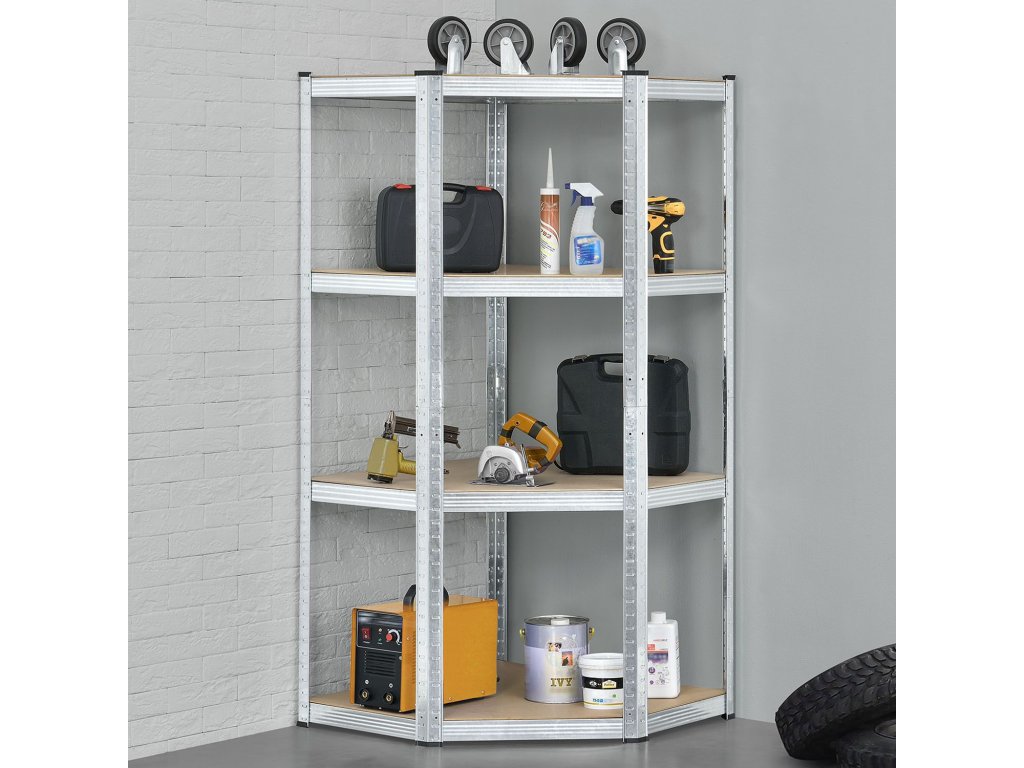 Rohový regál vyrobený z pozinkovaného kovu a MDF dreva poskytujú dostatok úložného priestoru na prehľadné uskladnenie náradia, záhradného príslušenstva, krabíc či šanónov. Regál je vybavený štyrmi úložnými úrovňami, pričom pri rovnomernom rozložení záťaže unesie každá polica 80 kg, čo znamená celkovú nosnosť 320 kg. Vzdialenosť medzi jednotlivými policami si môžete prispôsobiť podľa výšky uložených predmetov.