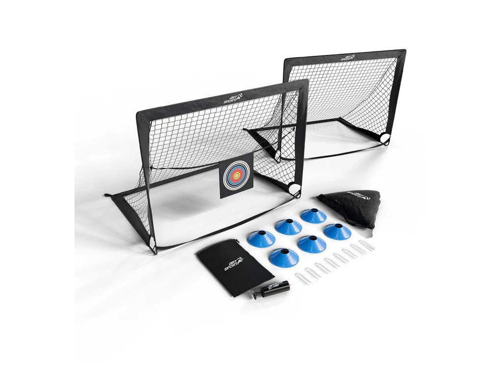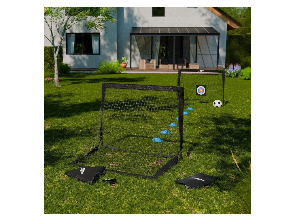 Vďaka dômyselnému skladaciemu systému sa dajú bránky postaviť v priebehu niekoľkých sekúnd a rovnako rýchlo aj odložiť, preto sú ideálne na hranie na cestách. Robustná konštrukcia zaisťuje stabilitu a odolnosť. Sada je vhodná pre všetky vekové kategórie a ponúka rôzne možnosti tréningu či už na tráve alebo asfalte. Súčasťou balenia je tiež príslušenstvo ako pumpa, terč, protišmyková podložka a tréningové kužele, aby bol váš tréning ešte pestrejší.Technické špecifikácie: