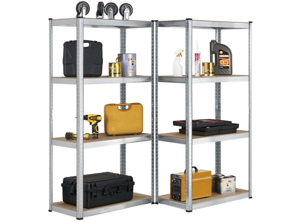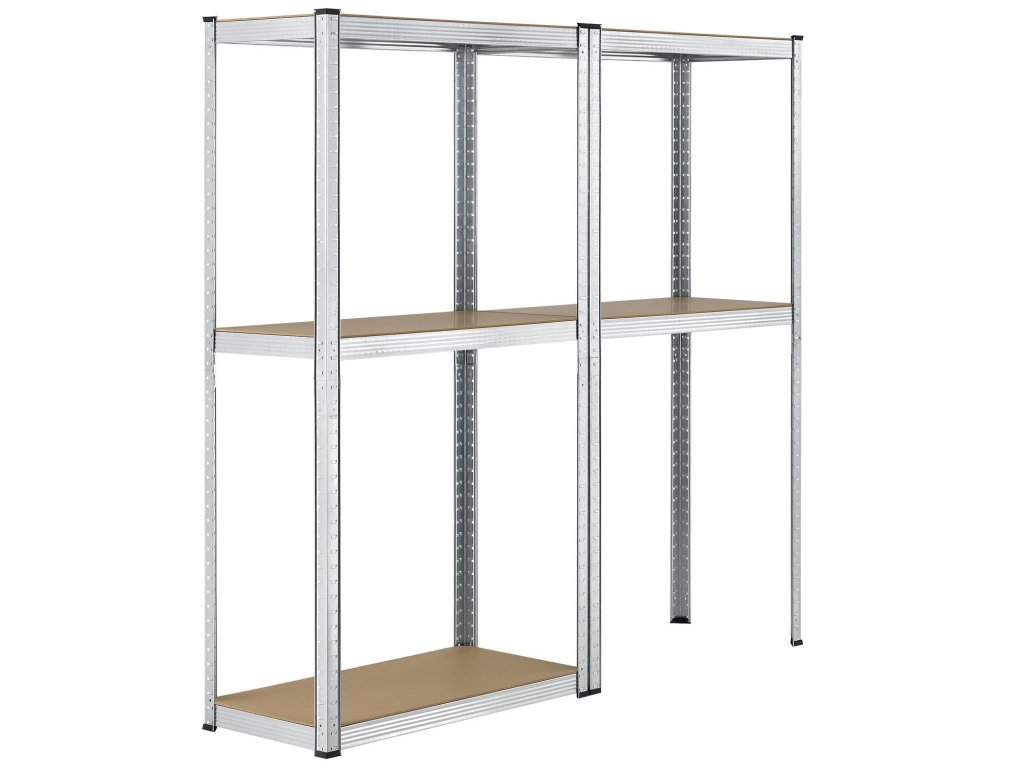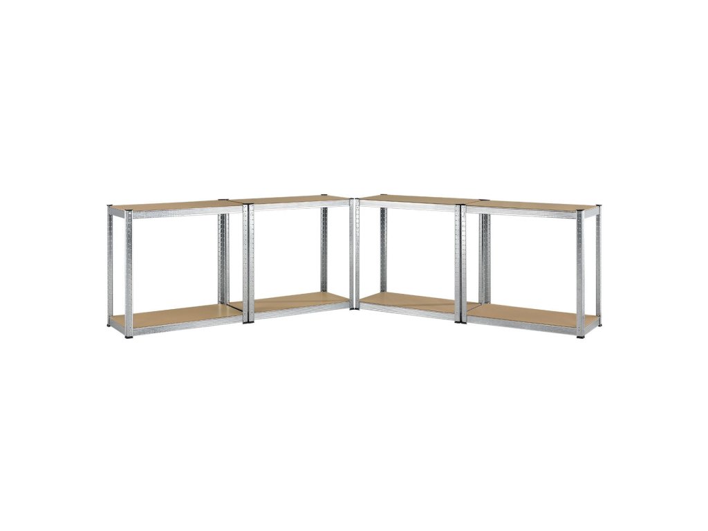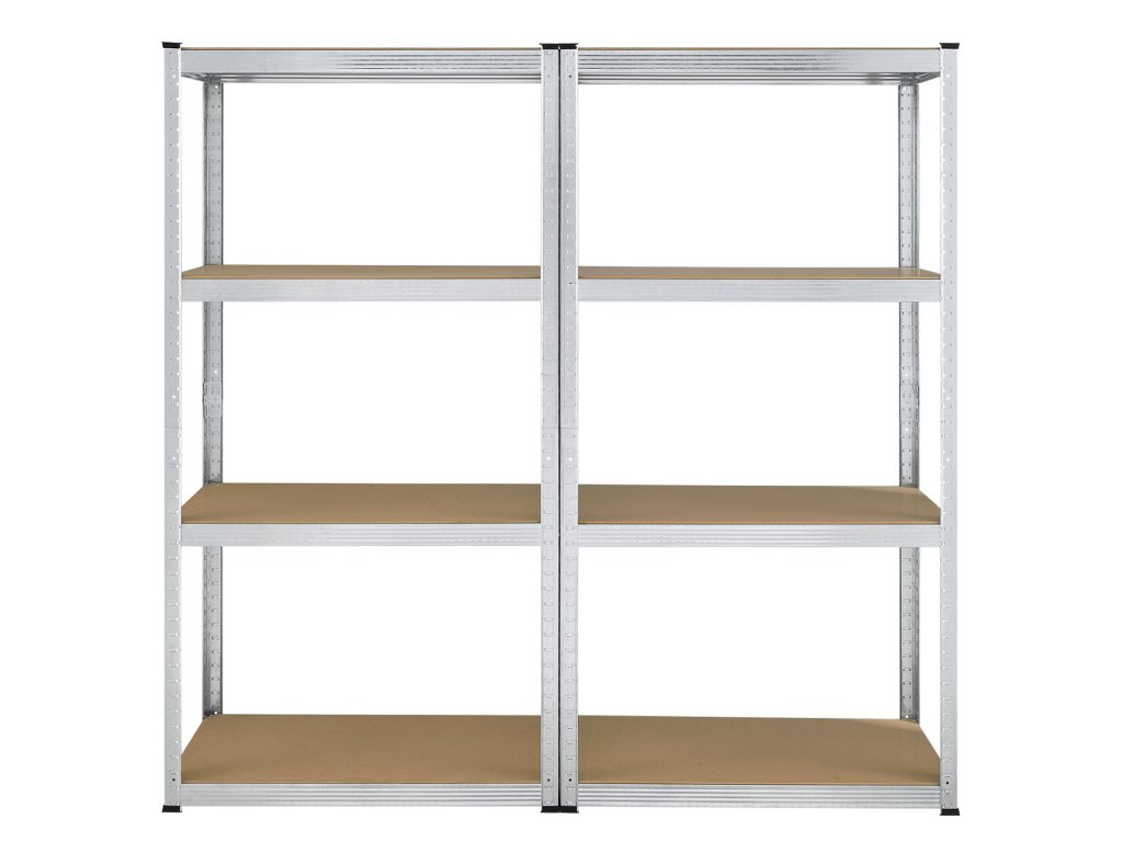 Sada pozostáva z dvoch odolných regálov v rozmere 160 x 80 x 40 cm vyrobených z pozinkovaného kovu. Každý regál má štyri police vyrobené z ekologického MDF dreva s hrúbkou 4 mm a má maximálne zaťaženie 80 kg pri rovnakom rozložení. Maximálna nosnosť dvoch regálov je teda 640 kg. Stabilné police slúžia ako praktický úložný priestor. Ideálne na uskladnenie náradia, záhradných potrieb a iných predmetov. Vďaka šikovnej zásuvnej technológii si úložné regály ľahko zmontujete sami v krátkom čase bez vŕtania alebo skrutkovania. Dodávaných 16 plastových nožičiek chráni vašu podlahovú krytinu pred nevzhľadnými škrabancami. Nohy sú umiestnené na hornej a spodnej strane políc. Zabezpečujú tiež dodatočnú stabilitu.