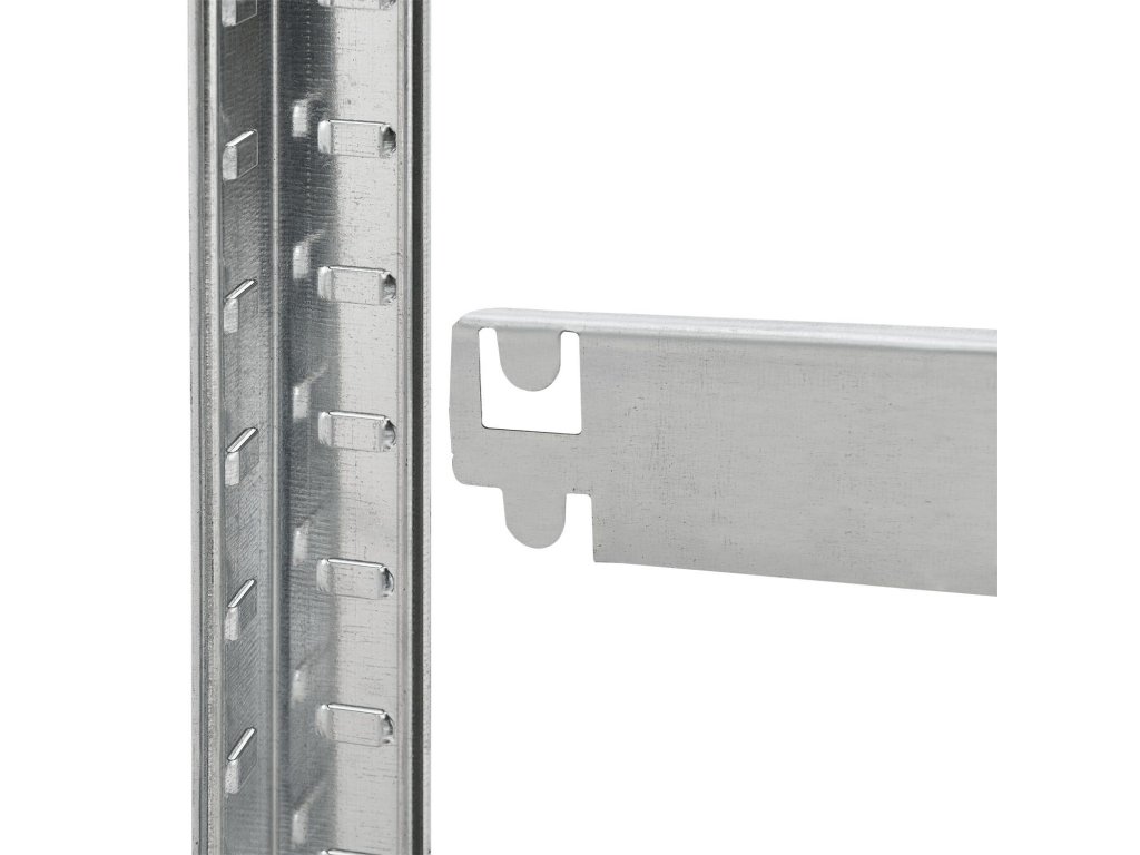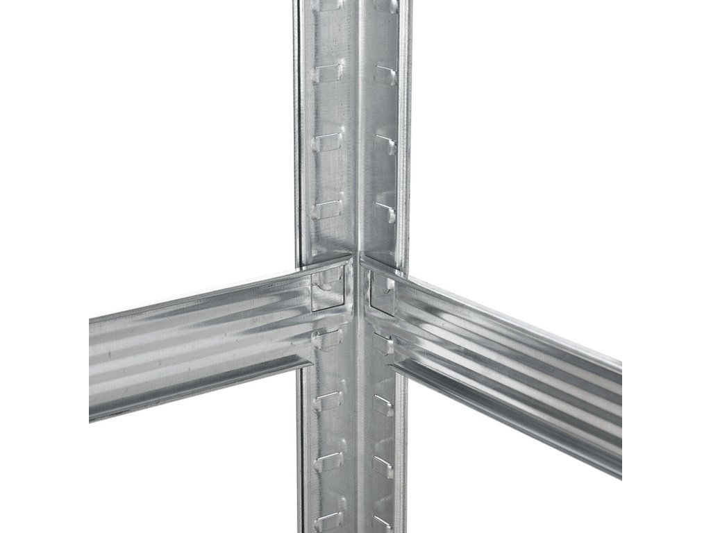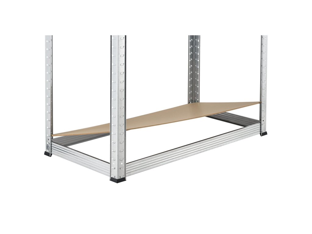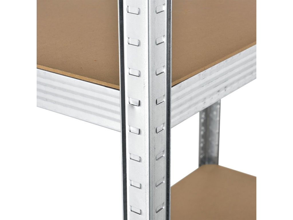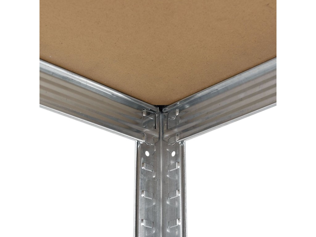 Sada pozostáva z dvoch odolných regálov v rozmere 160 x 80 x 40 cm vyrobených z pozinkovaného kovu. Každý regál má štyri police vyrobené z ekologického MDF dreva s hrúbkou 4 mm a má maximálne zaťaženie 80 kg pri rovnakom rozložení. Maximálna nosnosť dvoch regálov je teda 640 kg. Stabilné police slúžia ako praktický úložný priestor. Ideálne na uskladnenie náradia, záhradných potrieb a iných predmetov. Vďaka šikovnej zásuvnej technológii si úložné regály ľahko zmontujete sami v krátkom čase bez vŕtania alebo skrutkovania. Dodávaných 16 plastových nožičiek chráni vašu podlahovú krytinu pred nevzhľadnými škrabancami. Nohy sú umiestnené na hornej a spodnej strane políc. Zabezpečujú tiež dodatočnú stabilitu.