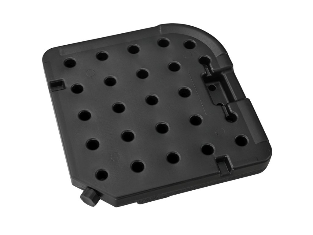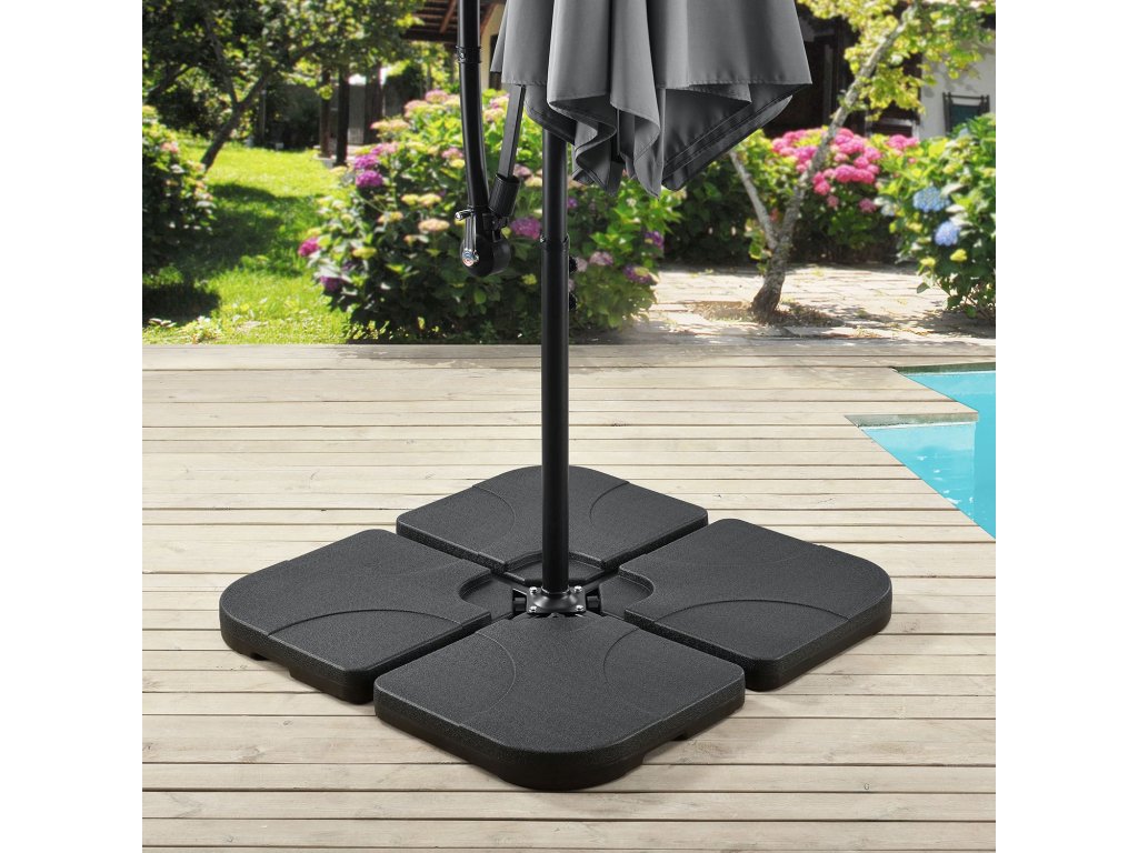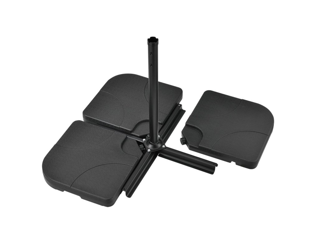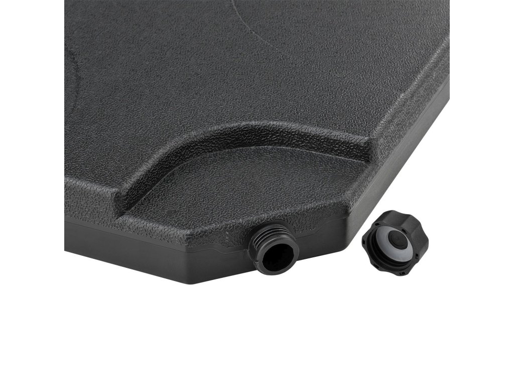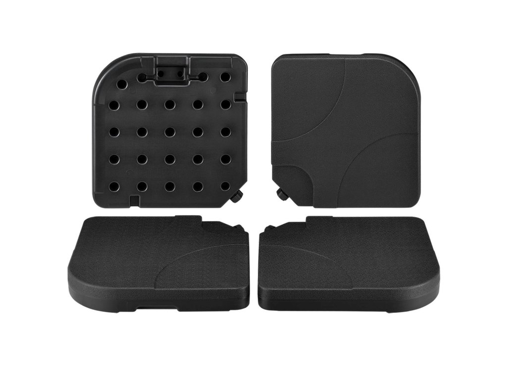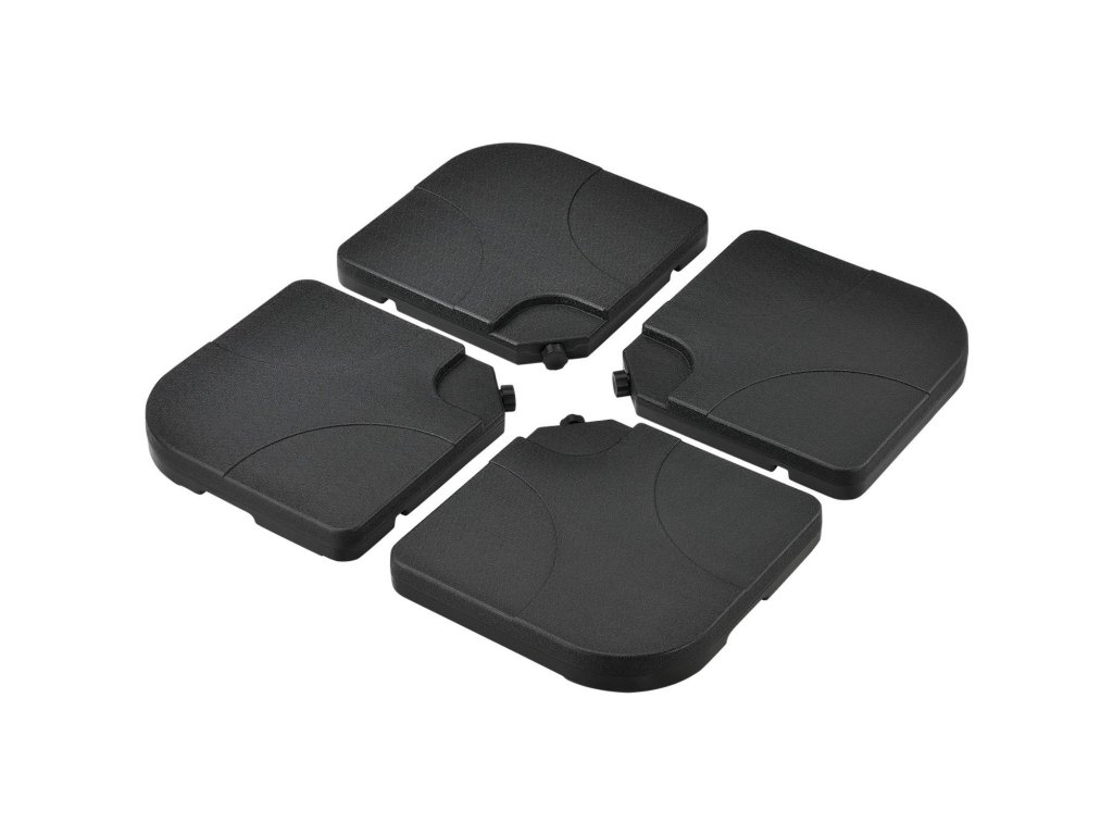 Praktická súprava závažia na slnečníky 4 Quad (čierna) vyrobená z plastu je dokonalým doplnkom stojanov na slnečníky s krížovou základňou. Závažia, ktoré možno naplniť pieskom a vodou, zaisťujú váš slnečník proti náhodnému prevráteniu. Odolné voči poveternostným vplyvom a UV žiareniu. Štyri závažia sú vyrobené z odolného HDPE plastu. Pevný propylén je široko používaný plast a zachováva si svoj tvar aj vo veľkých objemových jednotkách. Odoláva aj dažďu, mínusovým teplotám a intenzívnemu slnečnému žiareniu. Závažie s rozmermi 50 × 50 cm je zvnútra duté a cez otvor sa dá jednoducho naplniť pieskom alebo vodou. Každý prvok má plniacu kapacitu 15 l alebo 20 kg. Závažie slnečníka teda naplníte až 60 litrami alebo 80 kilogramami. Bez plniva sú závažia veľmi ľahké. Štyri závažia možno pohodlne prenášať a zložiť pomocou integrovaných zapustených úchytov. Zaoblené hrany a 7,5 cm plochý dizajn zvyšujú bezpečnosť a znižujú riziko zranenia.